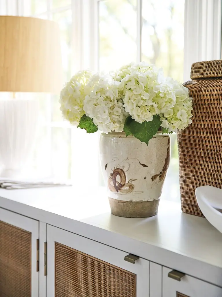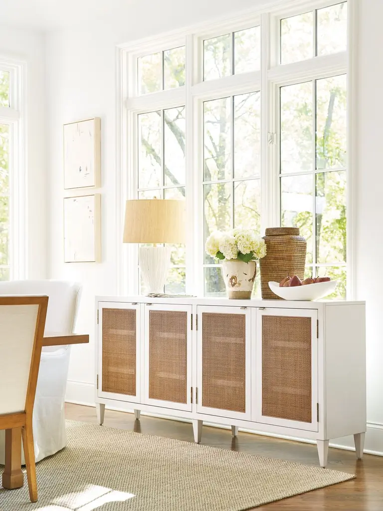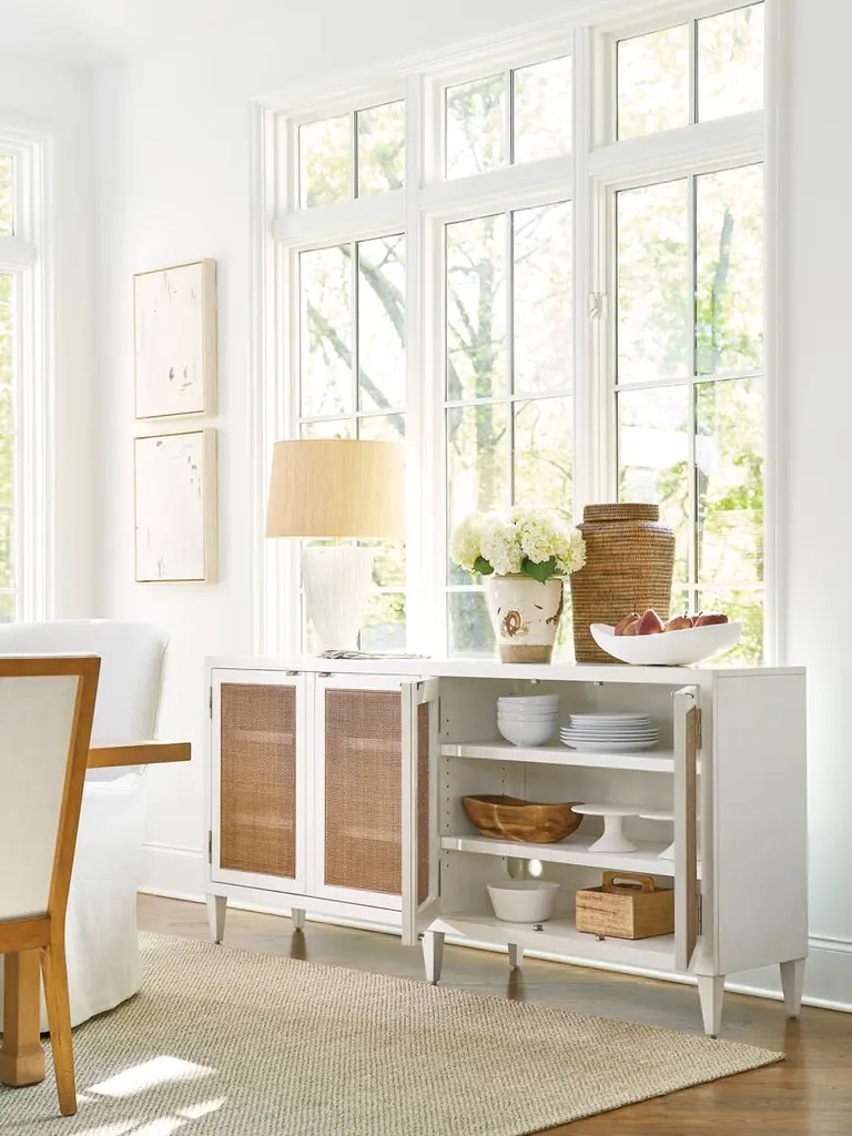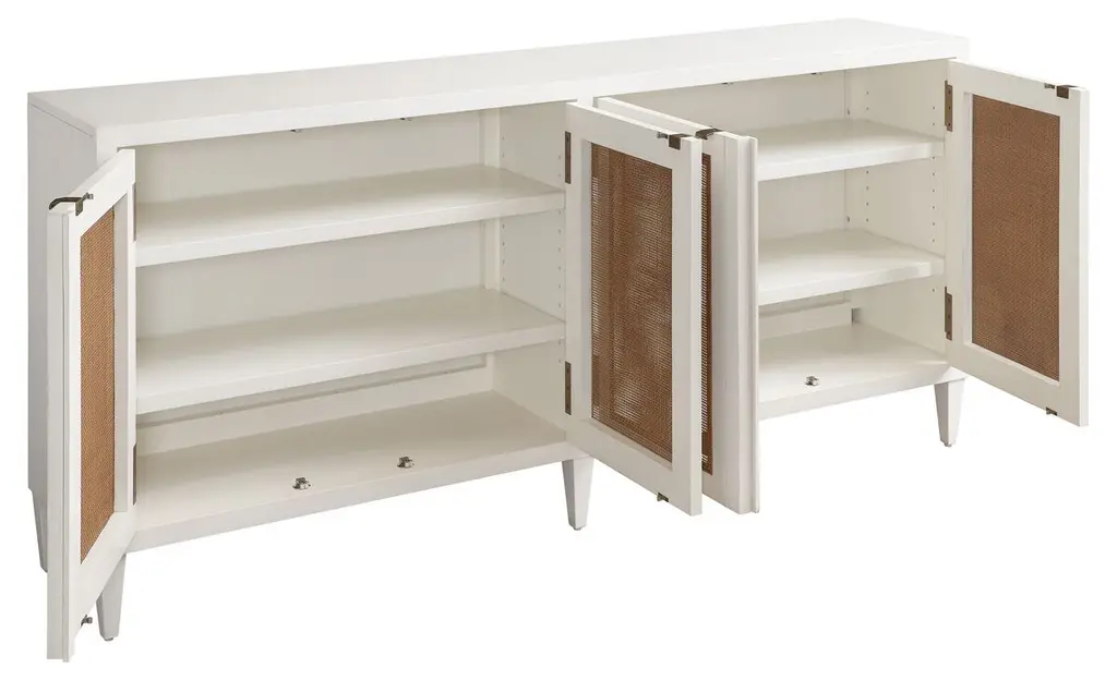 Designed by Barclay Buttera, this storage console brings beachy elegance to a room. The woven cane door inserts offer a warm contrast to the wood frame's white finish. Behind each pair of doors are two adjustable shelves and cutouts for cord management.