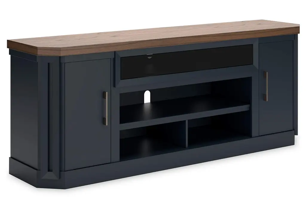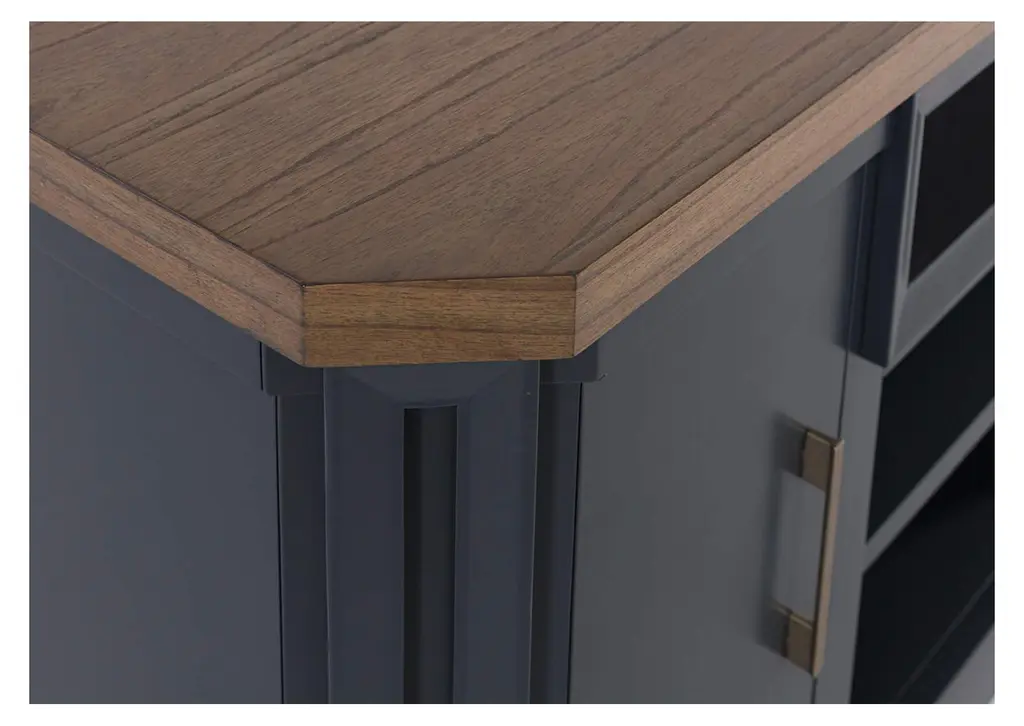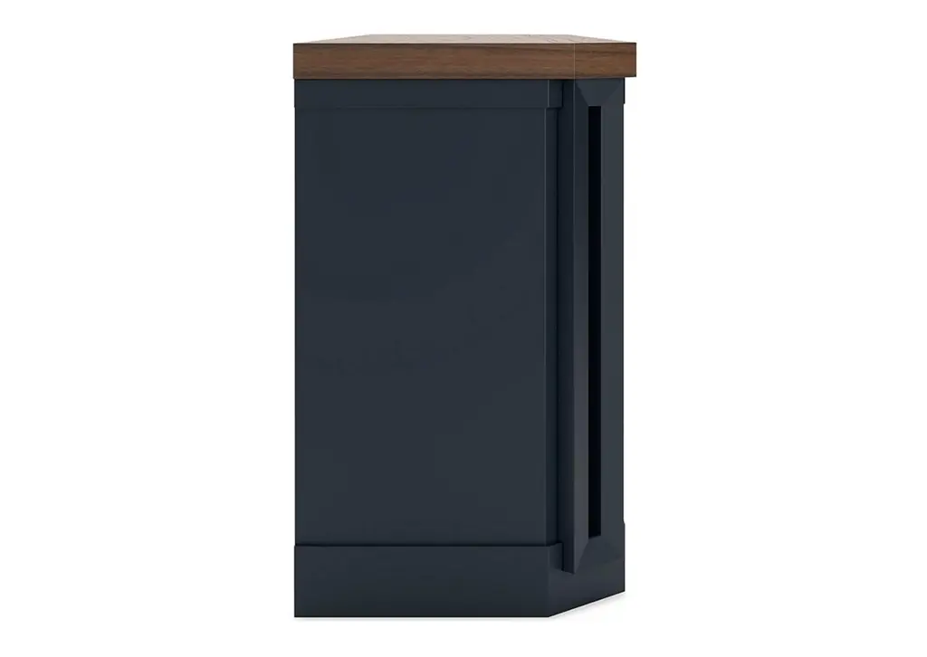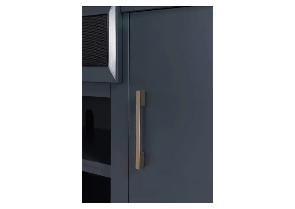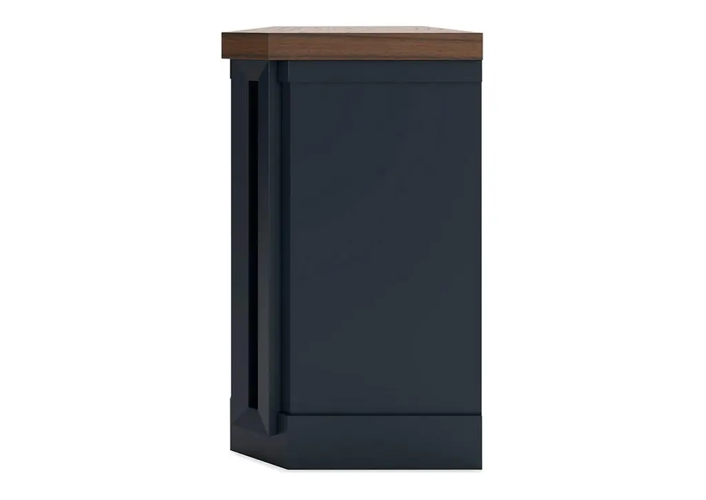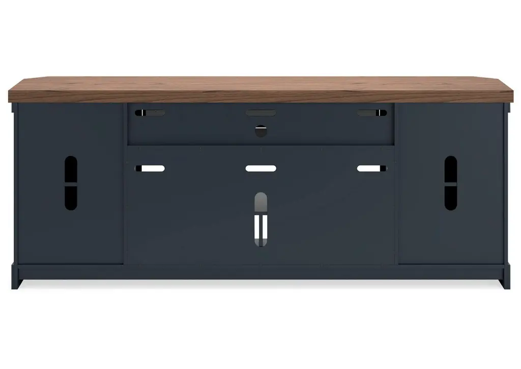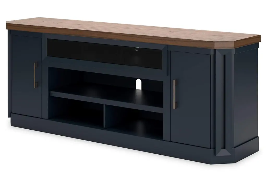 The Landocken TV stand combines casual contemporary design with modern appeal. Its combination of a thick-bodied wood-tone top with a slate blue cabinet is a smart choice on so many levels. Stow away electronics in the roomy cabinets, and use the upper shelf to conceal a soundbar speaker for a clean integrated look. Enhancing the experience: the optional fireplace insert (sold separately) brings a touch of warmth and beautiful ambiance to your living room. Weight 211.000 lbs. (94.95kgs.)