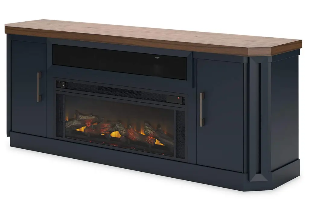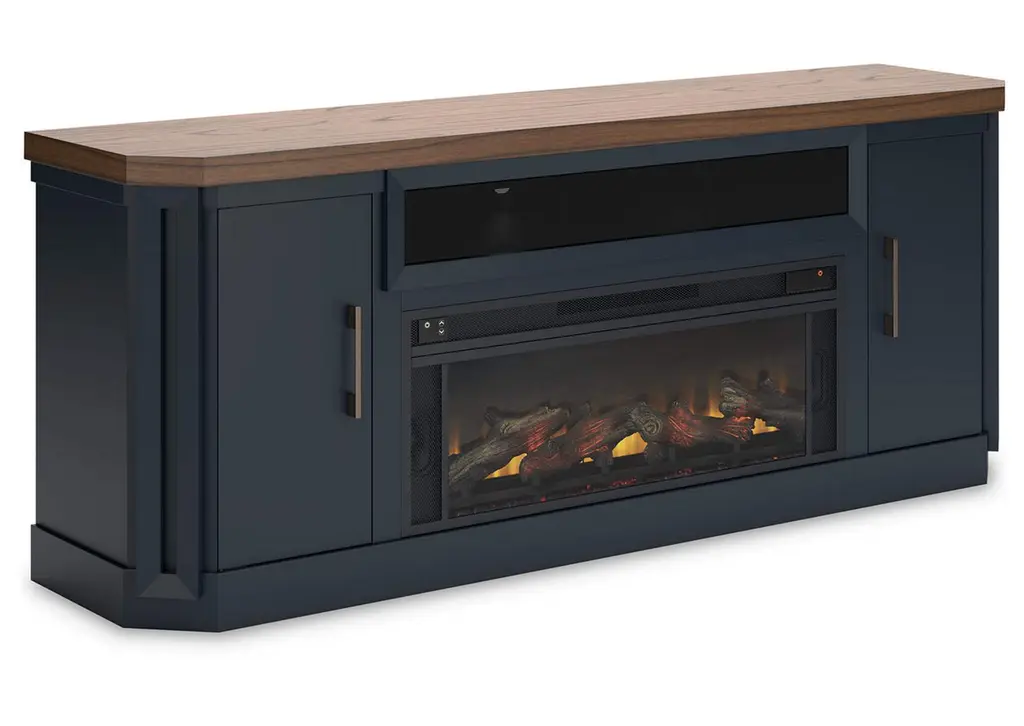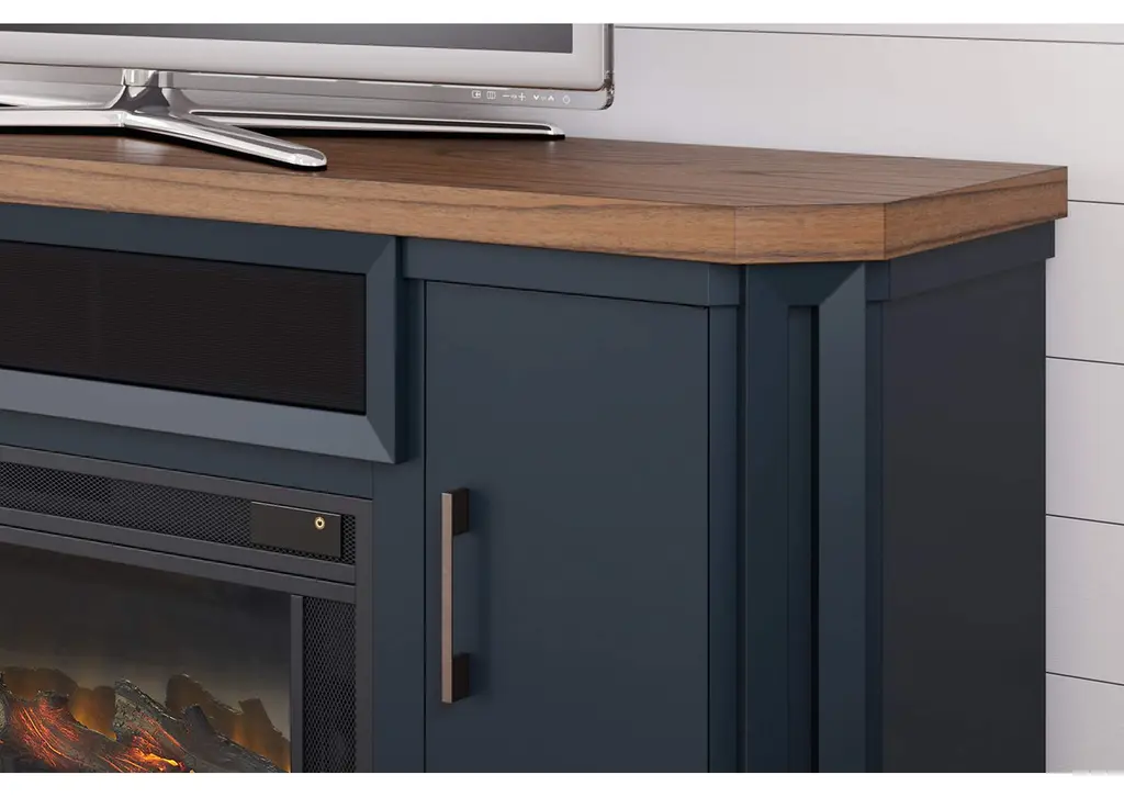 This TV stand combines casual contemporary design with modern appeal. Its combination of a thick-bodied wood-tone top with a slate blue cabinet is a smart choice on so many levels. Stow away electronics in the roomy cabinets, and use the upper shelf to conceal a soundbar speaker for a clean, integrated look. Adding a touch of romance to the scene, the fireplace insert brings warmth and beautiful ambiance to your living room. With the touch of a button, adjust the temperature and the flame brightness, and connect your device to the built-in wireless speakers. The flame effect includes a realistic-looking log set with glowing embers, along with an ambient down light. Weight 267.000 lbs. (120.15kgs.)