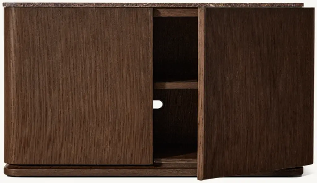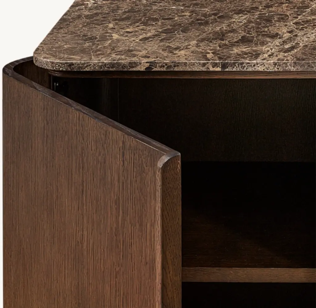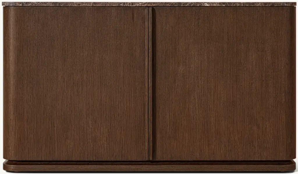 Designed by Julie Lawrence of Roanoke, Virginia, Ligné is handcrafted of American white oak and richly veined marble, each corner wrapped with elegant radius curves. A wire-brushed finish highlights the wood's natural grain, while a slender plinth and integrated oak hardware enhance the understated architectural profile. SHOP THE ENTIRE COLLECTION