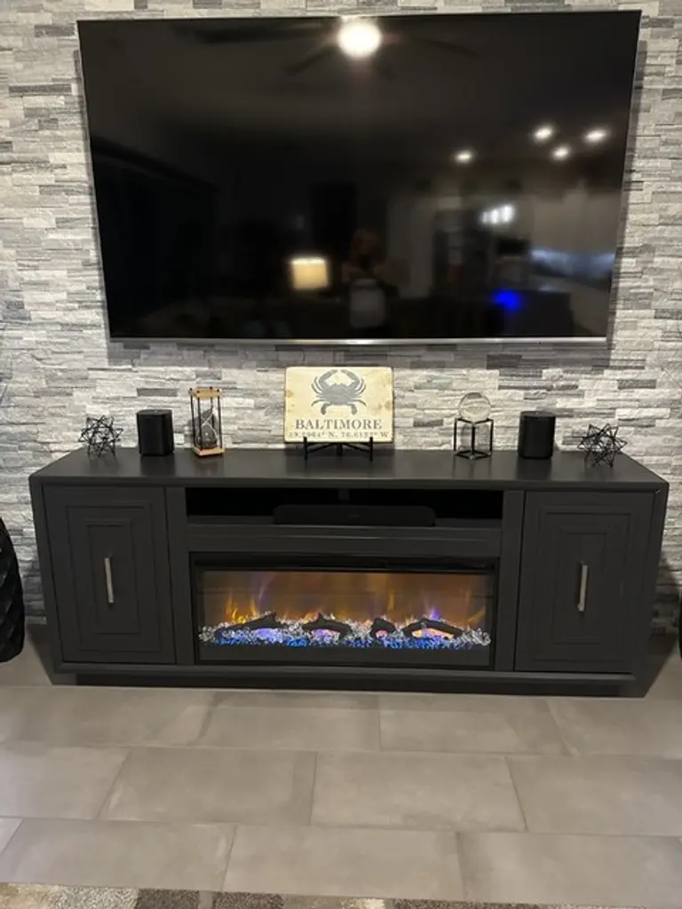 Set the mood and turn up the heat with our Linette fireplace console – a design that allows you to enjoy all the perks of having a fireplace without the stress, expense or inconvenience. A 42" fireplace insert produces ambient flame-like lighting that you can use with the included clear fire glass crystals or traditional logs to create your desired look. The fan-forced heater even offers multiple settings for providing the perfect temperature. The focal point of your space, this piece also fits a TV up to 96" and includes cord management cutouts to minimize wire clutter.