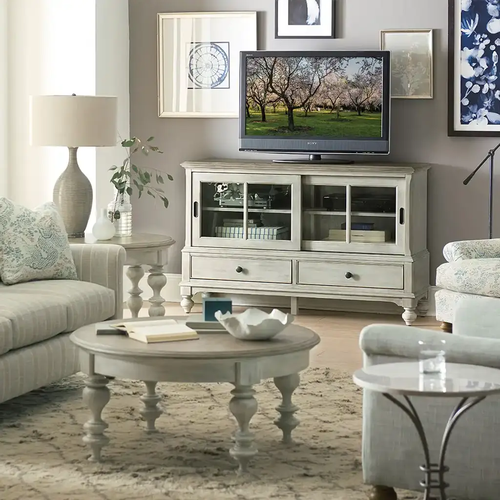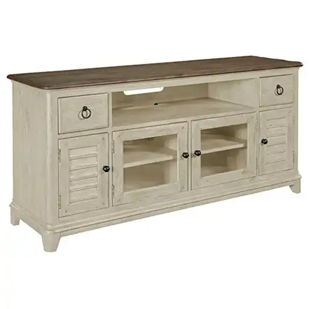 The Litchfield Ludlow Entertainment Console is a perfect blend of style and functionality, designed to accommodate a 60" TV. Crafted with meticulous attention to detail, it features charming turned feet, elegant chamfered pilasters, and practical sliding doors and drawers, offering ample storage space. The sun-washed finish and driftwood top provide a warm, inviting look that seamlessly integrates into any living space. This console not only enhances your entertainment experience but also adds a touch of classic elegance to your home decor.