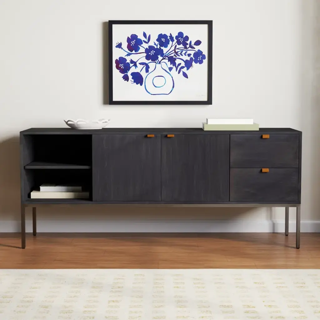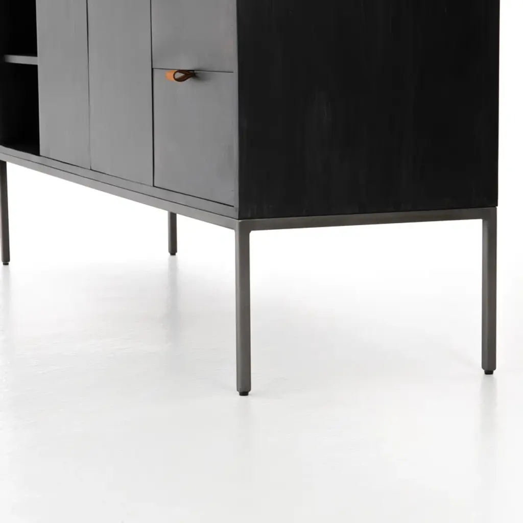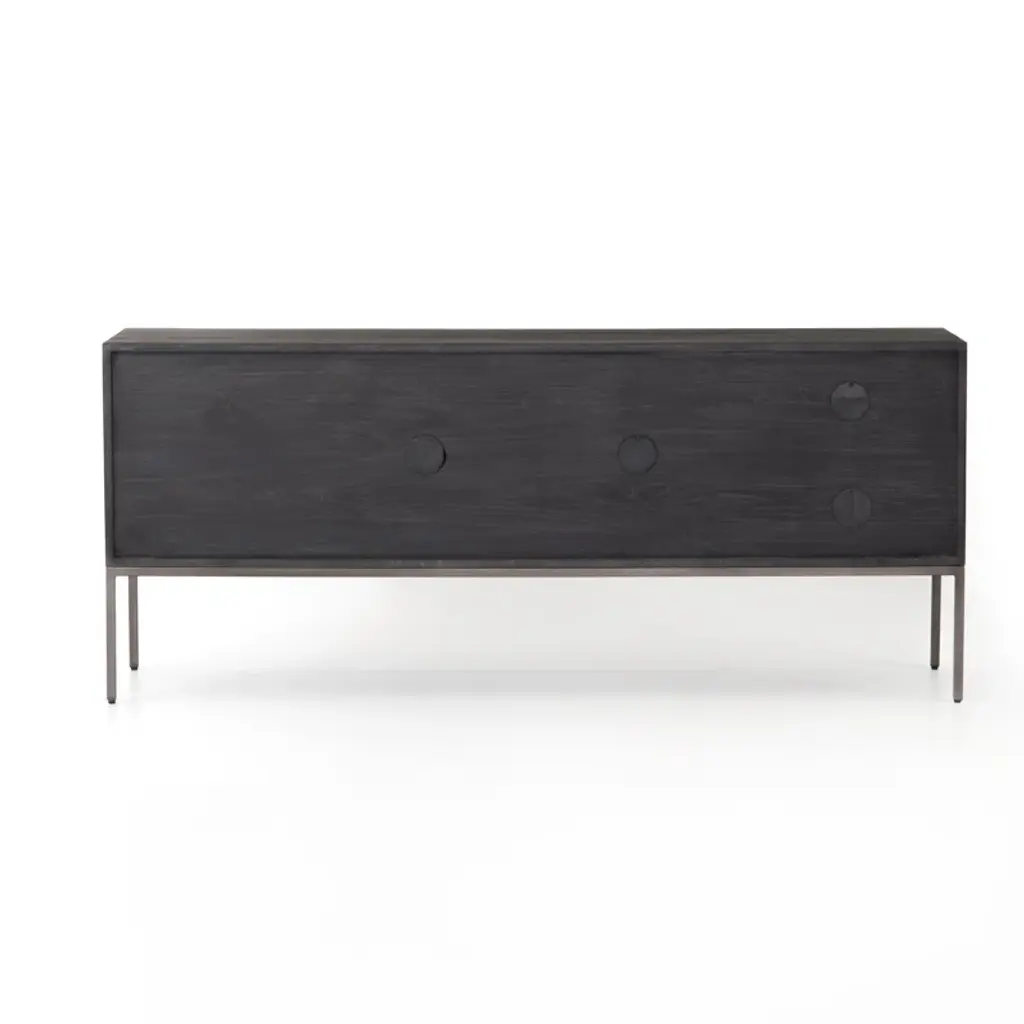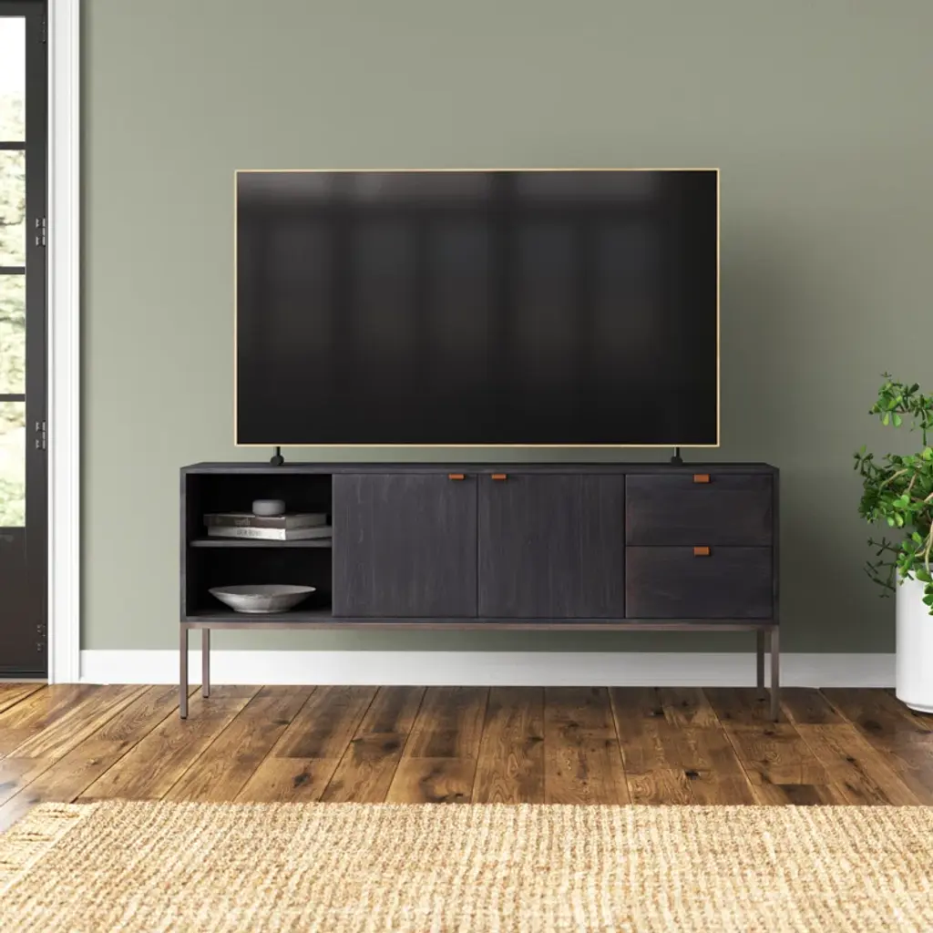 This American-made, solid wood and iron TV stand embodies modern and transitional design. Ample storage space is provided with cabinets, drawers, and shelving. Enjoy the functionality and sophistication this stylish entertainment center will bring to your home.