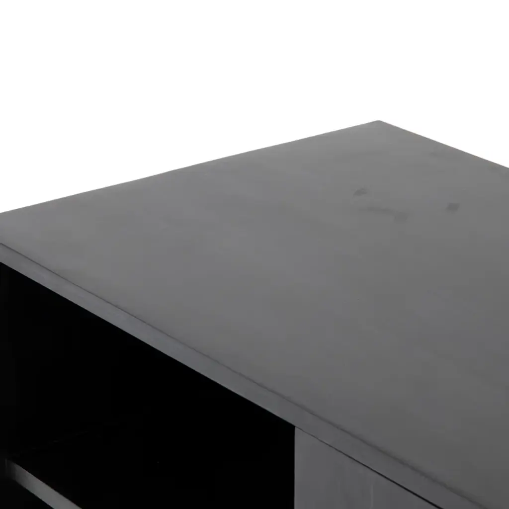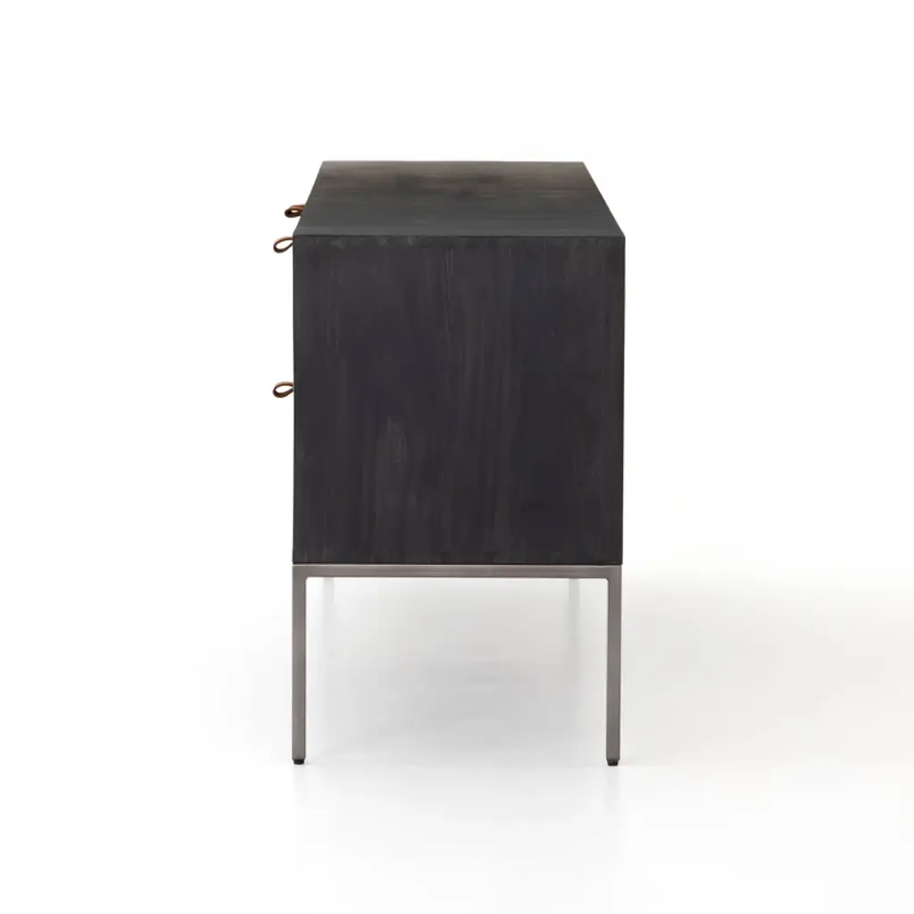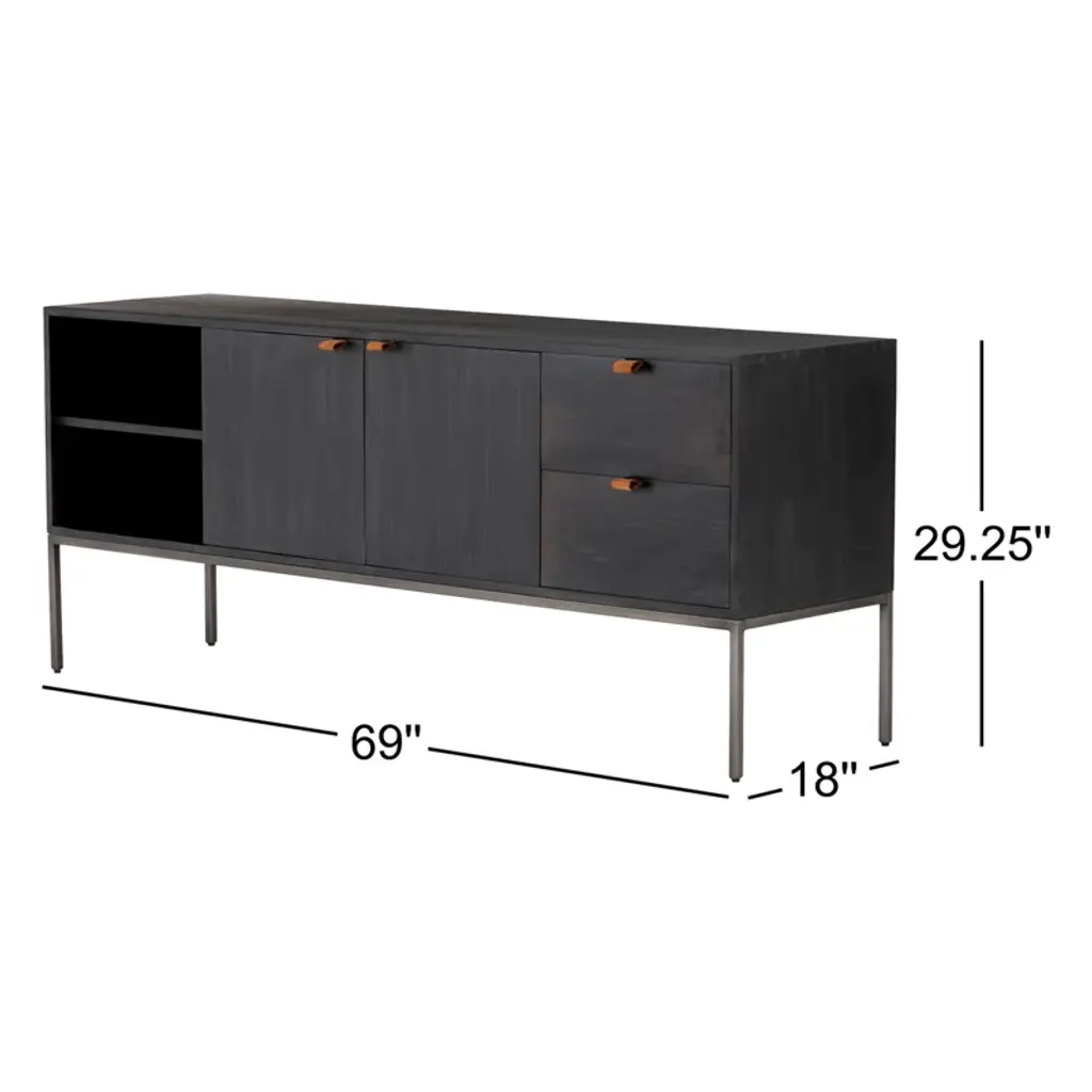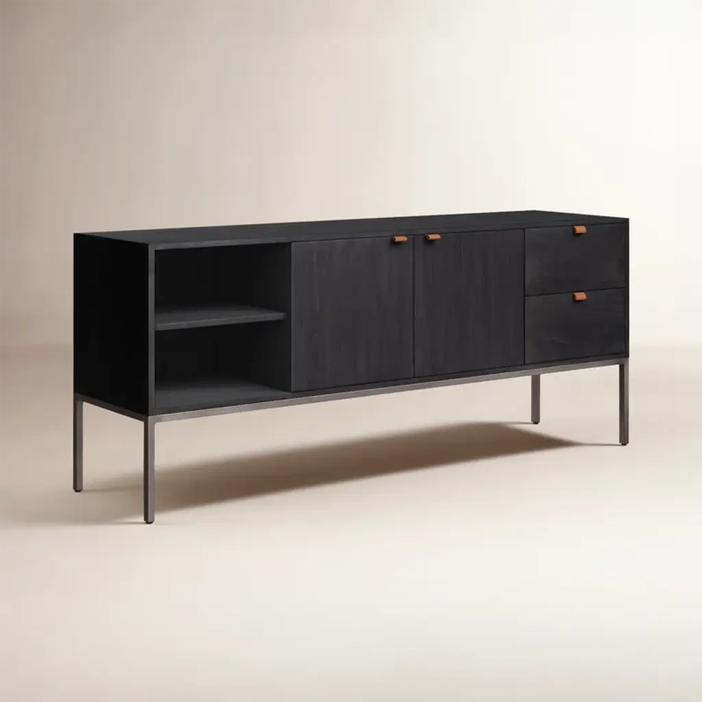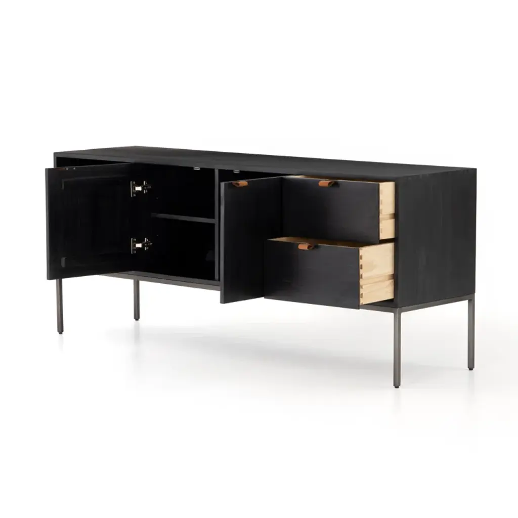 This American-made, solid wood and iron TV stand embodies modern and transitional design. Ample storage space is provided with cabinets, drawers, and shelving. Enjoy the functionality and sophistication this stylish entertainment center will bring to your home.