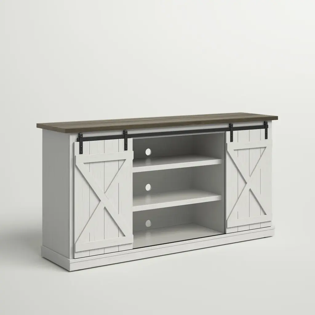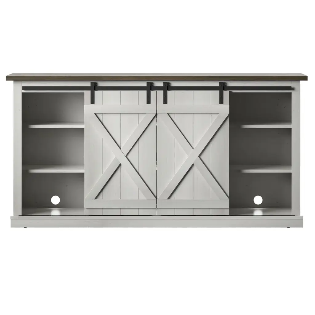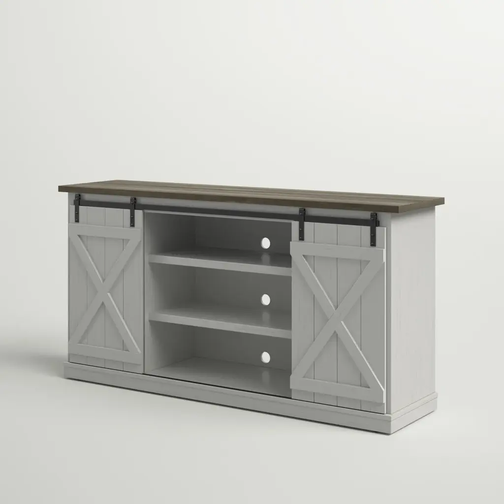 About This Product This TV stand has a charming, rustic aesthetic and provides any room with plenty of storage for your entertaining essentials. The clean-lined frame is built from engineered wood with a distinctive array of finishes. We love how the sliding barn doors add a classic farmhouse feel to your space, with metal hardware for additional contrast. Numerous shelves give you places to display your favorite decorative objects and store media players, games, books, and more. Plus, a cable management cutout on the back keeps your cords corralled. This media console fits TVs up to 70''. Features Holds up to 70 lbs. Barn-style doors that glide along metal rail hardware Can be used in the living room as a TV stand, in the dining room as a sideboard, or elsewhere for display and storage Two adjustable center shelves and two adjustable shelves within each side cabinet Planked top for added charm Back panel cutouts for effortless cord management Wall anchor included
