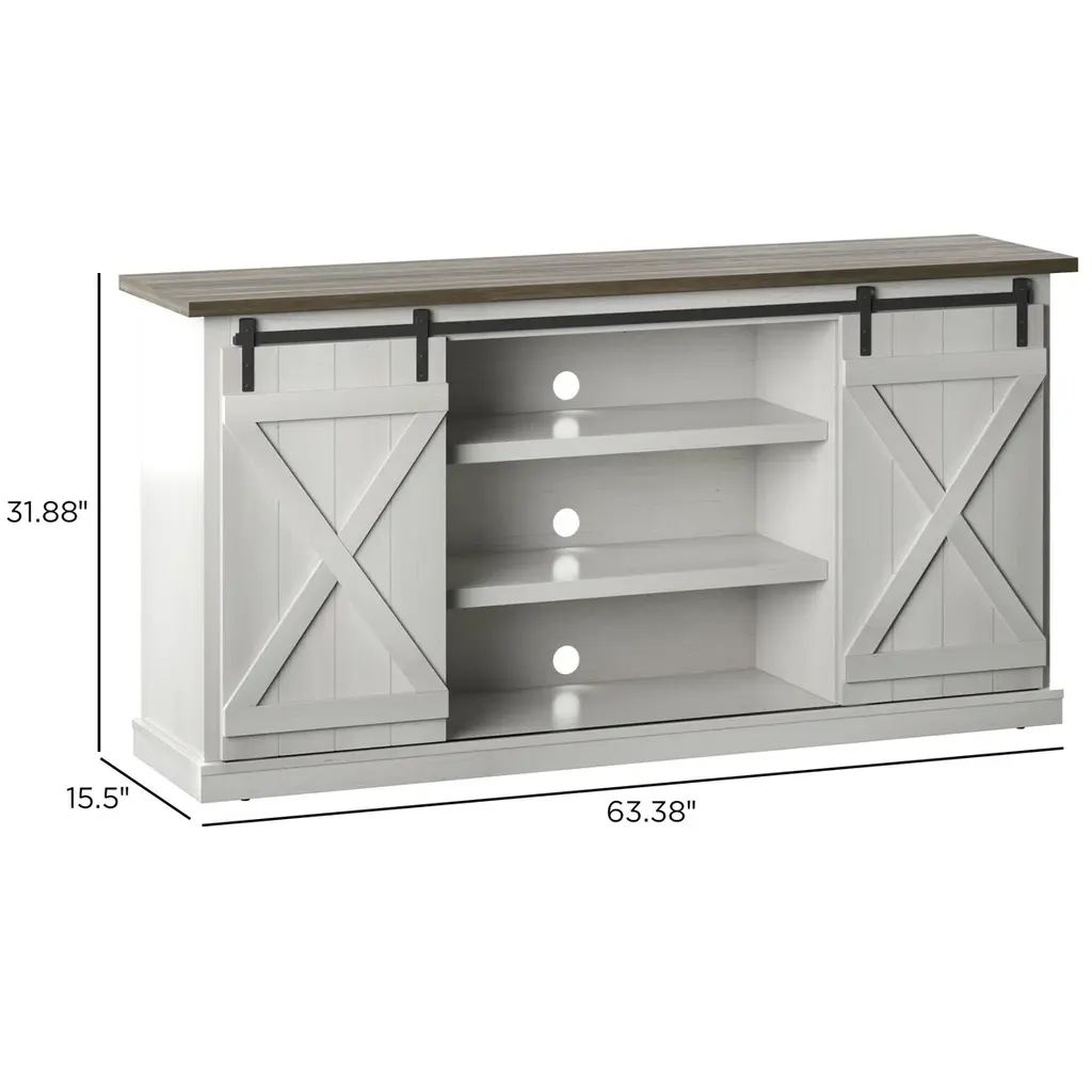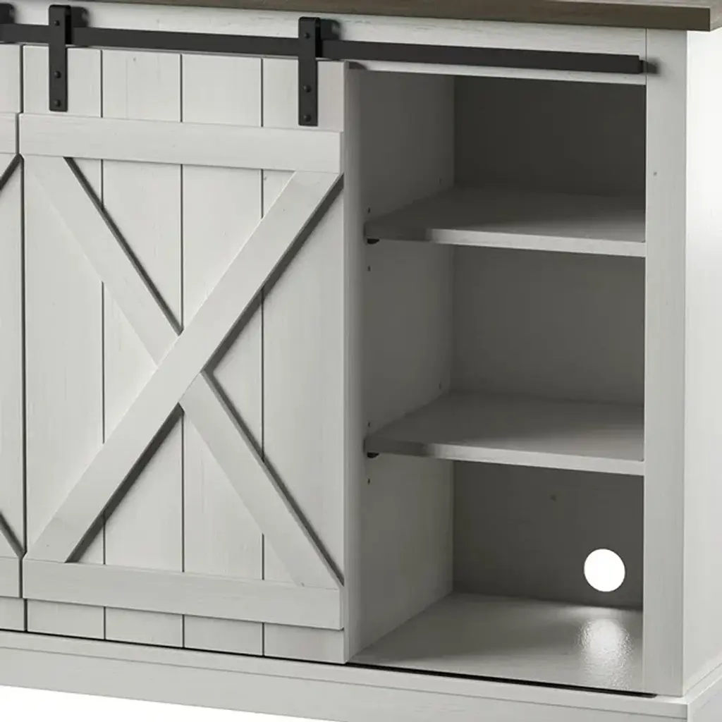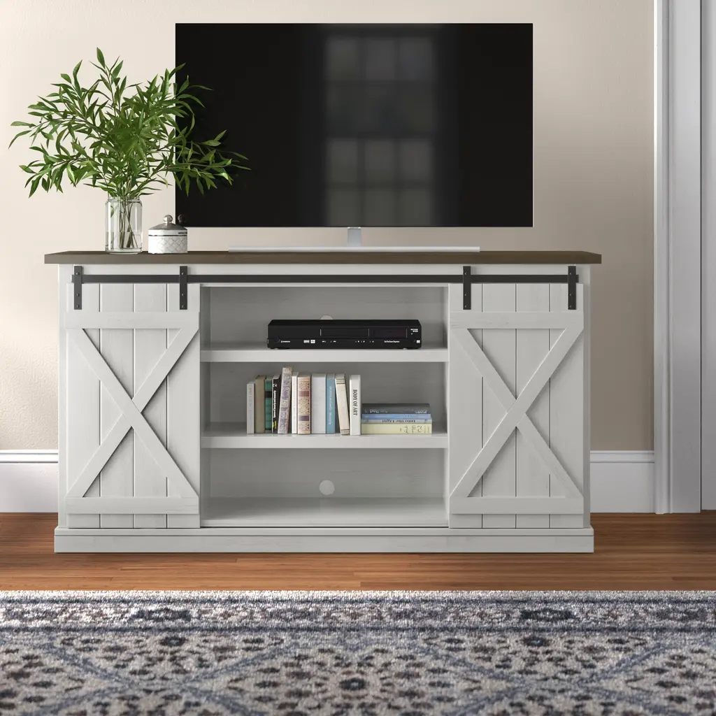 About This Product This TV stand has a charming, rustic aesthetic and provides any room with plenty of storage for your entertaining essentials. The clean-lined frame is built from engineered wood with a distinctive array of finishes. We love how the sliding barn doors add a classic farmhouse feel to your space, with metal hardware for additional contrast. Numerous shelves give you places to display your favorite decorative objects and store media players, games, books, and more. Plus, a cable management cutout on the back keeps your cords corralled. This media console fits TVs up to 70''. Features Holds up to 70 lbs. Barn-style doors that glide along metal rail hardware Can be used in the living room as a TV stand, in the dining room as a sideboard, or elsewhere for display and storage Two adjustable center shelves and two adjustable shelves within each side cabinet Planked top for added charm Back panel cutouts for effortless cord management Wall anchor included