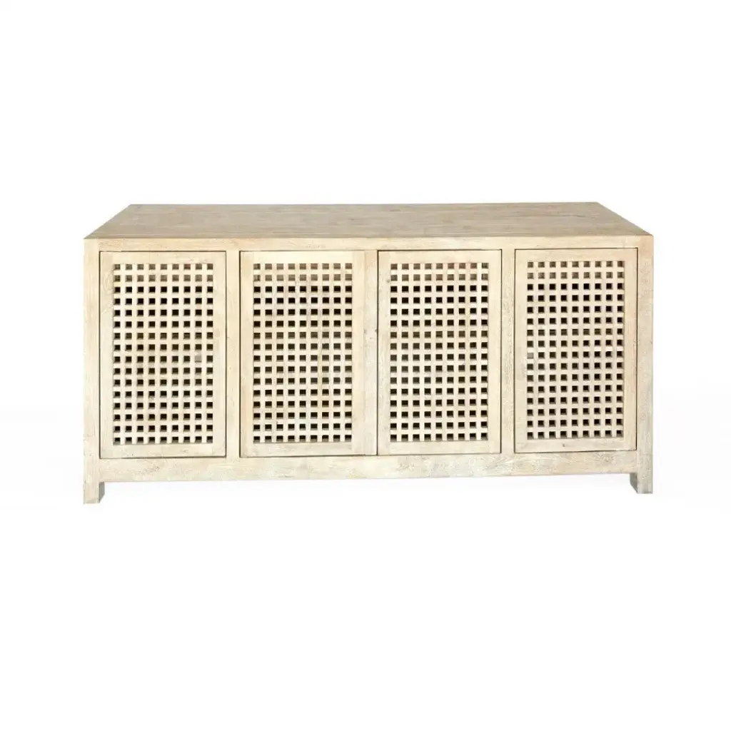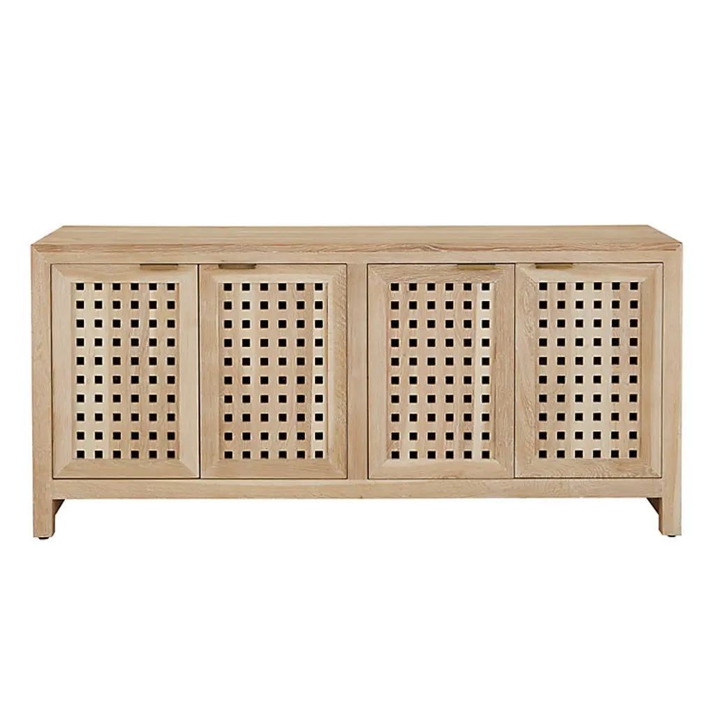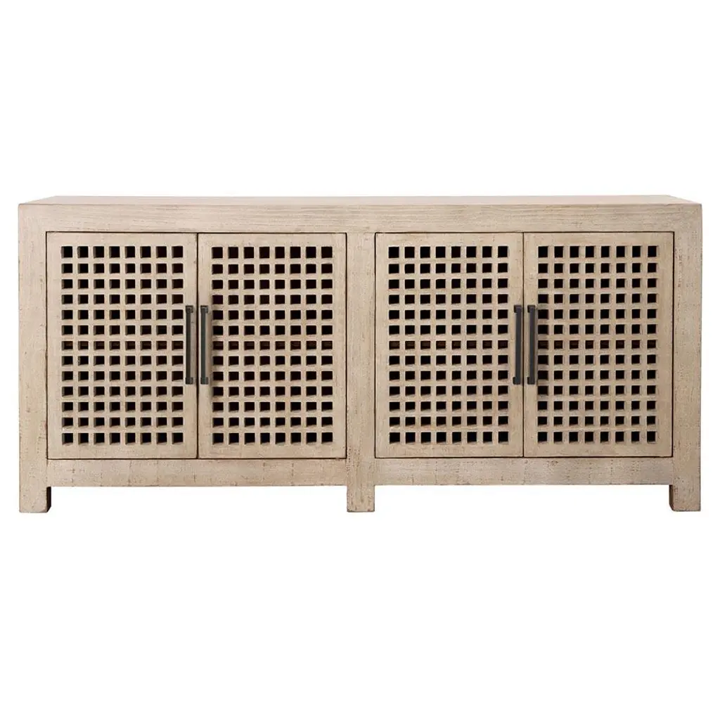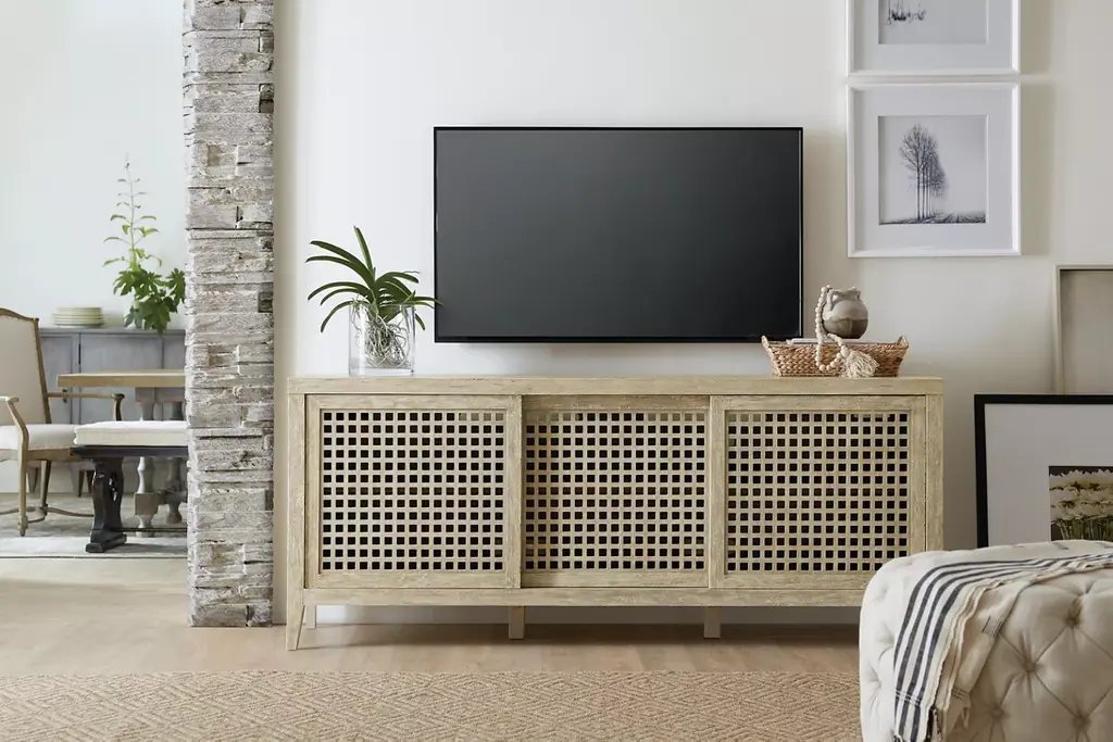 With a romantic, French cottage chic appeal, the Lucy entertainment console is sure to be the star in your family room. This entertainment console has a taupe finish with distressing and features airy, perforated doors. Crafted with poplar and hardwood solids with maple veneers, the console has three sliding doors with one adjustable shelf behind each door. There is also a three-plug outlet and a ventilated back panel.
