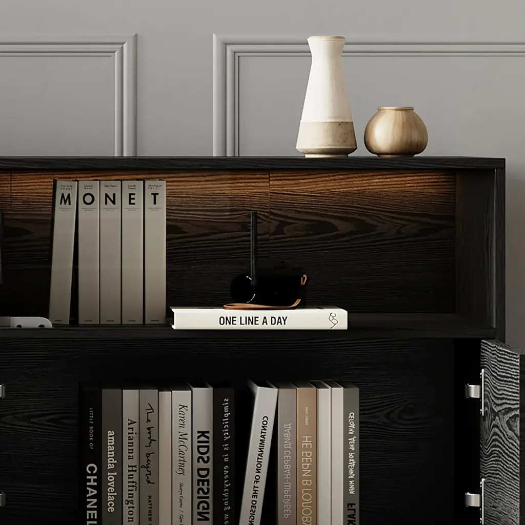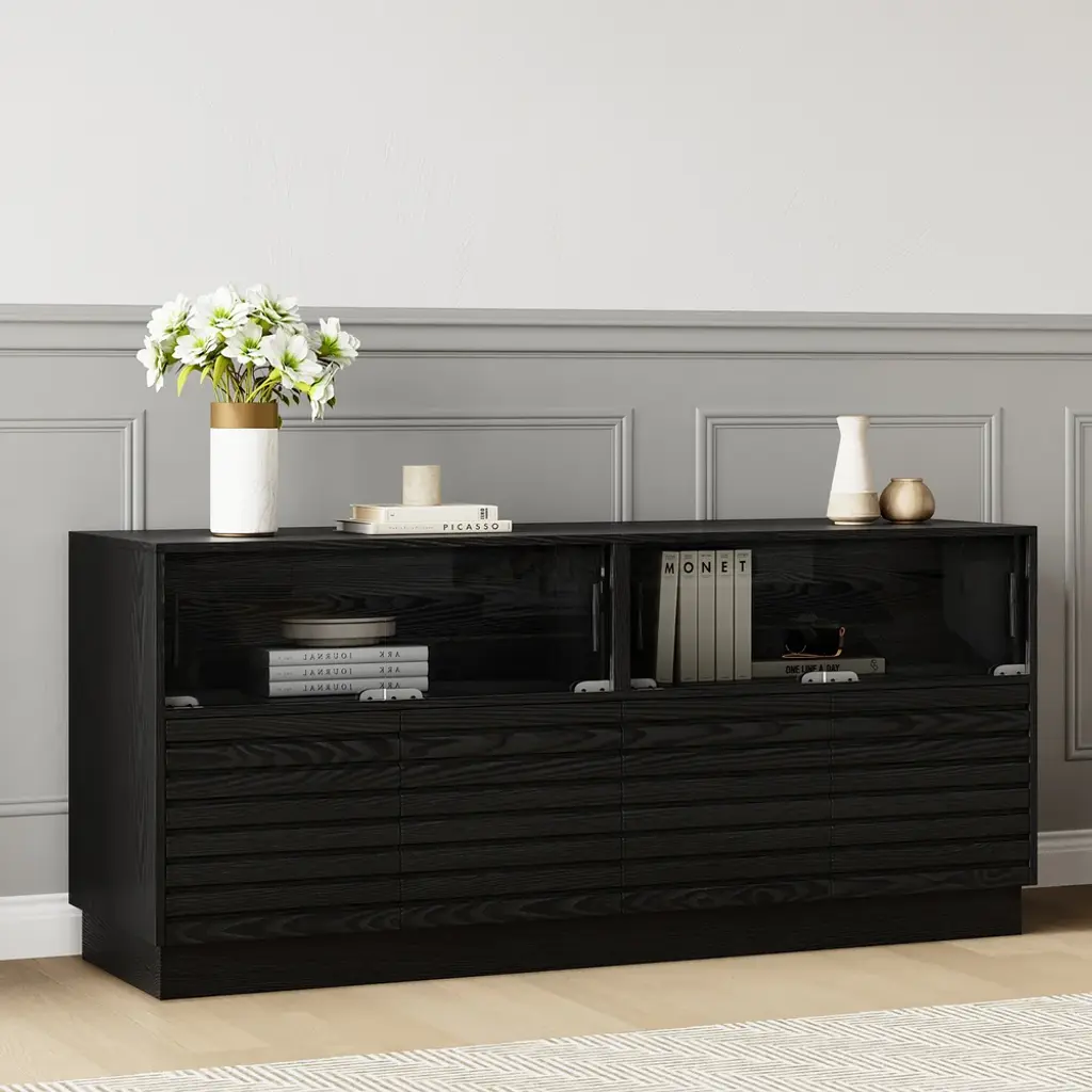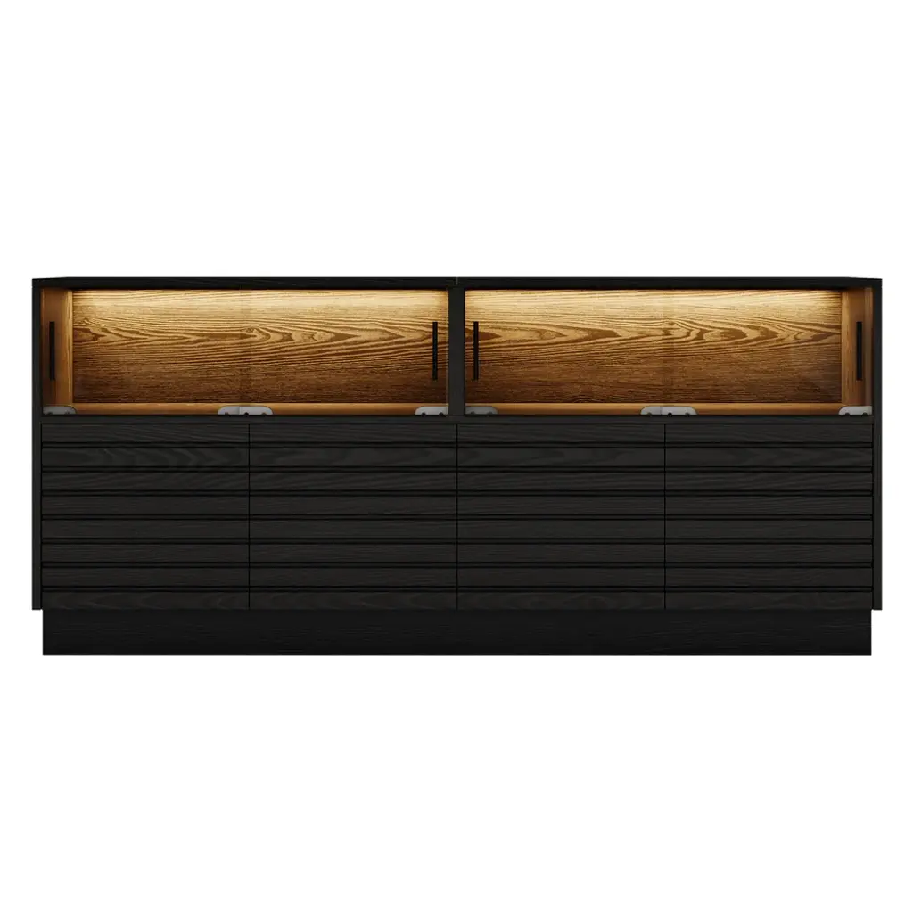 This modern black TV stand features integrated LED lighting and sleek acrylic panels, creating a striking visual centerpiece for contemporary spaces. Its spacious design combines ambient illumination with functional organization.