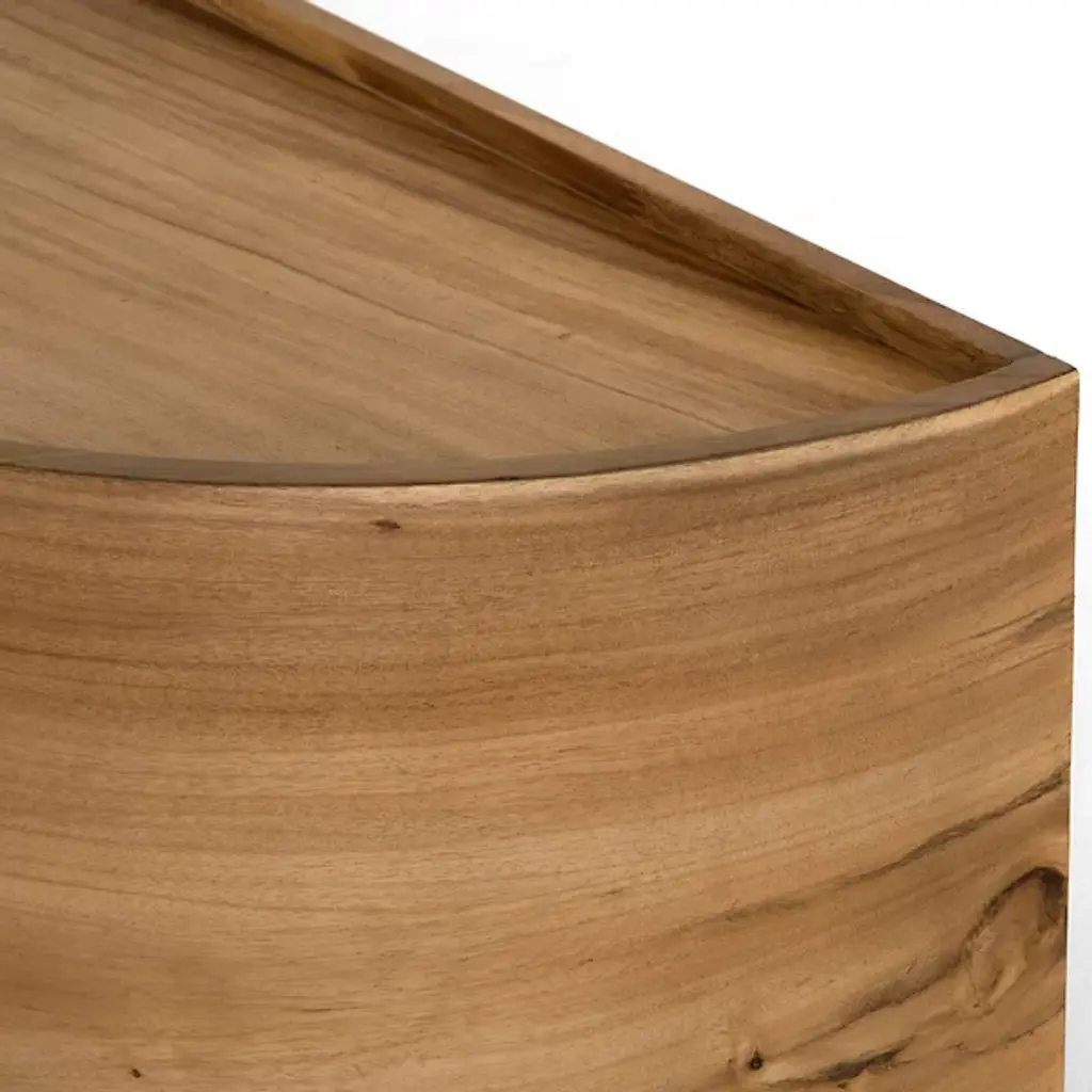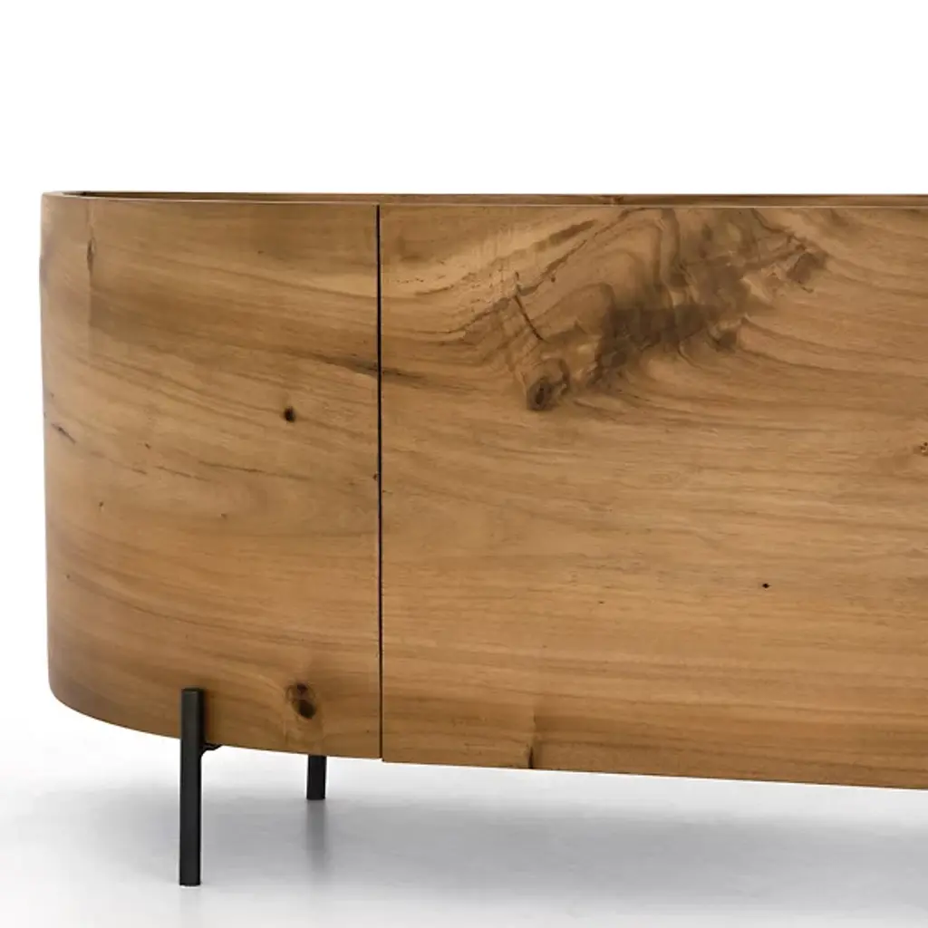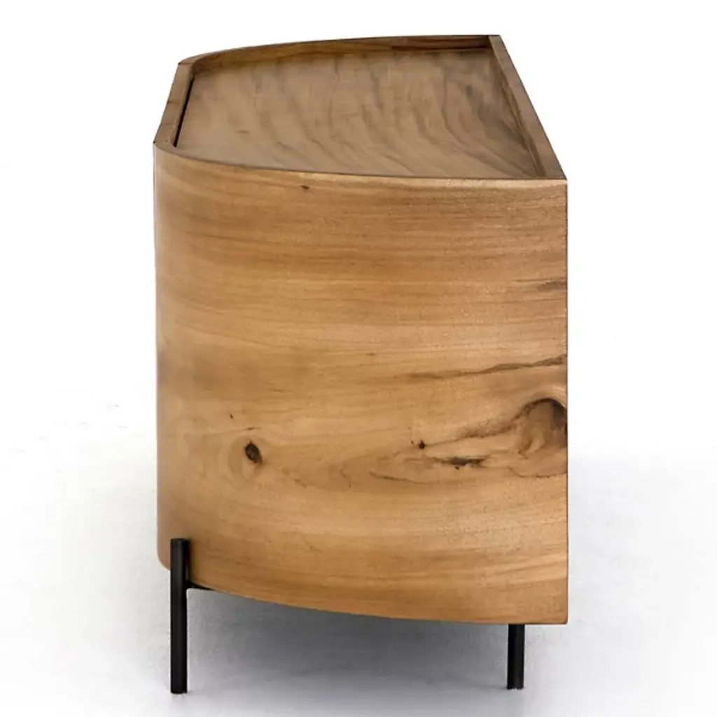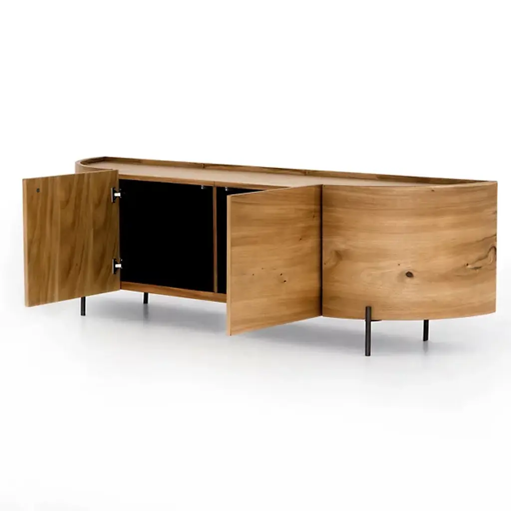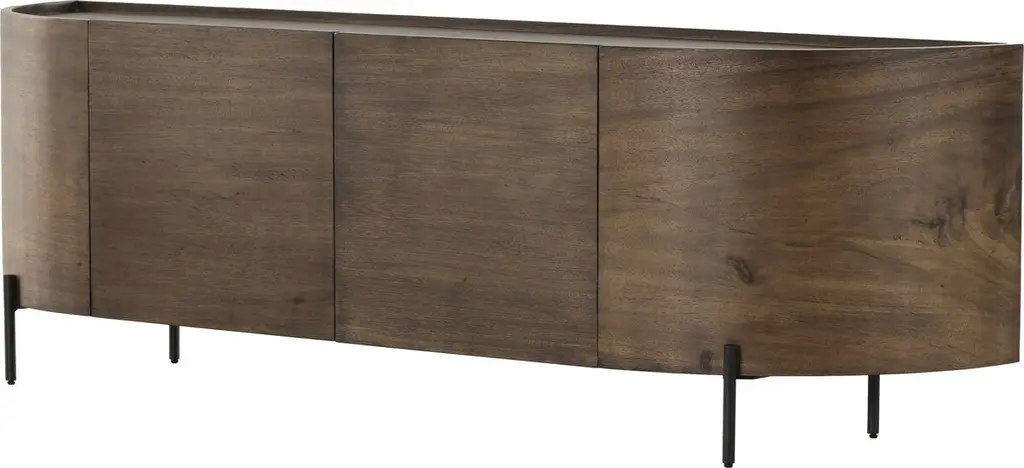 The Lunas Media Console from Four Hands offers a curving, cleverly sculpted silhouette made with a warm, vibrant Guanacaste veneer and engineered hardwood, highlighting its natural high and lowlights. Crafted in made in Mexico and inspired by classic jewelry settings, it features an inset top, two fixed shelves, and cord management cutouts for easy accessory organization. Soft-closing magnetic doors add quiet functionality, while iron legs elevate the console and add an airy, inspired note to its sophisticated style.