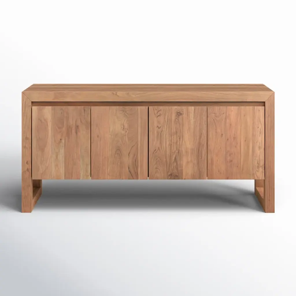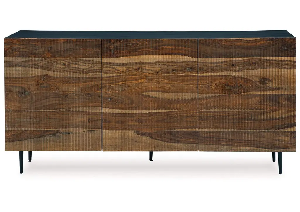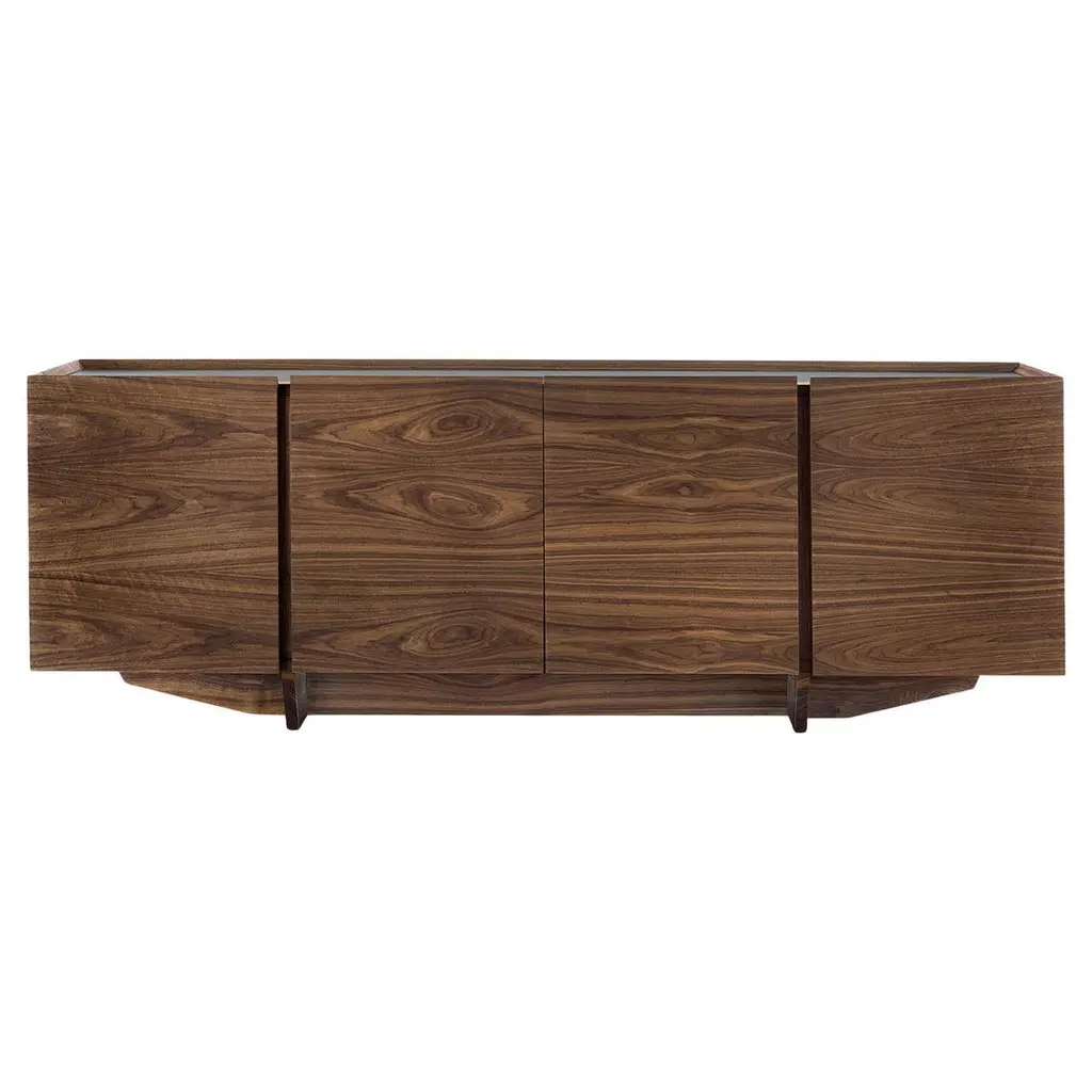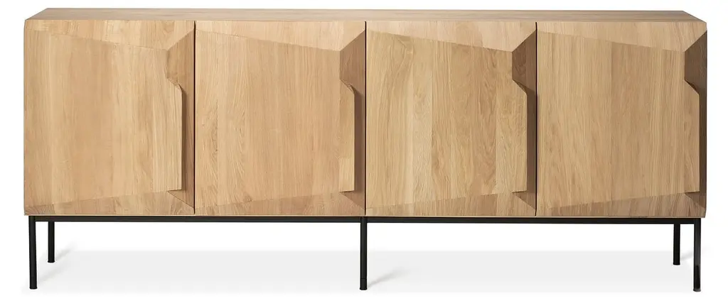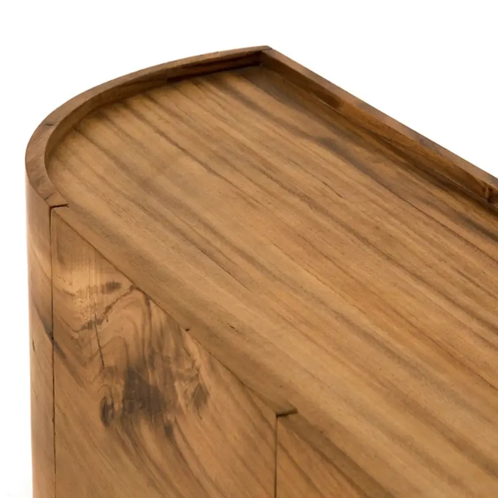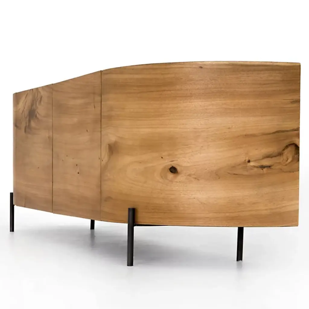 The Lunas Media Console from Four Hands offers a curving, cleverly sculpted silhouette made with a warm, vibrant Guanacaste veneer and engineered hardwood, highlighting its natural high and lowlights. Crafted in made in Mexico and inspired by classic jewelry settings, it features an inset top, two fixed shelves, and cord management cutouts for easy accessory organization. Soft-closing magnetic doors add quiet functionality, while iron legs elevate the console and add an airy, inspired note to its sophisticated style.