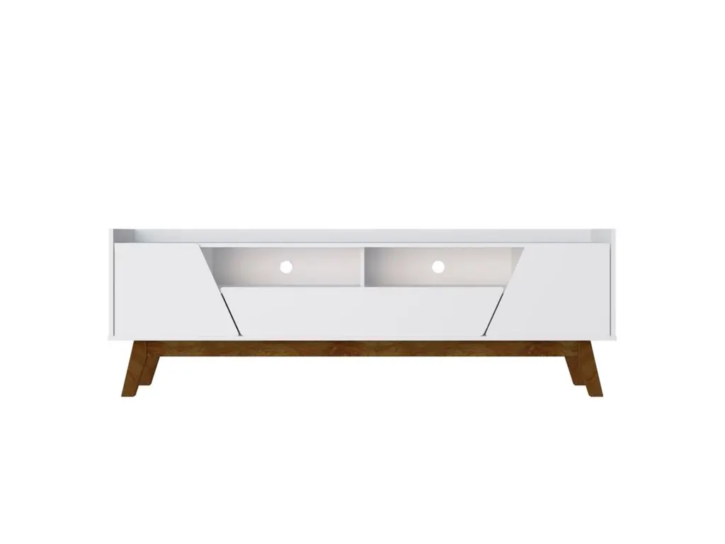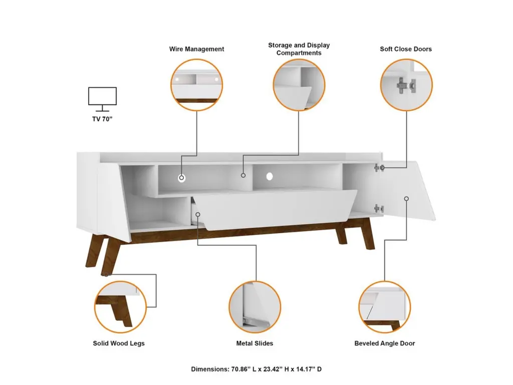 Elevate your living room or bedroom with our charming mid-century modern Marcus Freestanding TV Stand. Crafted with love, it combines style and functionality effortlessly. With soft-close doors, a cable management system, and solid pine wood legs, this stand sets the stage for cozy movie nights and sweet moments together.