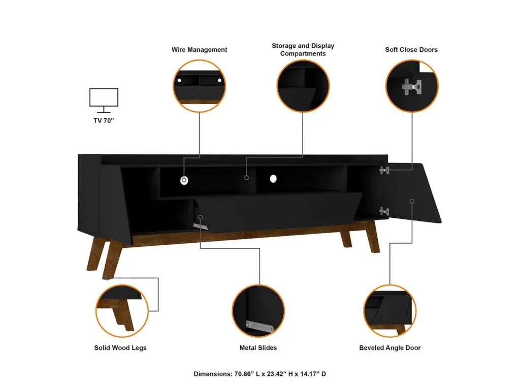 Elevate your living room or bedroom with our charming mid-century modern Marcus Freestanding TV Stand. Crafted with love, it combines style and functionality effortlessly. With soft-close doors, a cable management system, and solid pine wood legs, this stand sets the stage for cozy movie nights and sweet moments together.