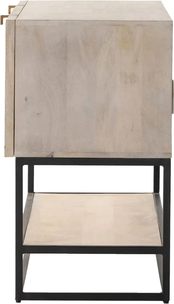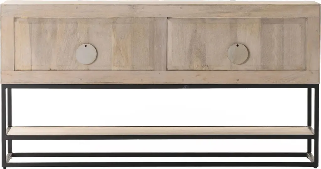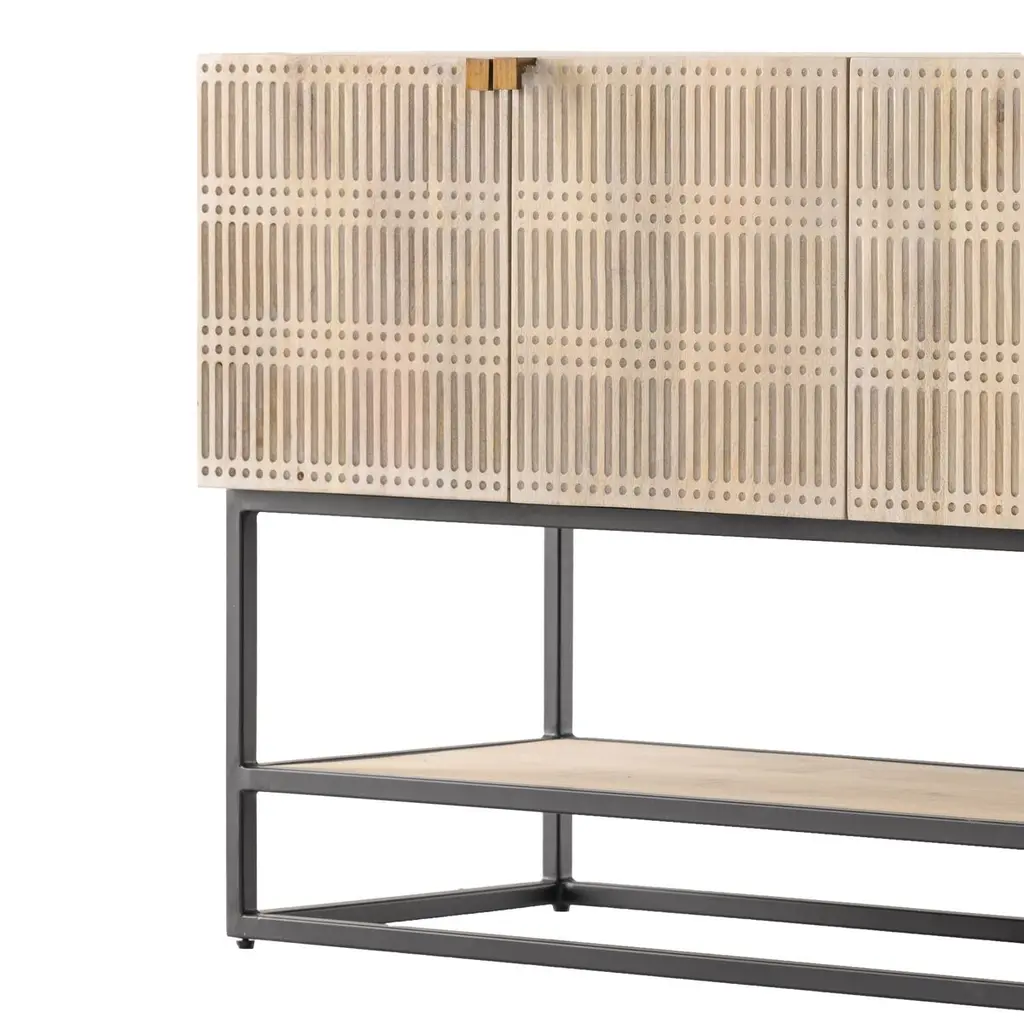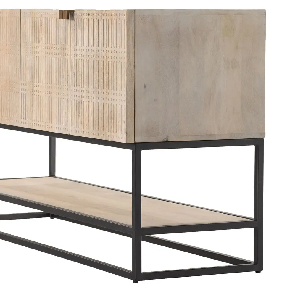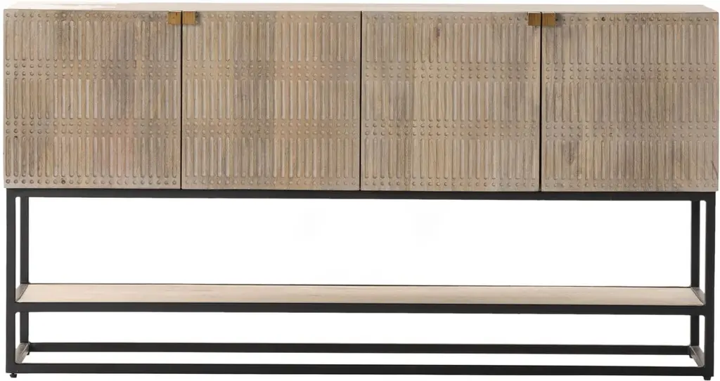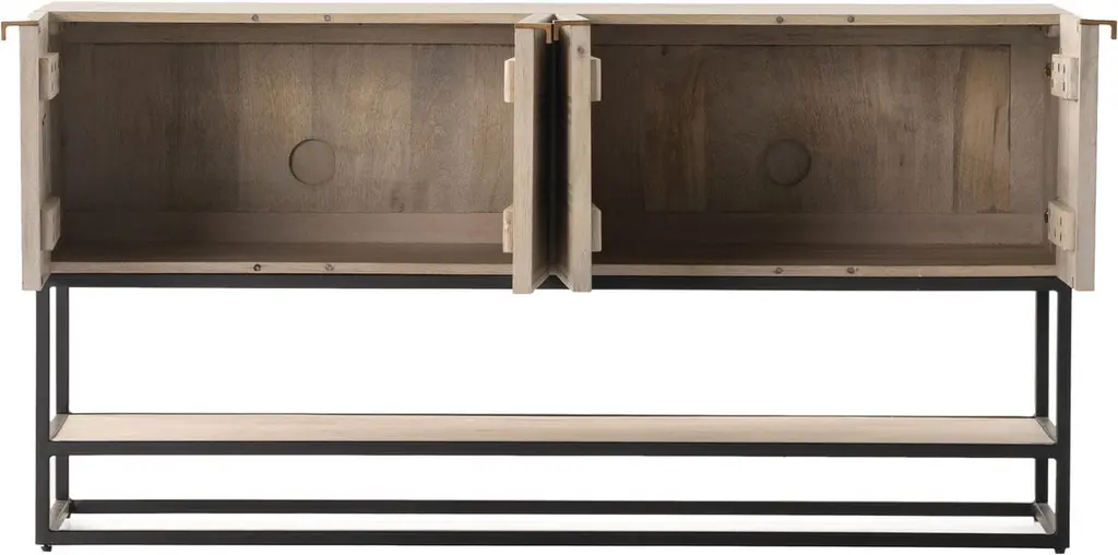Dots and grooves carved into the four mango-wood doors give this media console artisanal allure. Behind the doors are cutouts for cord management. The open shelf set within the iron frame provides additional storage or display space.