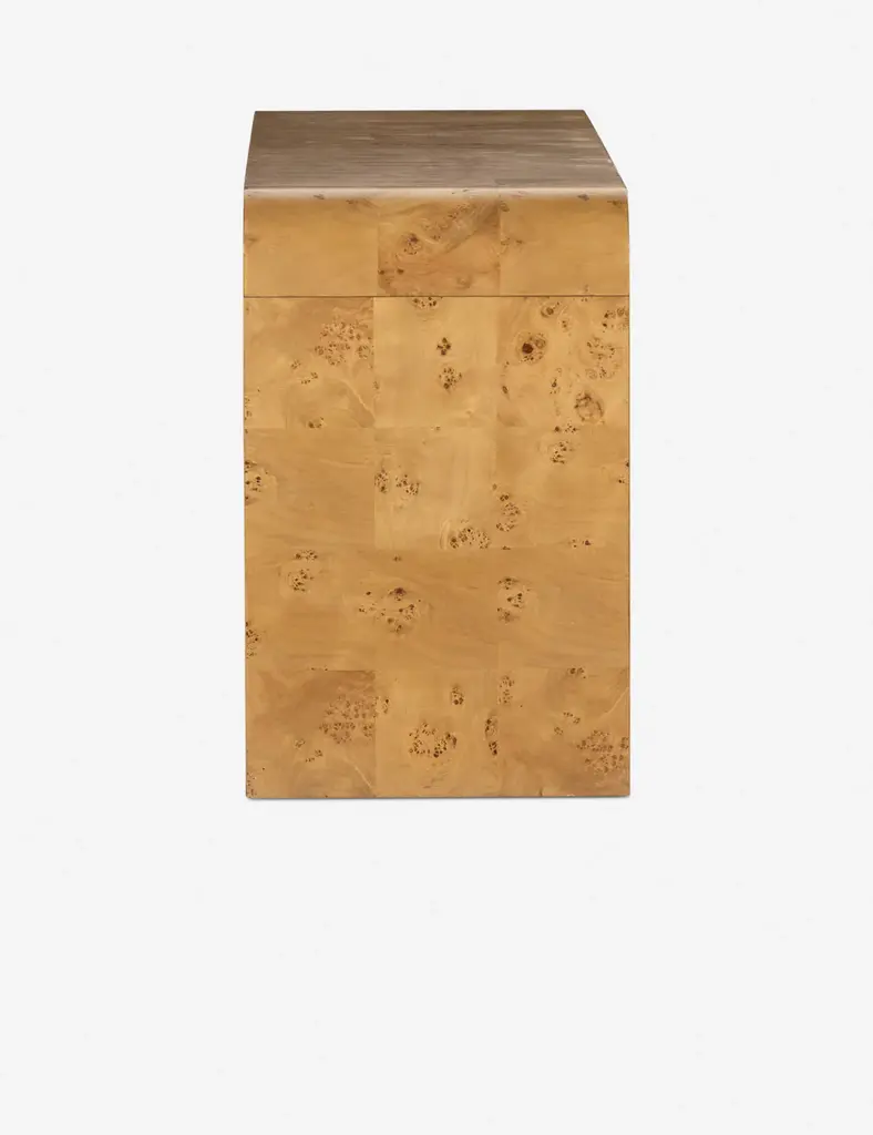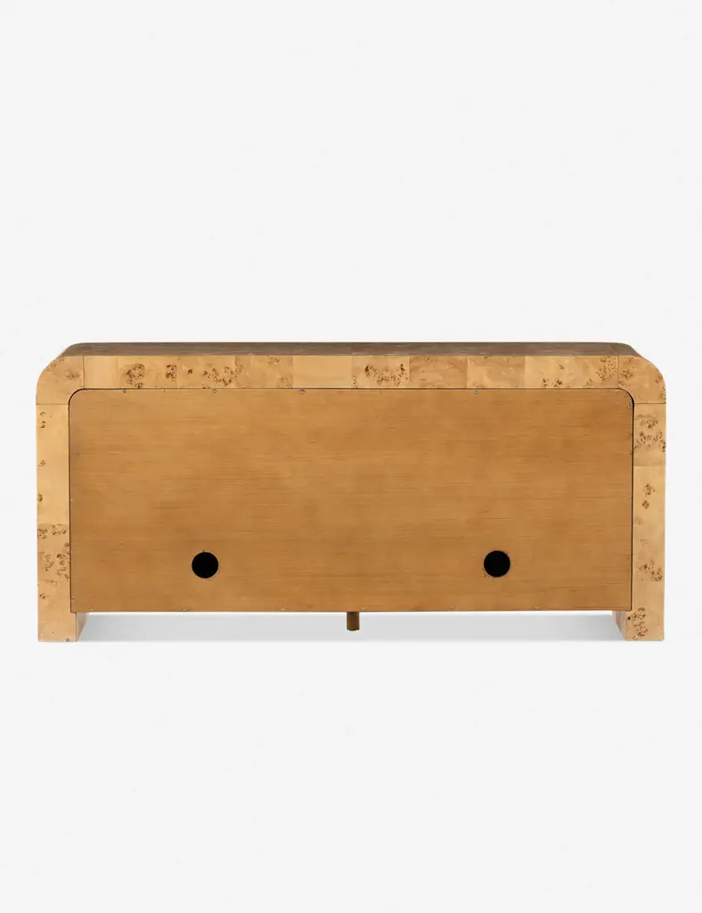 Clad in a patchwork burl wood veneer, this media console offers your space a signature look. The curving waterfall design features a high polish finish highlighting its luxe natural grain. With push latch cabinets that open to spacious shelving, this console offers a seamless, elevating touch for your living space or family room.