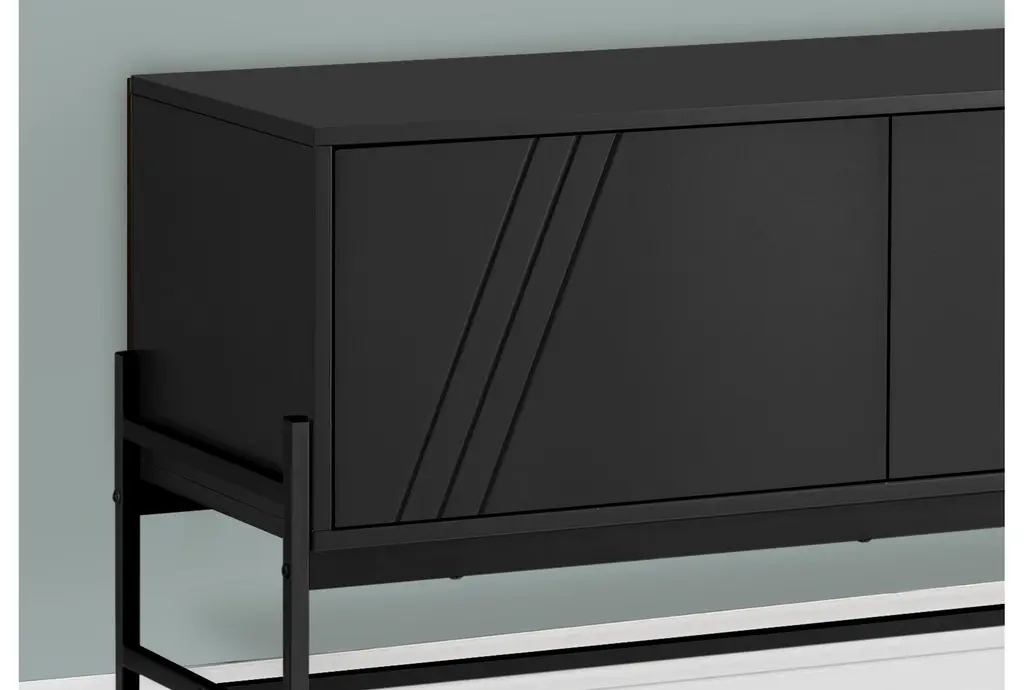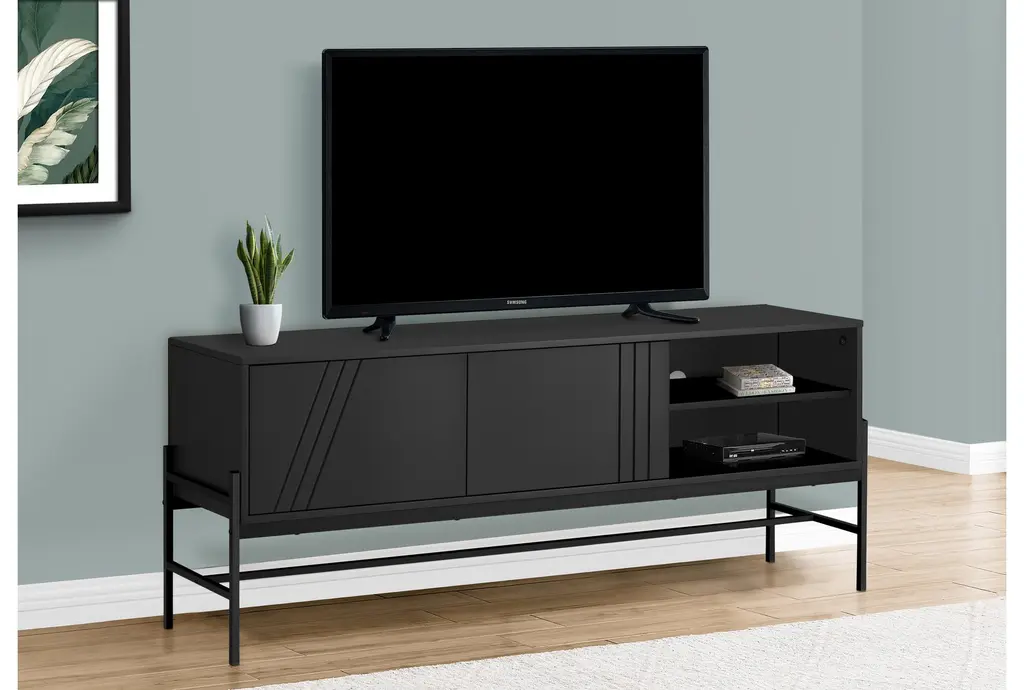 The Maude Modern Black 59" Storage Media Console is a sleek and stylish addition to any modern living space. Crafted from durable MDF and metal, this contemporary TV stand features a black laminate finish that adds a touch of sophistication to your room. With ample storage options, including a closed cabinet and open shelves, it provides both functionality and elegance.