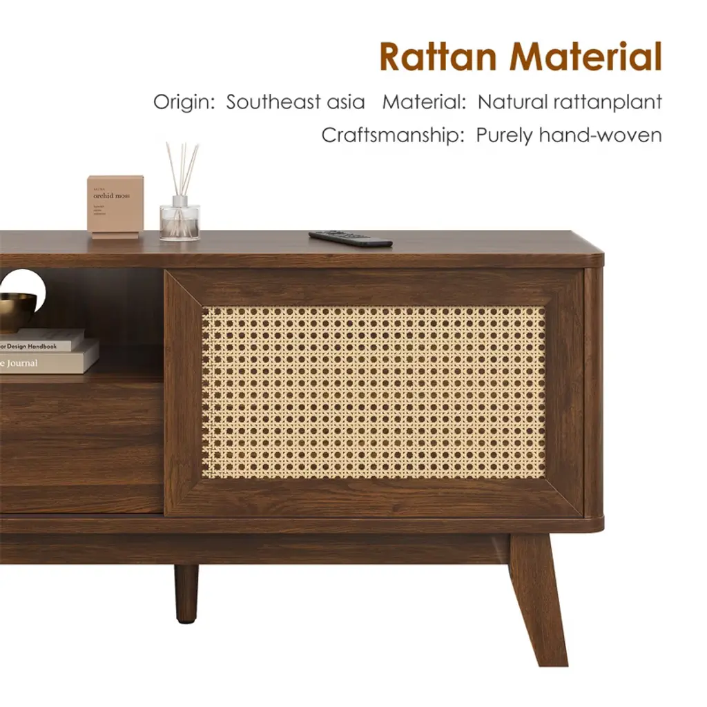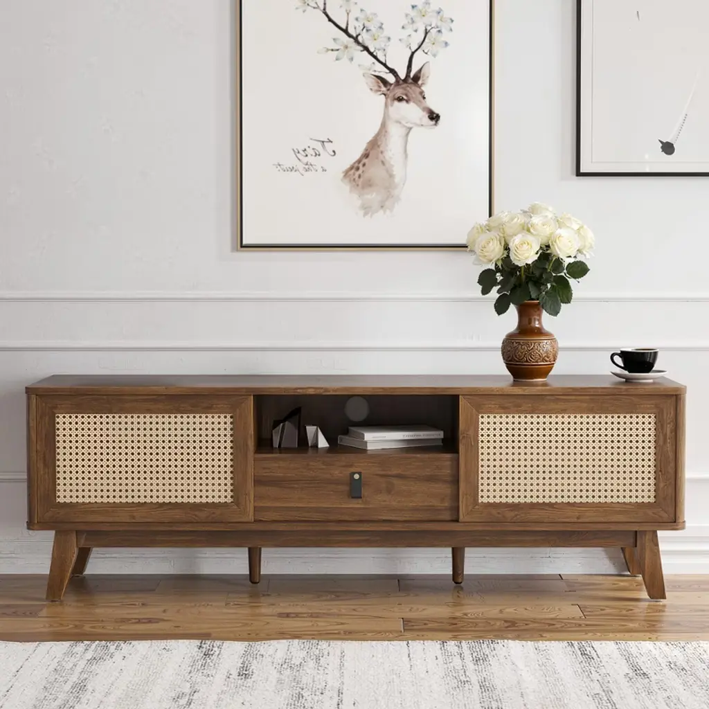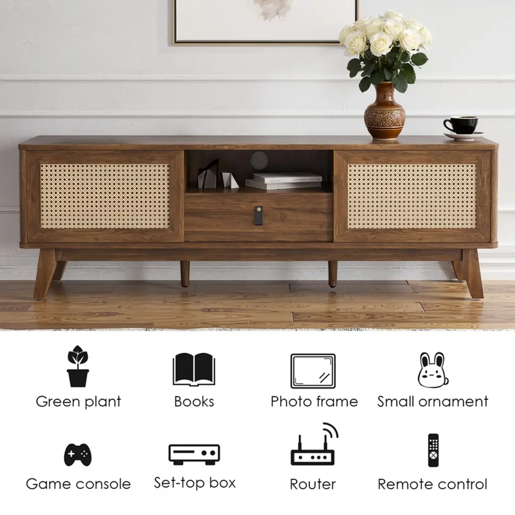 Upgrade your living room with this MAYEERTY beautiful rattan TV stand. It features natural rattan doors with unique craftsmanship, combining classic style with modern functionality. The thick wooden frame ensures stability and durability. The stand includes a detachable drawer, two cabinets, and a cord hole for easy wire management. It fits TVs perfectly and enhances your home decor with its versatile design. Easy to assemble with clear instructions and separate bags for screws.