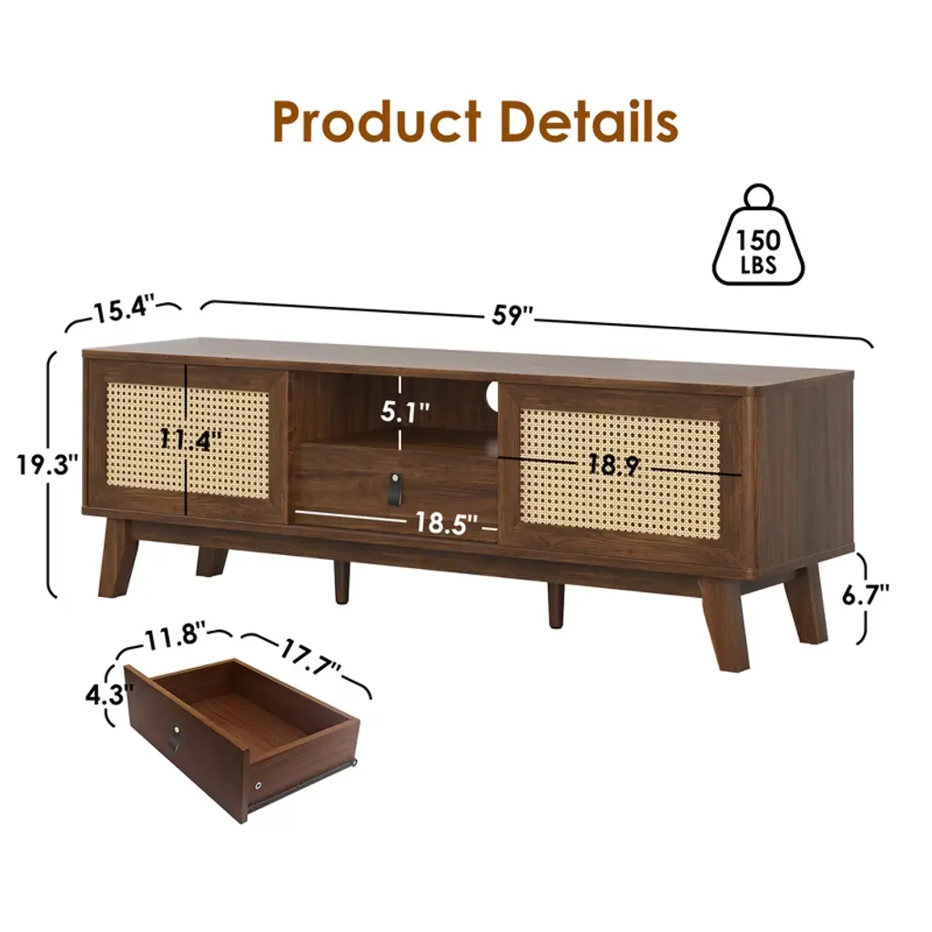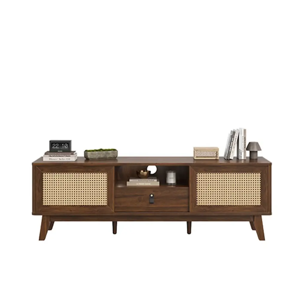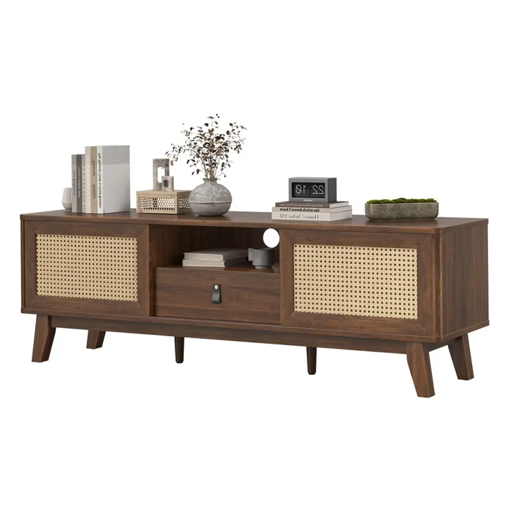 Upgrade your living room with this MAYEERTY beautiful rattan TV stand. It features natural rattan doors with unique craftsmanship, combining classic style with modern functionality. The thick wooden frame ensures stability and durability. The stand includes a detachable drawer, two cabinets, and a cord hole for easy wire management. It fits TVs perfectly and enhances your home decor with its versatile design. Easy to assemble with clear instructions and separate bags for screws.
