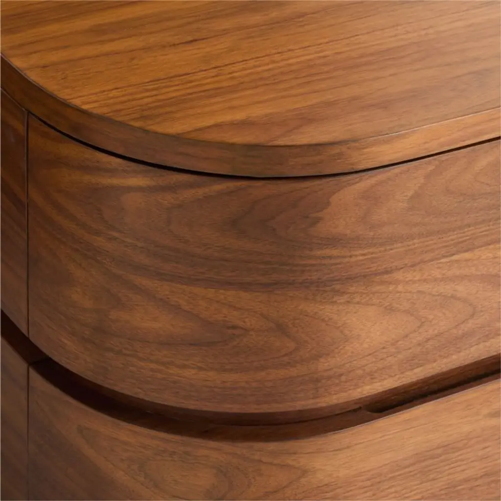 Milano looks to Italian design for its low profile and modern way with wood. Continuous walnut veneer shapes the media console with extravagantly curved corners and seamlessly integrated drawers that put all the focus on the beautiful wood grain. Recessed finger pulls divide the credenza horizontally into three sections, lending linear interest as well as carving out two side cabinets and a central set of drawers. We love the beautifully concealed storage and the low vantage point that puts your TV at just the right height for comfortable viewing.