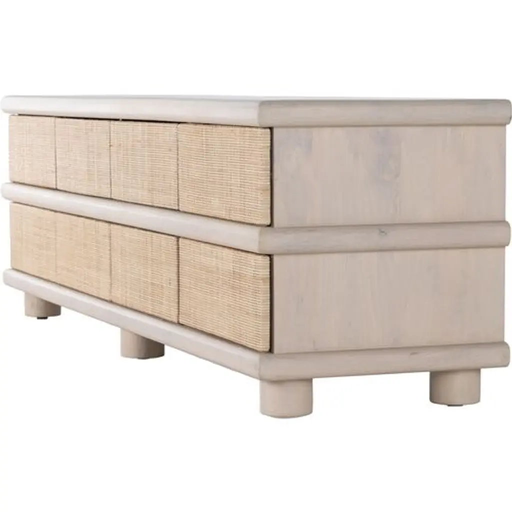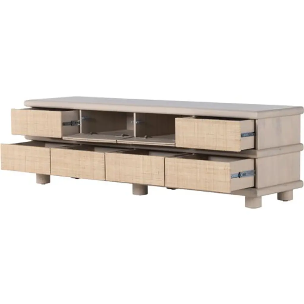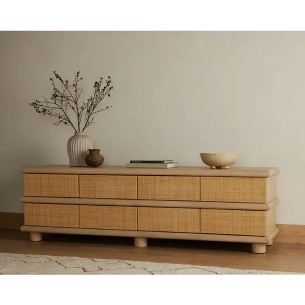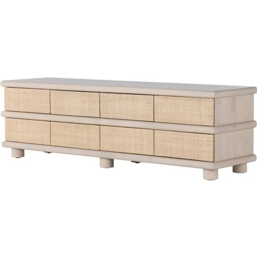 Door and drawer fronts crafted of woven cane bring a touch of the tropics to this media console's sculptural silhouette. Made of durable mango wood, the console has six soft-close drawers; the center two panels of the top row flip down to reveal additional storage and rear cutouts for cord management.