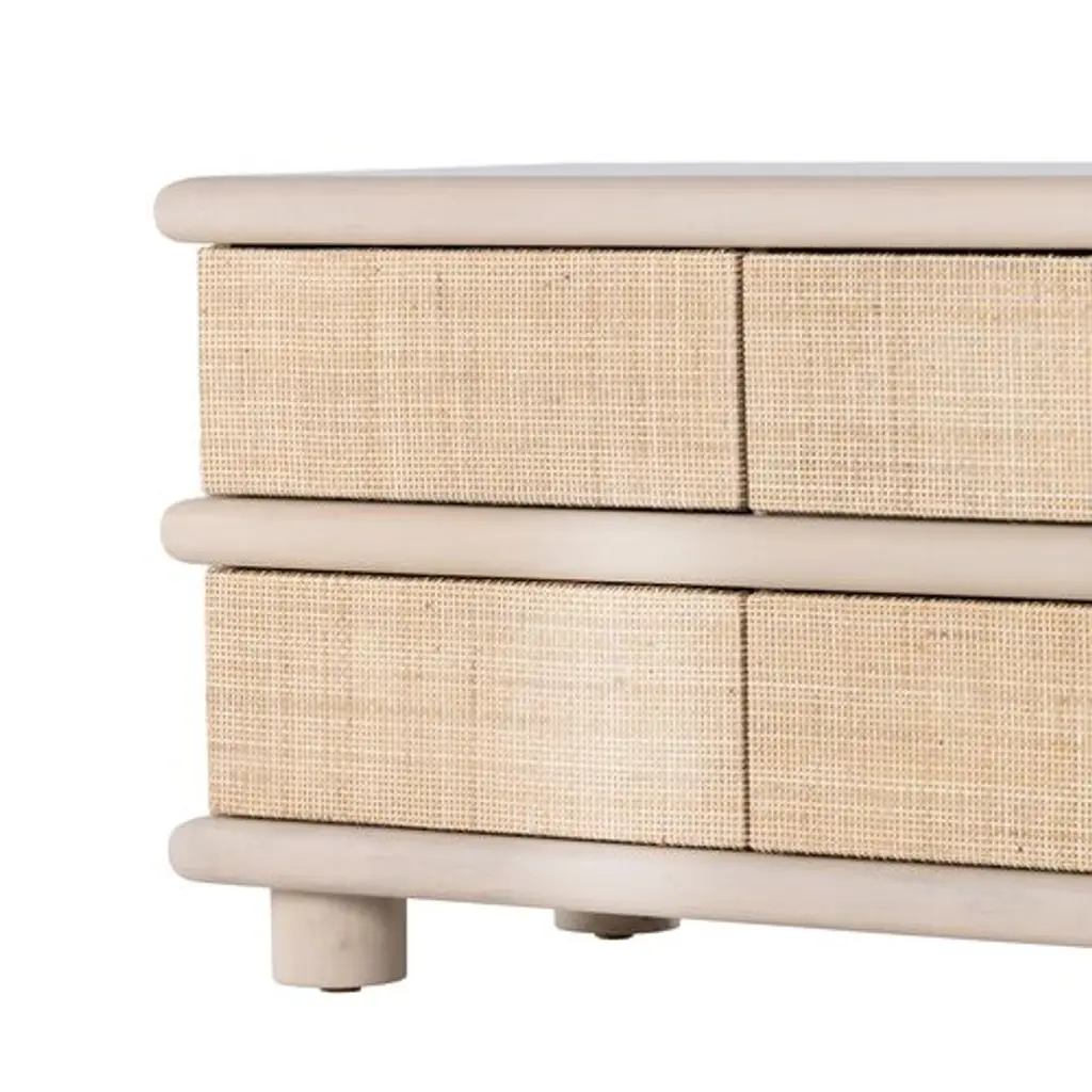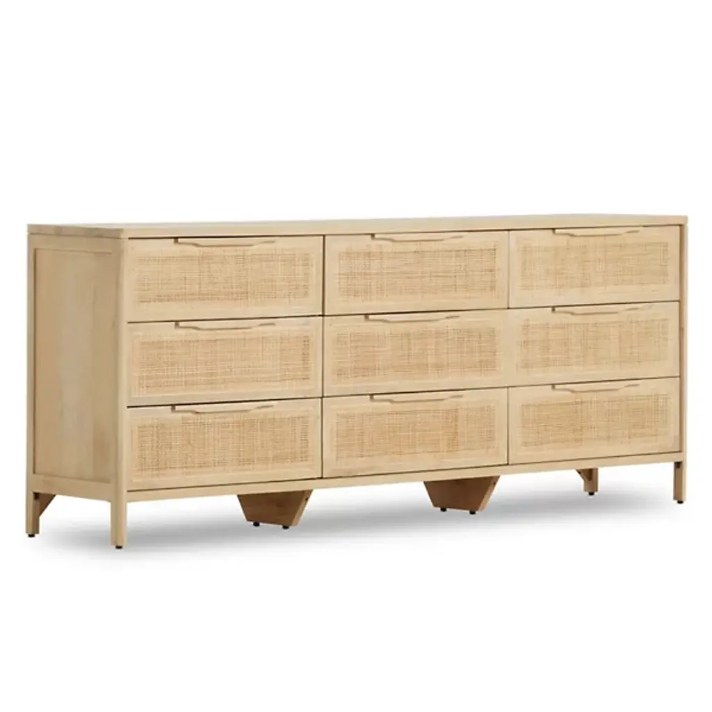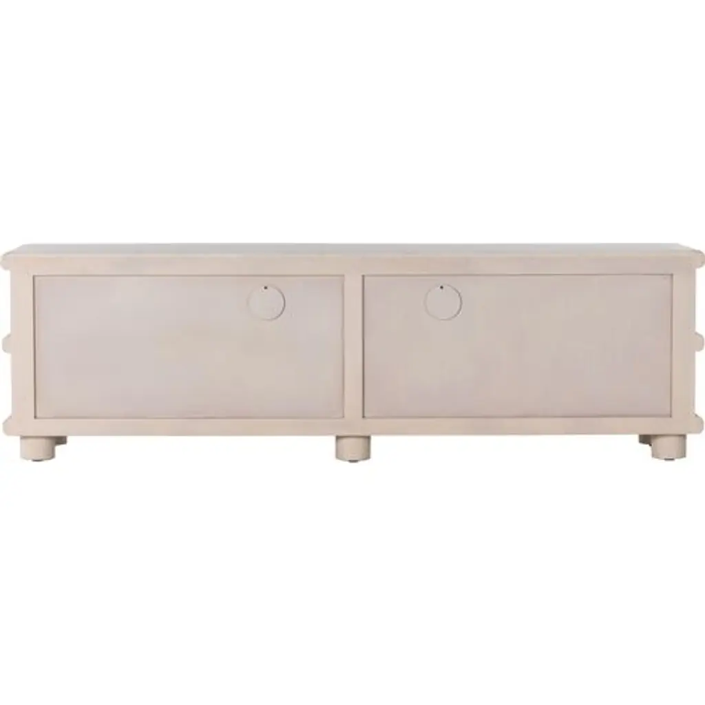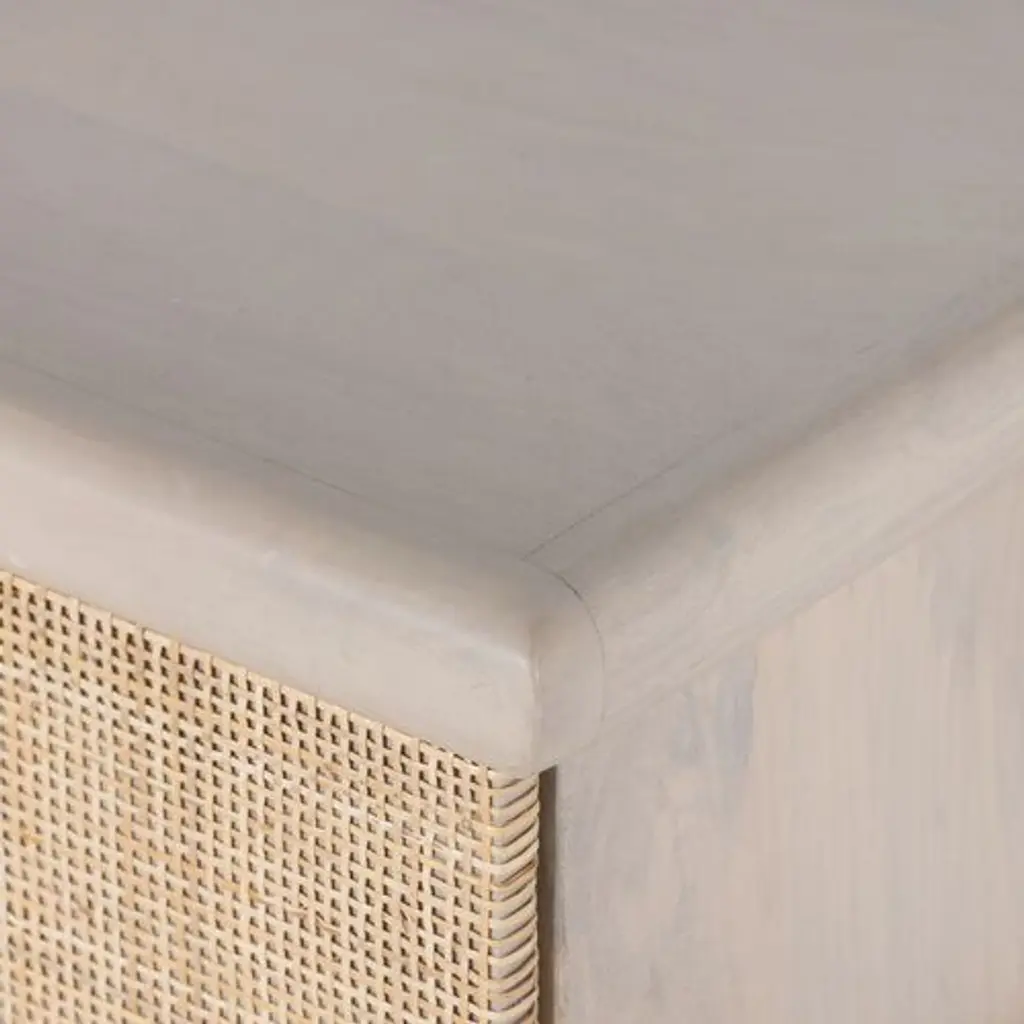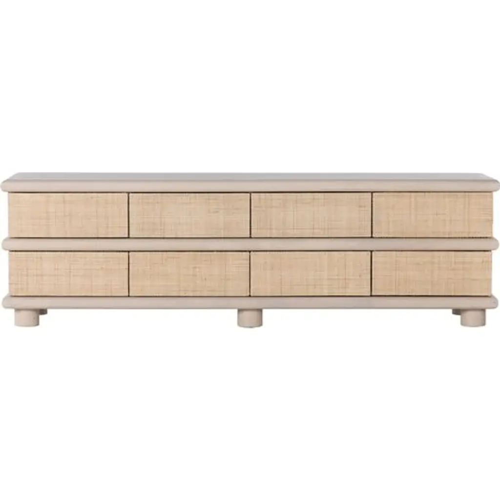 Door and drawer fronts crafted of woven cane bring a touch of the tropics to this media console's sculptural silhouette. Made of durable mango wood, the console has six soft-close drawers; the center two panels of the top row flip down to reveal additional storage and rear cutouts for cord management.