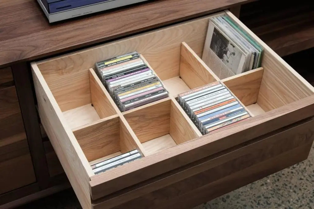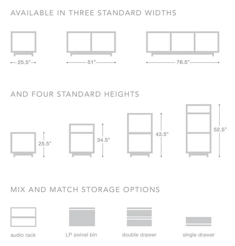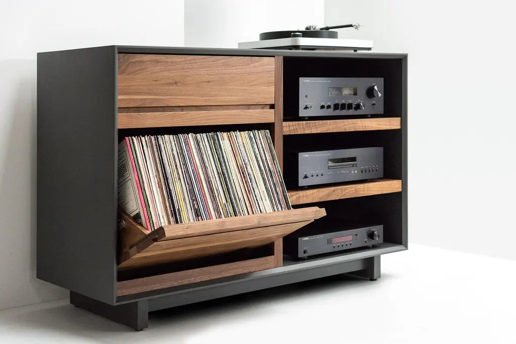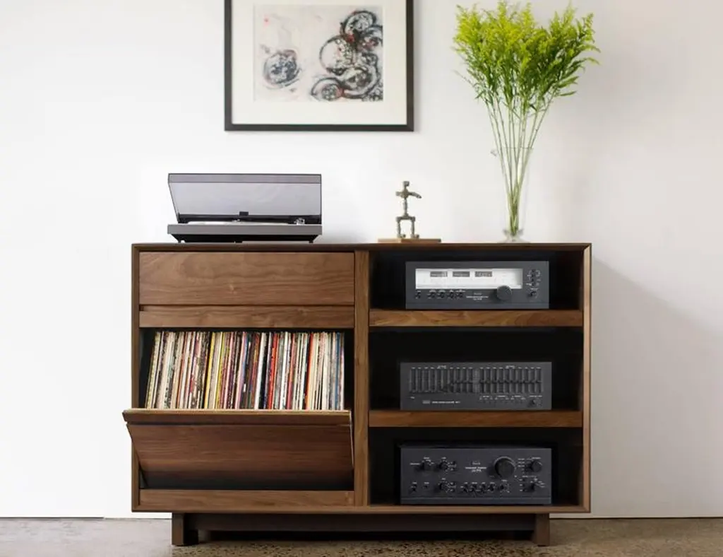 The AERO 51" provides a place for your turntable, audio components, 130 CDs or 72 DVDs, and up to 120 of your favourite albums. Our AERO cabinets feature an exclusive LP swivel bin that uses our proprietary Dual pivot hinge to protect records when closed and display them when open. The solid wood drawers feature English dovetail joinery, integrated pulls, and a removable insert for organization. Each piece is handcrafted out of domestically-sourced hardwoods in the tradition of fine-furniture. Whether you are an audiophile who wants integrated album storage in an audio rack or just need a beautiful entertainment cabinet to coordinate with your TV, our innovative system allows you to own a cabinet tailor made to your specifications.