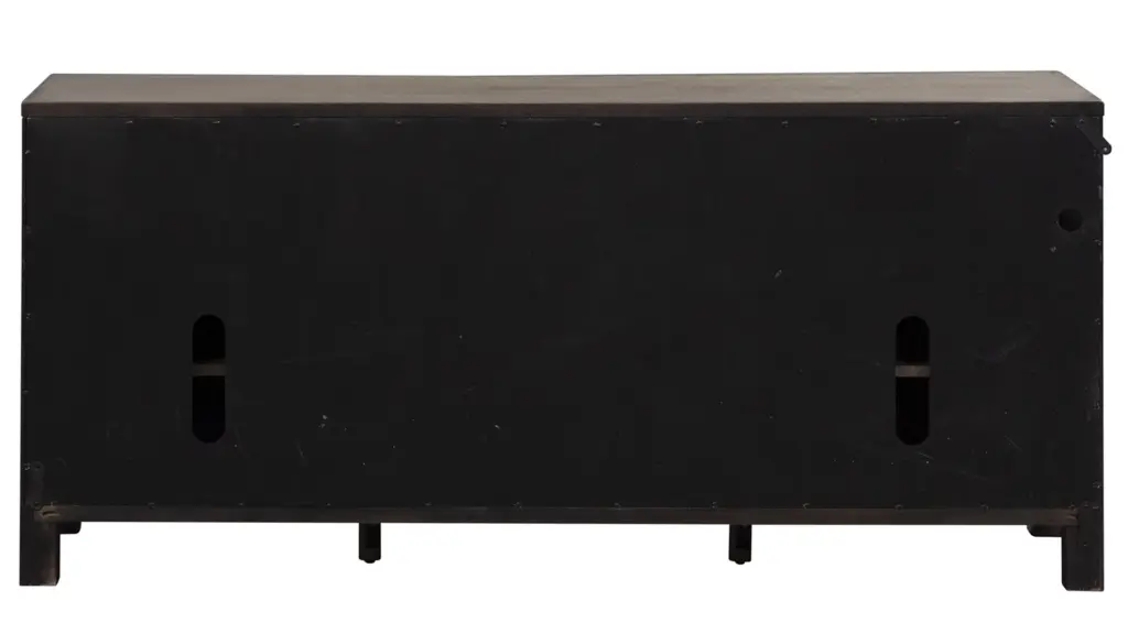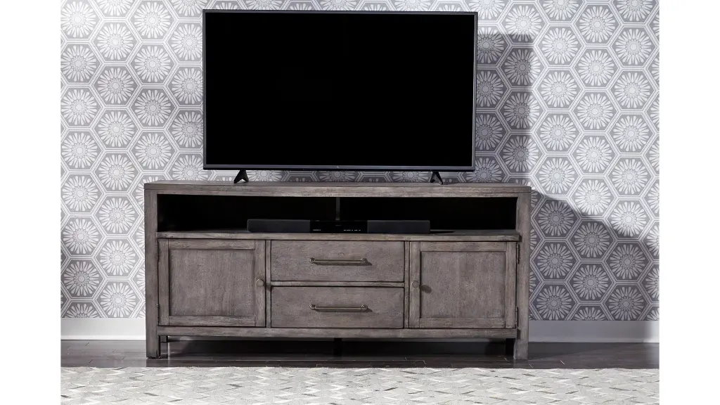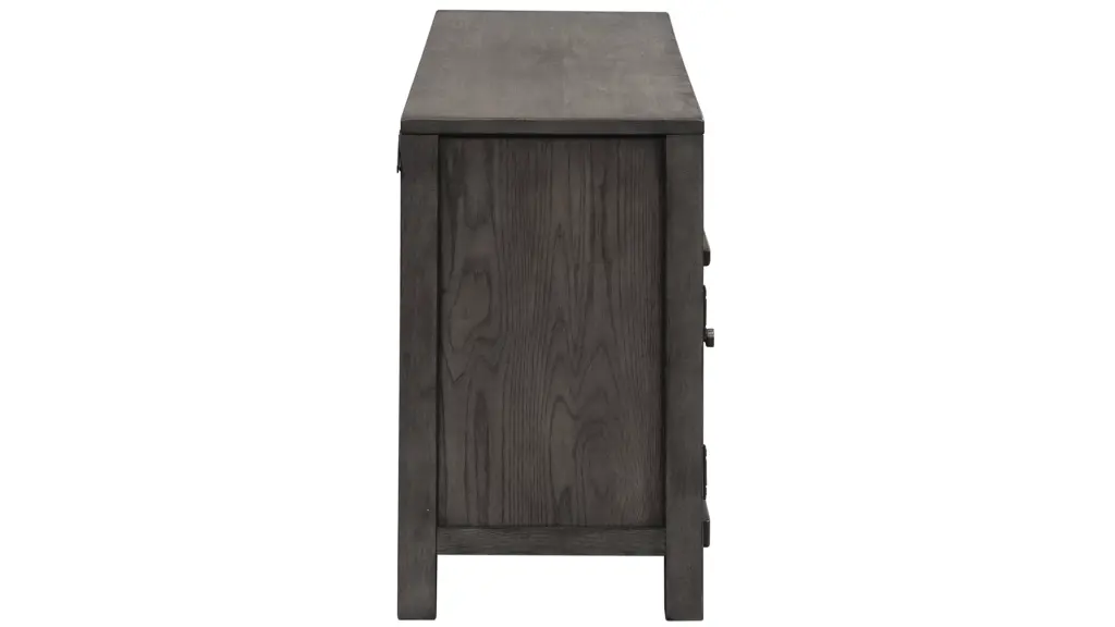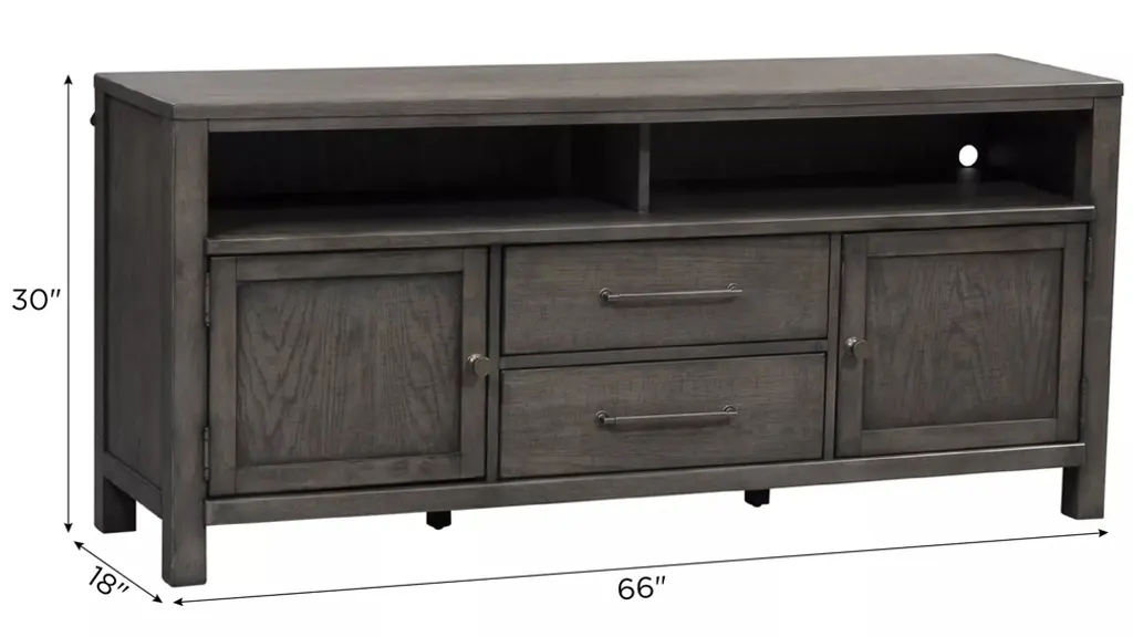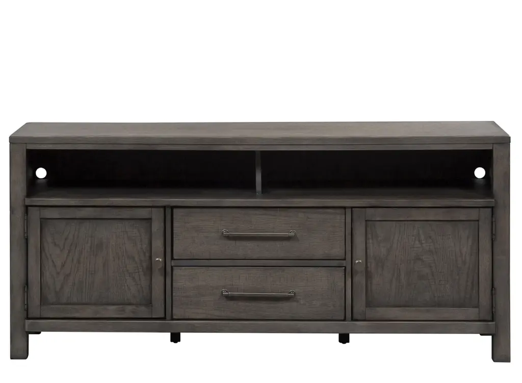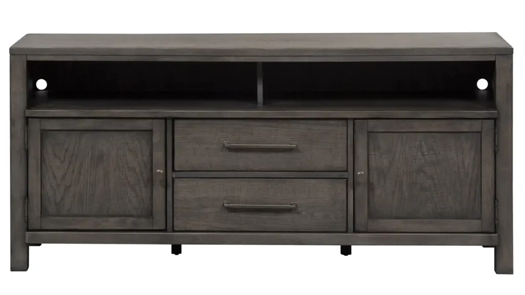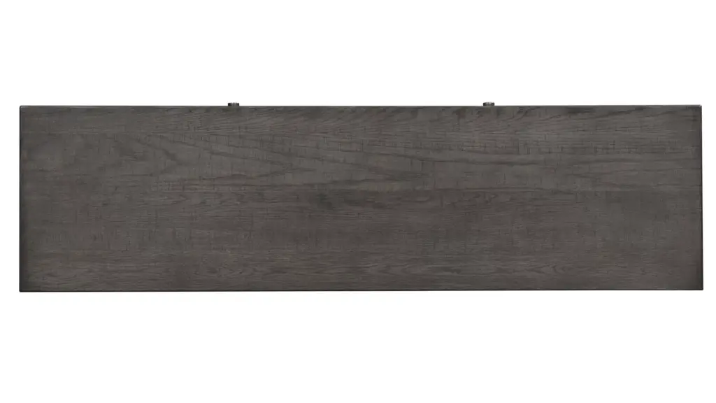 Accent your living room with the perfect farmhouse design, using this unique and stylish Modern Farmhouse Entertainment Console. Crafted of poplar solids with knotty white oak veneers, this piece accommodates most 72" TVs and features sound bar storage, planked tops, adjustable shelving, block pilasters, full extension drawer glides for easy access to storage, and is accented by washed brass elongated bar pull hardware with rounded ends. This console is sure to find a place in any home. Wire management provisions accommodate electronics or gaming equipment. The all-over Dusty Charcoal finish accompanied by heavy distressing sets this piece apart from the rest of the collections.