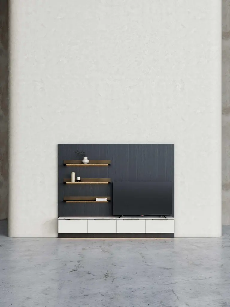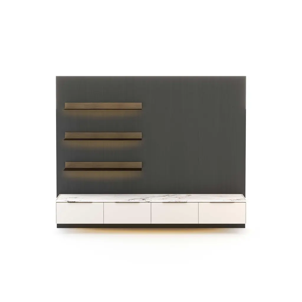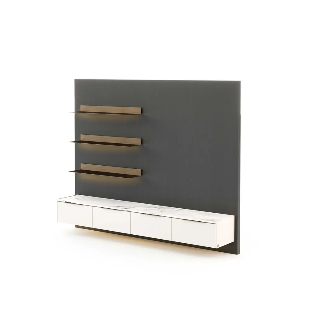 Designed to suit the needs of your living spaces, the Landform Day System sets up all the necessary elements for an area that prioritizes conviviality, rest, and entertainment. This piece combines bookcases, display cases, modular systems, and TV cabinets. This proposal presents an opportunity for placement against a wall, forming a partition that is ideally suited for living areas. The space merges relaxation zones, which are expertly facilitated by the TV cabinet, with tasteful decorative touches provided by the shelves, culminating in an overall impression.This composition is inspired by a refined selection of materials and effortlessly conveys a sense of high quality combined with good taste. It features a dark brown oak veneer panel, antique brushed bronze metal shelves, and a beige mate lacquered TV cabinet with a ceramic top.As the product can be personalized, the image of the presentation is merely illustrative.Composition descriptionPanel 620 - 248 x 6 x H200 cmMate oak wood veneer (Scf-20)Shelves - 100 x 25 x H8 cmBrushed bronze metal (Scm-14) with red light (3000K)Tv Cabinet - 240 x 40 x H300 cmMate beige lacquered (Scl-03) with brushed bronze metal handles (Scm-14)And top in strata argentum ceramic (Riverwashed).