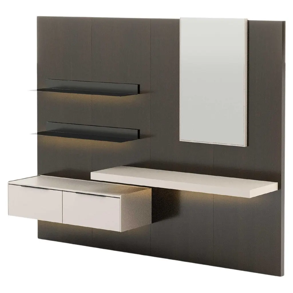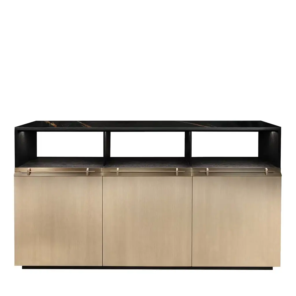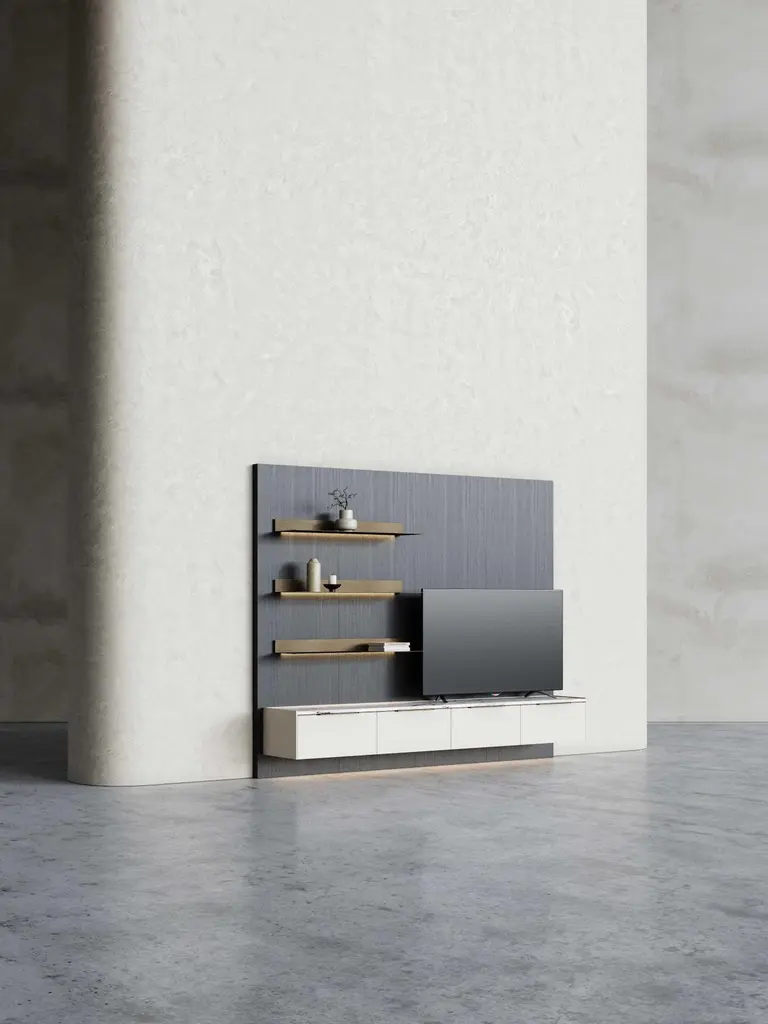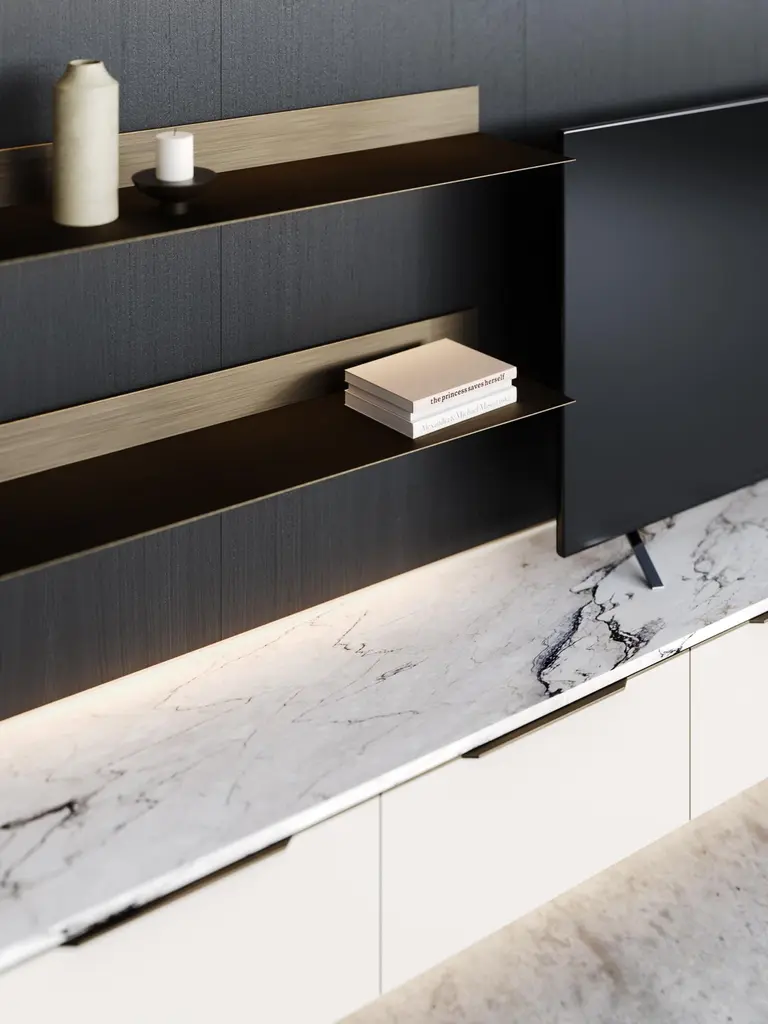 Designed to suit the needs of your living spaces, the Landform Day System sets up all the necessary elements for an area that prioritizes conviviality, rest, and entertainment. This piece combines bookcases, display cases, modular systems, and TV cabinets. This proposal presents an opportunity for placement against a wall, forming a partition that is ideally suited for living areas. The space merges relaxation zones, which are expertly facilitated by the TV cabinet, with tasteful decorative touches provided by the shelves, culminating in an overall impression.This composition is inspired by a refined selection of materials and effortlessly conveys a sense of high quality combined with good taste. It features a dark brown oak veneer panel, antique brushed bronze metal shelves, and a beige mate lacquered TV cabinet with a ceramic top.As the product can be personalized, the image of the presentation is merely illustrative.Composition descriptionPanel 620 - 248 x 6 x H200 cmMate oak wood veneer (Scf-20)Shelves - 100 x 25 x H8 cmBrushed bronze metal (Scm-14) with red light (3000K)Tv Cabinet - 240 x 40 x H300 cmMate beige lacquered (Scl-03) with brushed bronze metal handles (Scm-14)And top in strata argentum ceramic (Riverwashed).