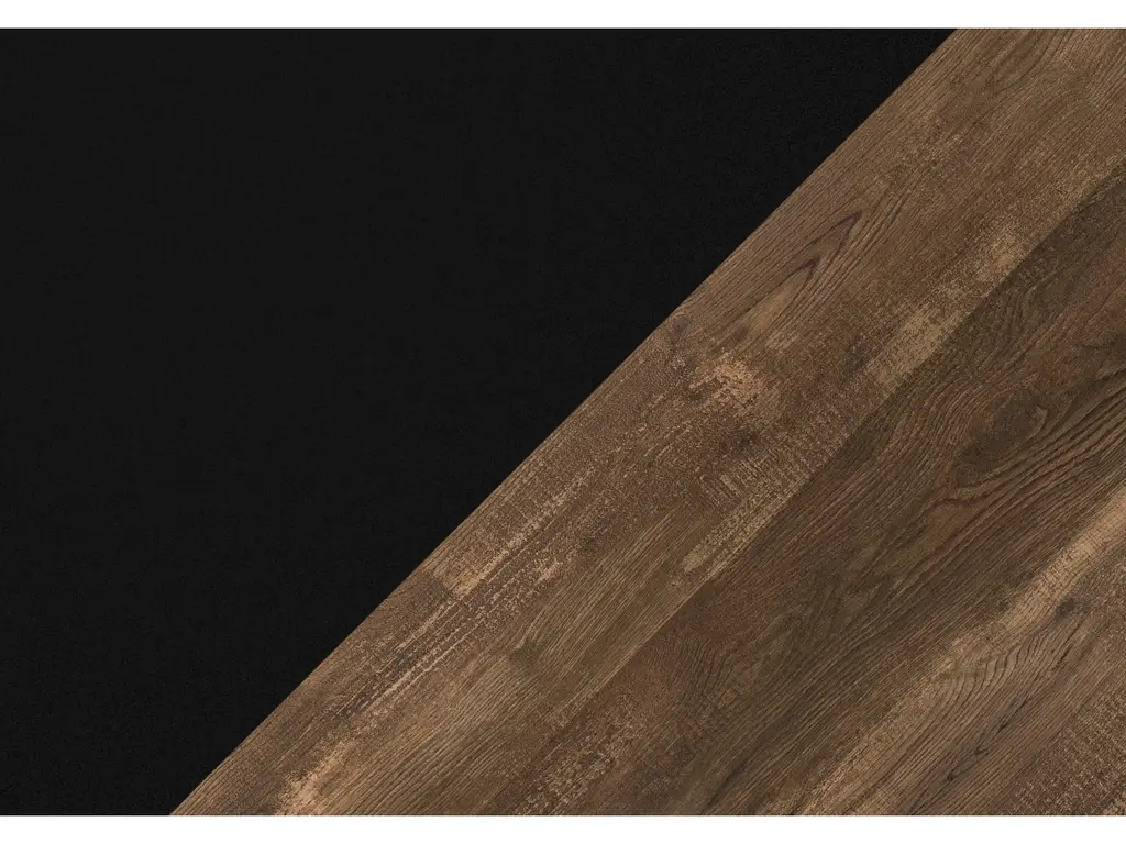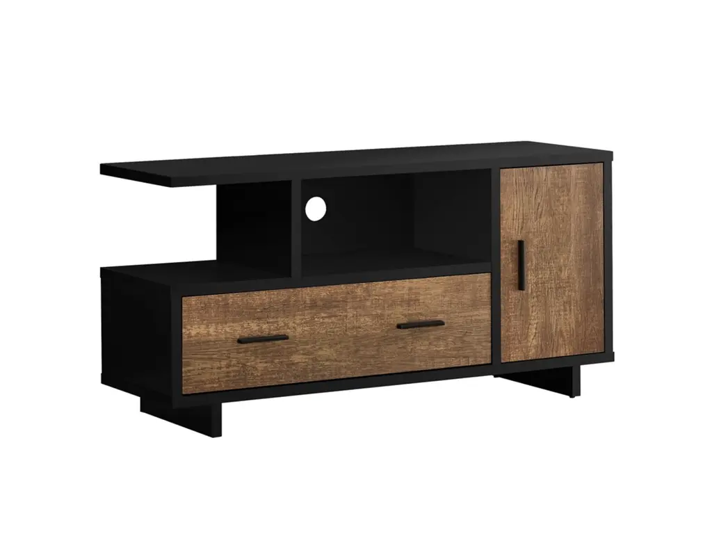 Let this contemporary style two-toned TV stand take center stage in your entertainment space! Finished in a rich black, with a contrasting warm brown reclaimed-look on the door fronts for a rustic appeal, the 48-inch long top can hold any size TV when centered. The two open shelf spaces can easily store your audio/visual equipment; the closed cabinet and large gliding drawer accented with sleek black handles, will keep other accessories organized and out of sight. A handy pre-drilled wire management hole in the center keeps your wires neatly in place. Assembly is required.
