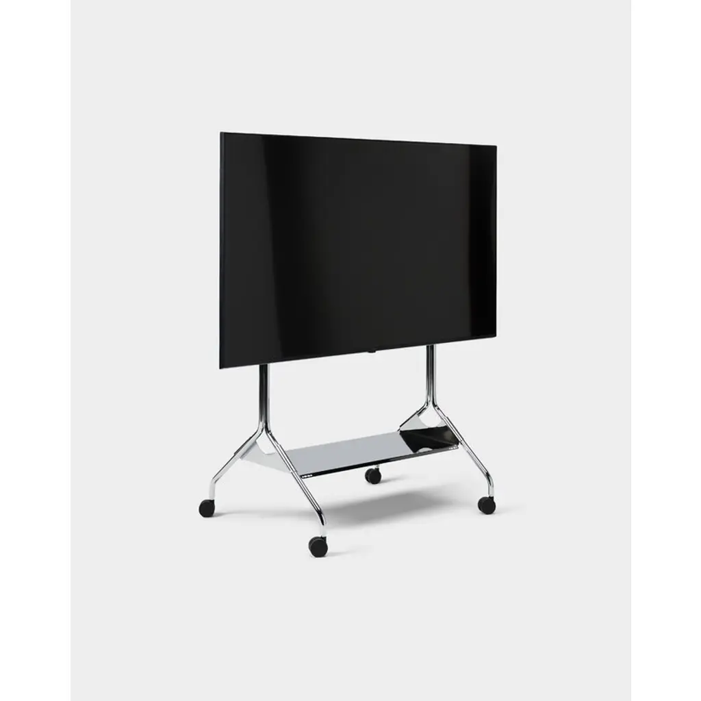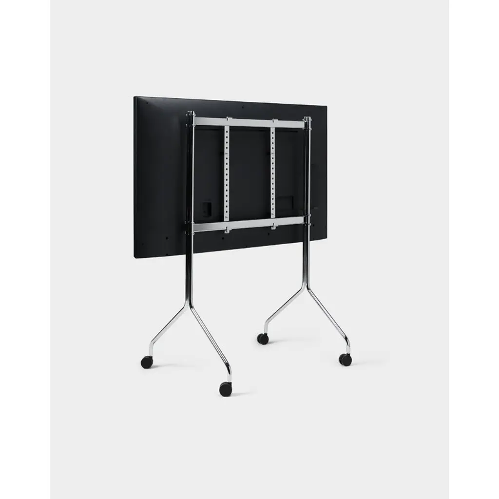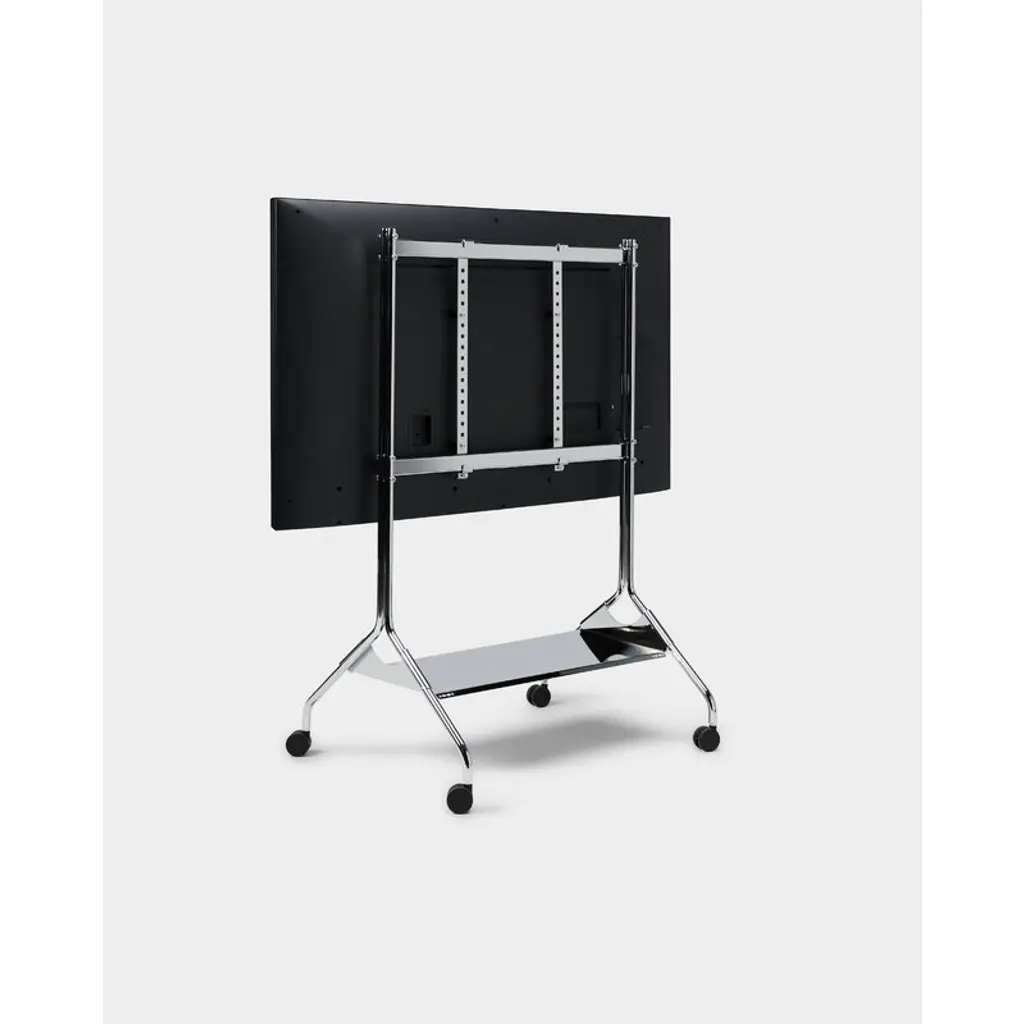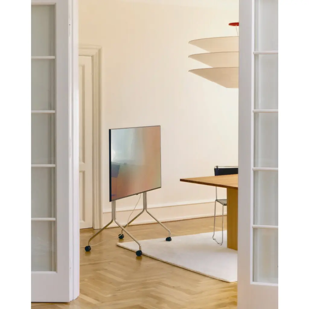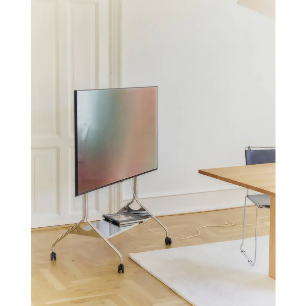 Pedestal's Moon Rollin' Tall TV stand provides a sleek and minimalist storage solution for the living room's centerpiece. Made from powder-coated steel, the TV rack's look and practicality are completed by convenient wheels – whether you seek a closer viewing experience or prefer to hide your television temporarily, the Moon Rollin' Tall TV stand offers unmatched flexibility. Slightly taller than the original Moon Rollin' stand, Moon Rollin' Tall is ideal for spaces where a higher viewing position is needed, such as open-plan kitchens, meeting rooms or areas where the screen is typically viewed while standing or from higher seating. The stand is compatible with most 44" to 77" flat-screen TVs.