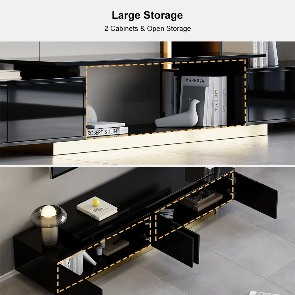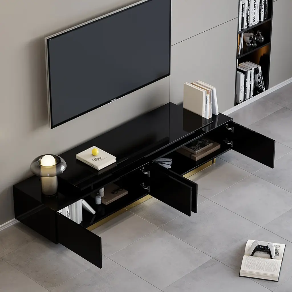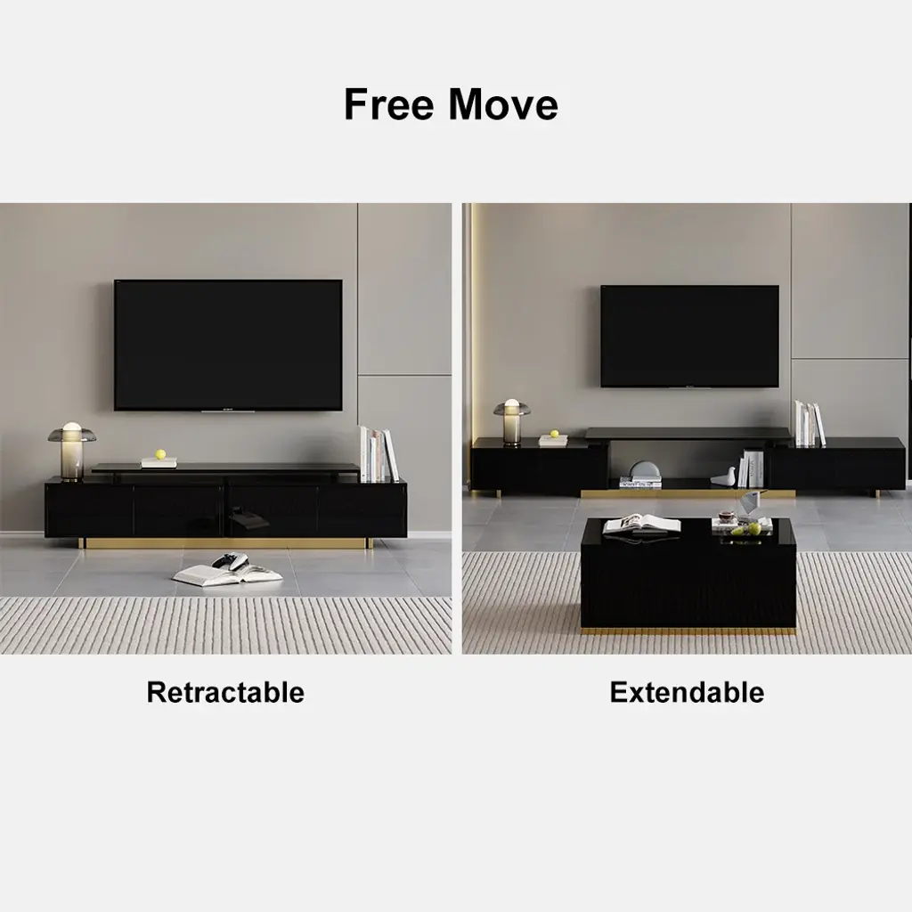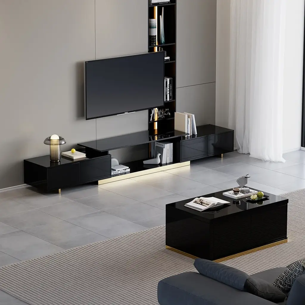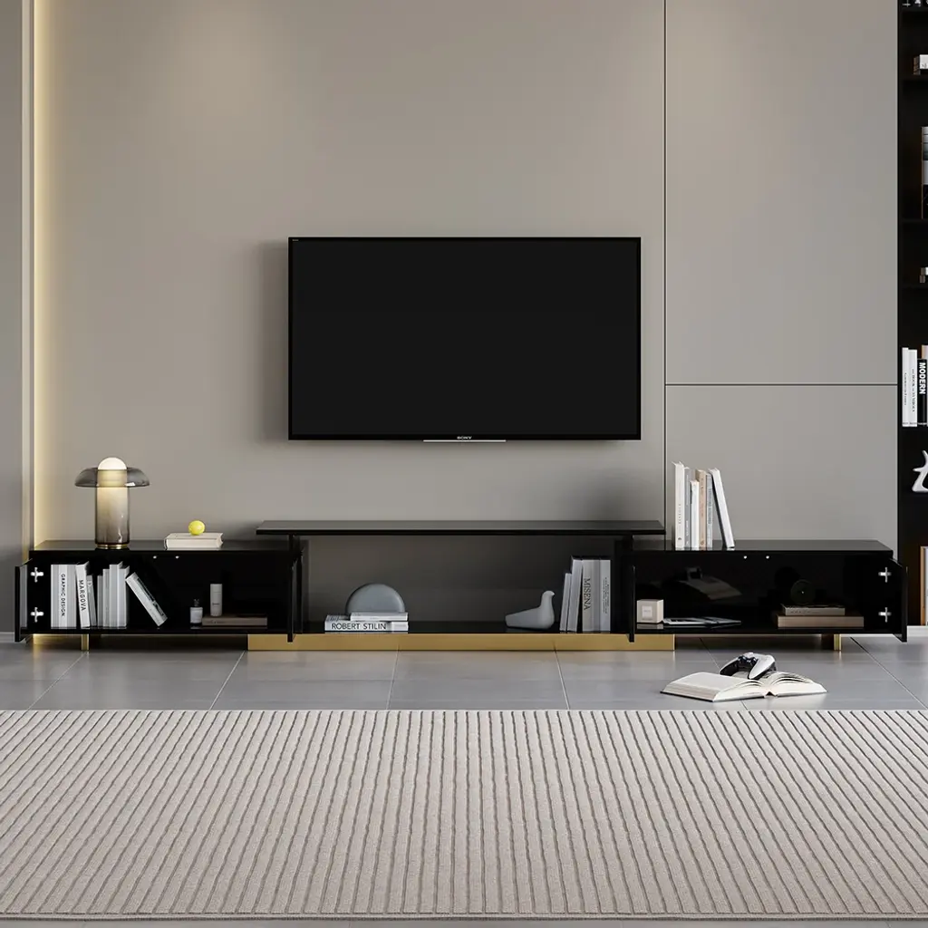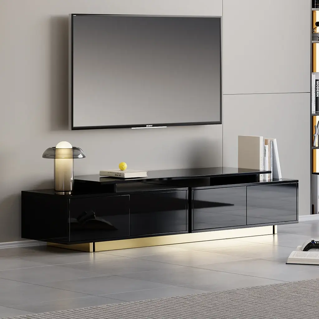 This is a glossy, extendable TV stand for TVs from 65" to 85" with adjustable length and spacious storage. Its extendable design fits all room sizes, offering a functional and stylish solution. Keeping media devices and all their accessories in order, it works well in a contemporary home.