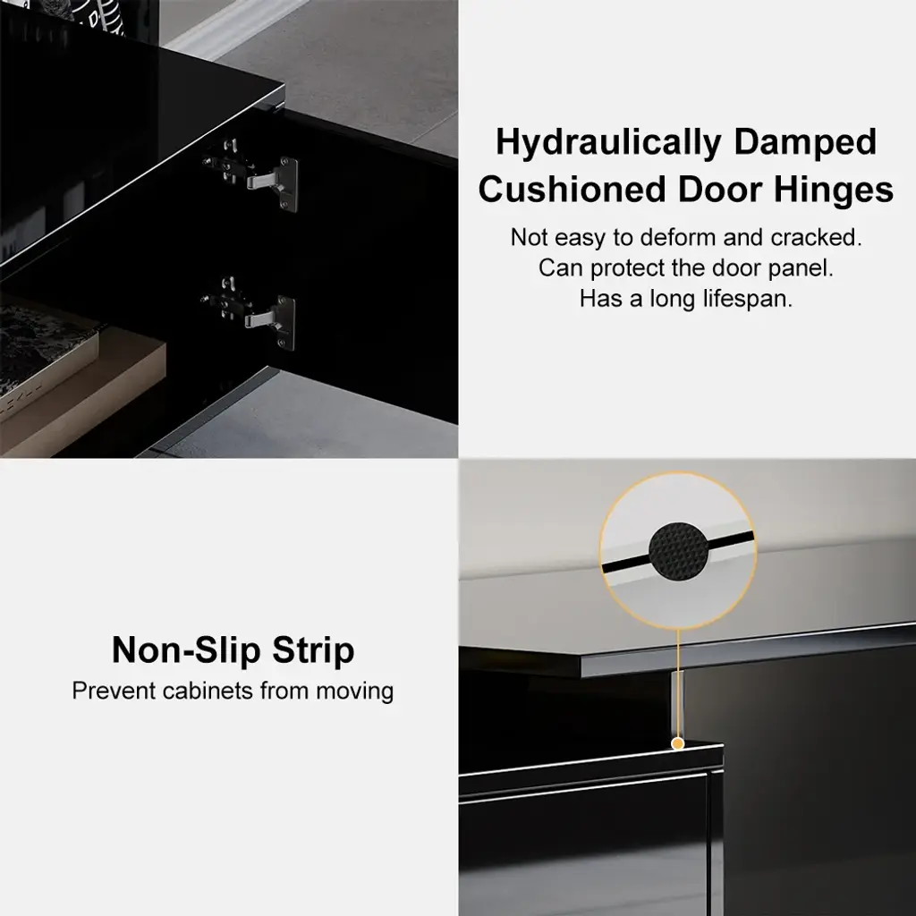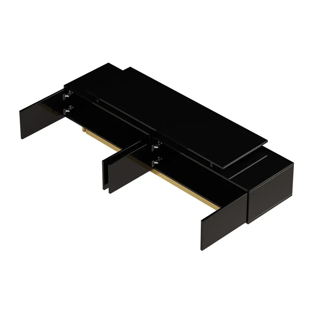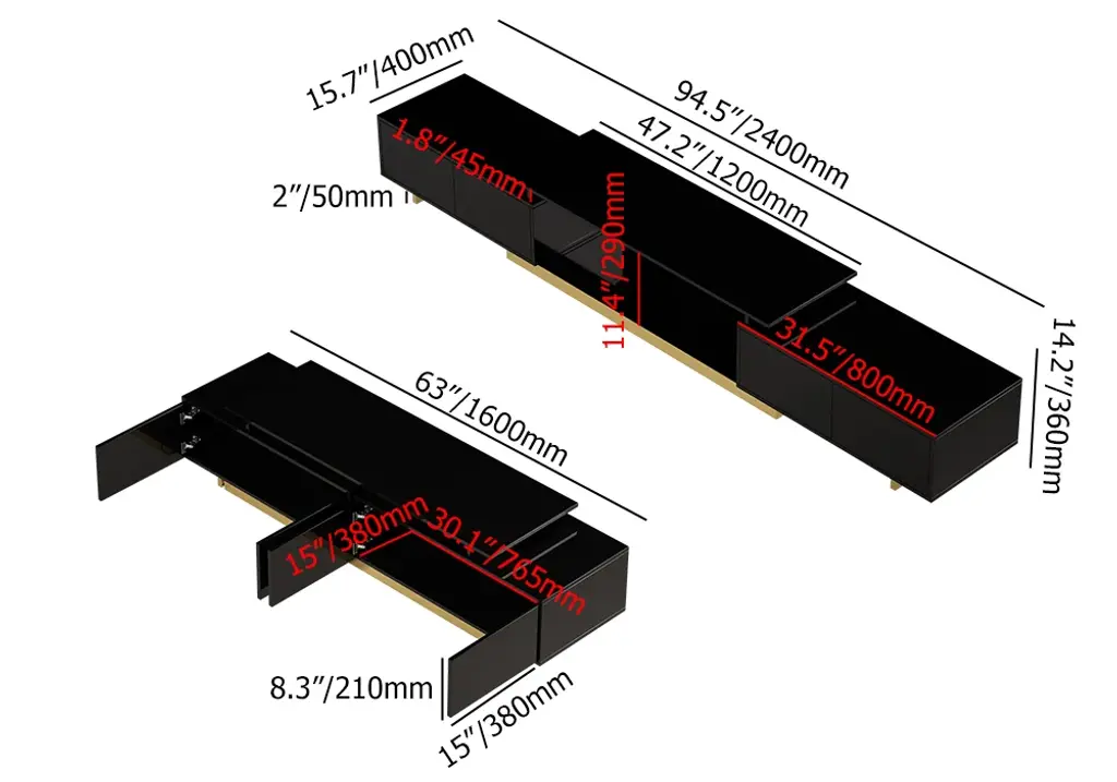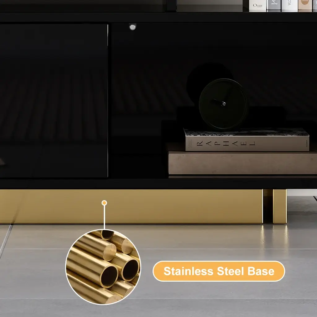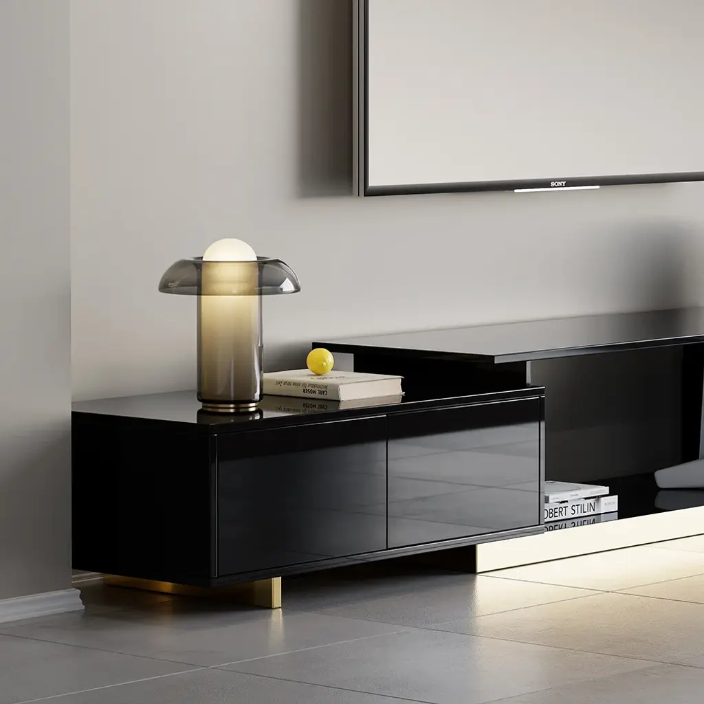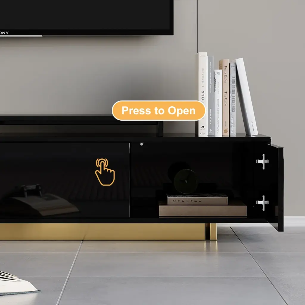 This is a glossy, extendable TV stand for TVs from 65" to 85" with adjustable length and spacious storage. Its extendable design fits all room sizes, offering a functional and stylish solution. Keeping media devices and all their accessories in order, it works well in a contemporary home.