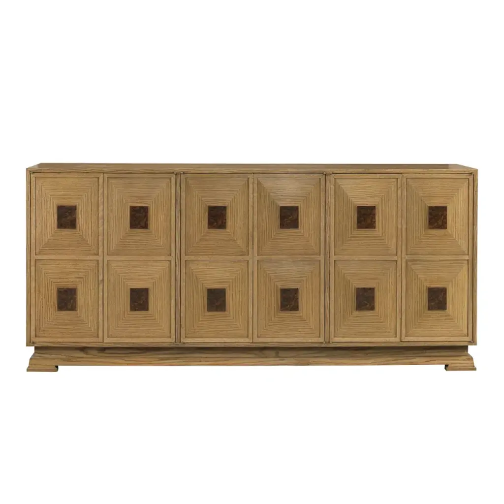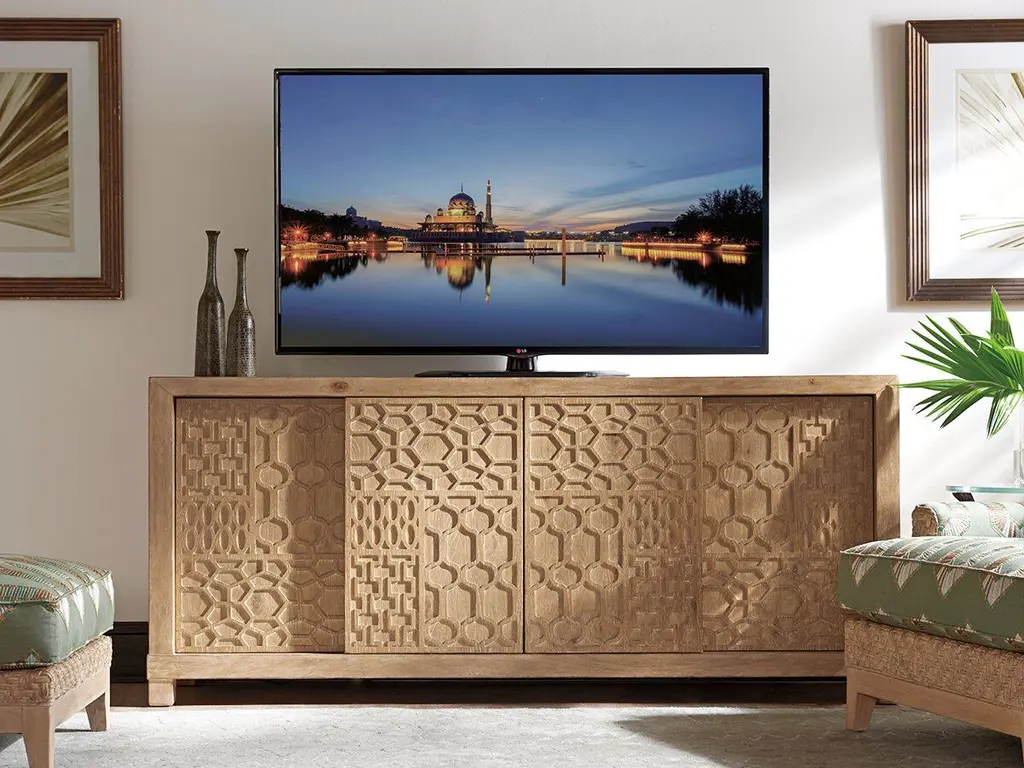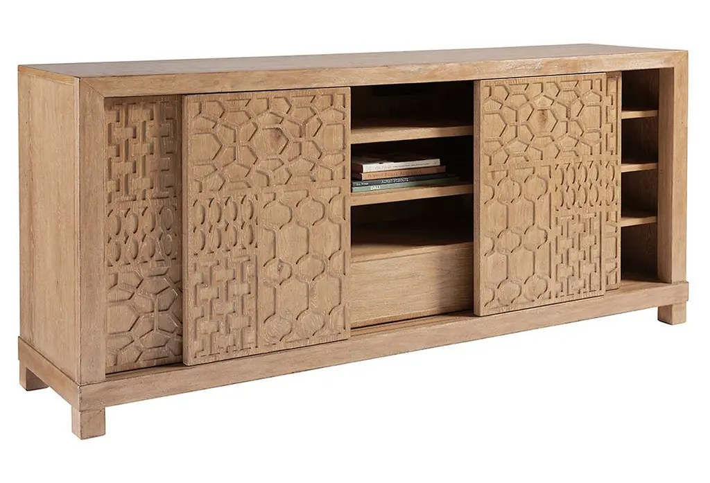 An intriguing tribal design in the fretwork of this media console's four sliding doors gives this otherwise clean-lined design dimension and texture. Inside, you'll find eight adjustable shelves and one large storage drawer, as well as a ventilated back with grommets for wire management.