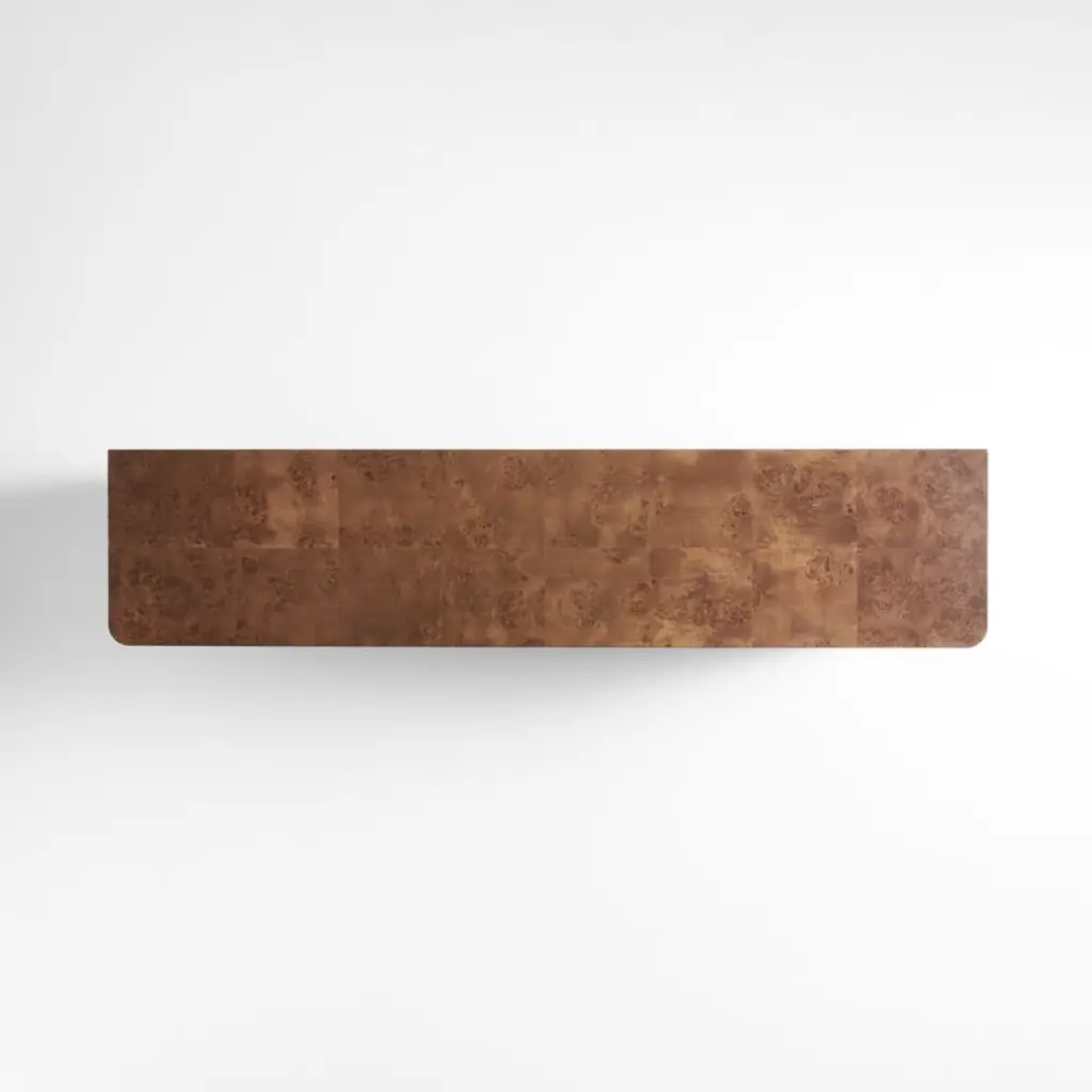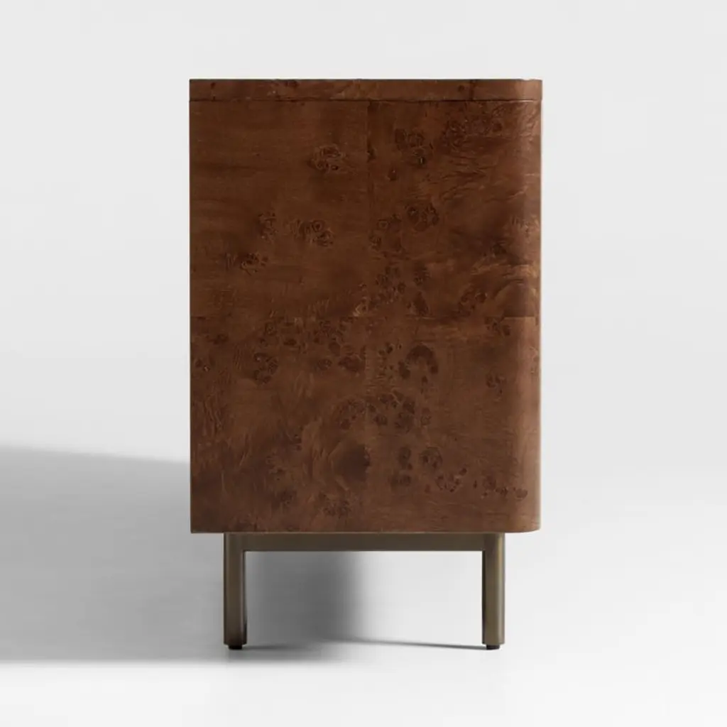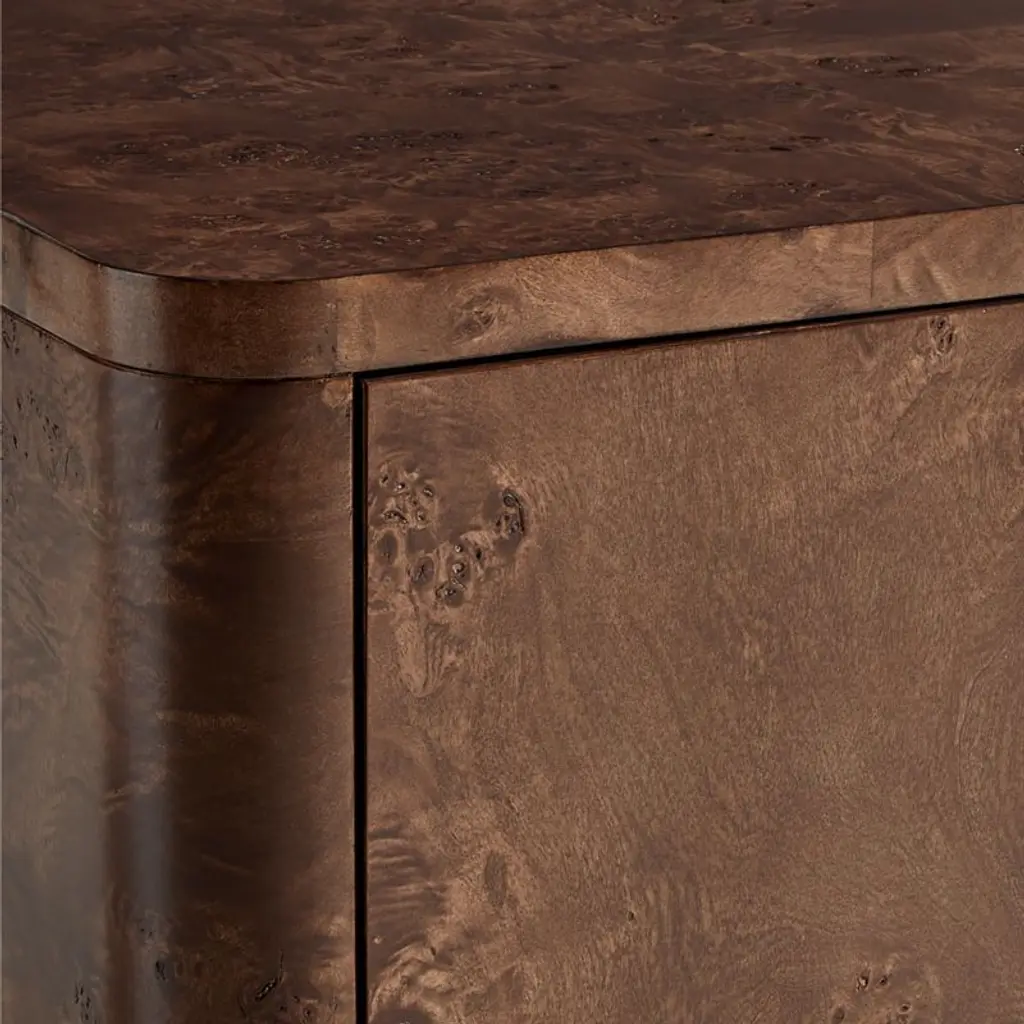 Prized for its beauty and rarity, burled wood displays a fascinating array of naturally occurring wood grain swirls. This exquisite media console devotes all its attention to the patterning of mappa burl veneer with clean lines and flush cabinet doors. Rounded corners enhance the organic look, while simple brass-finished legs complement the wood's warm honey tones. Touch-latch doors open to two adjustable shelves to house media components.