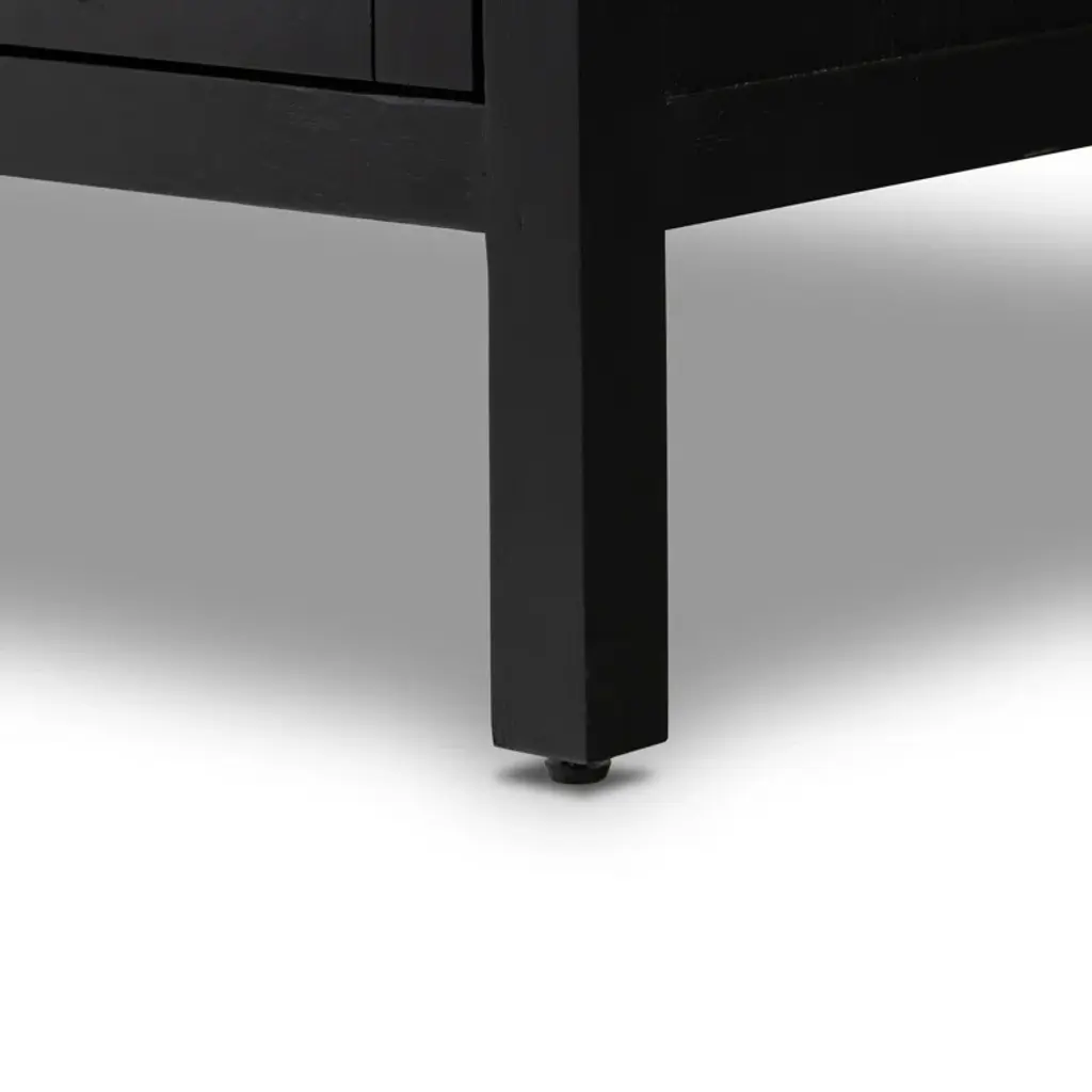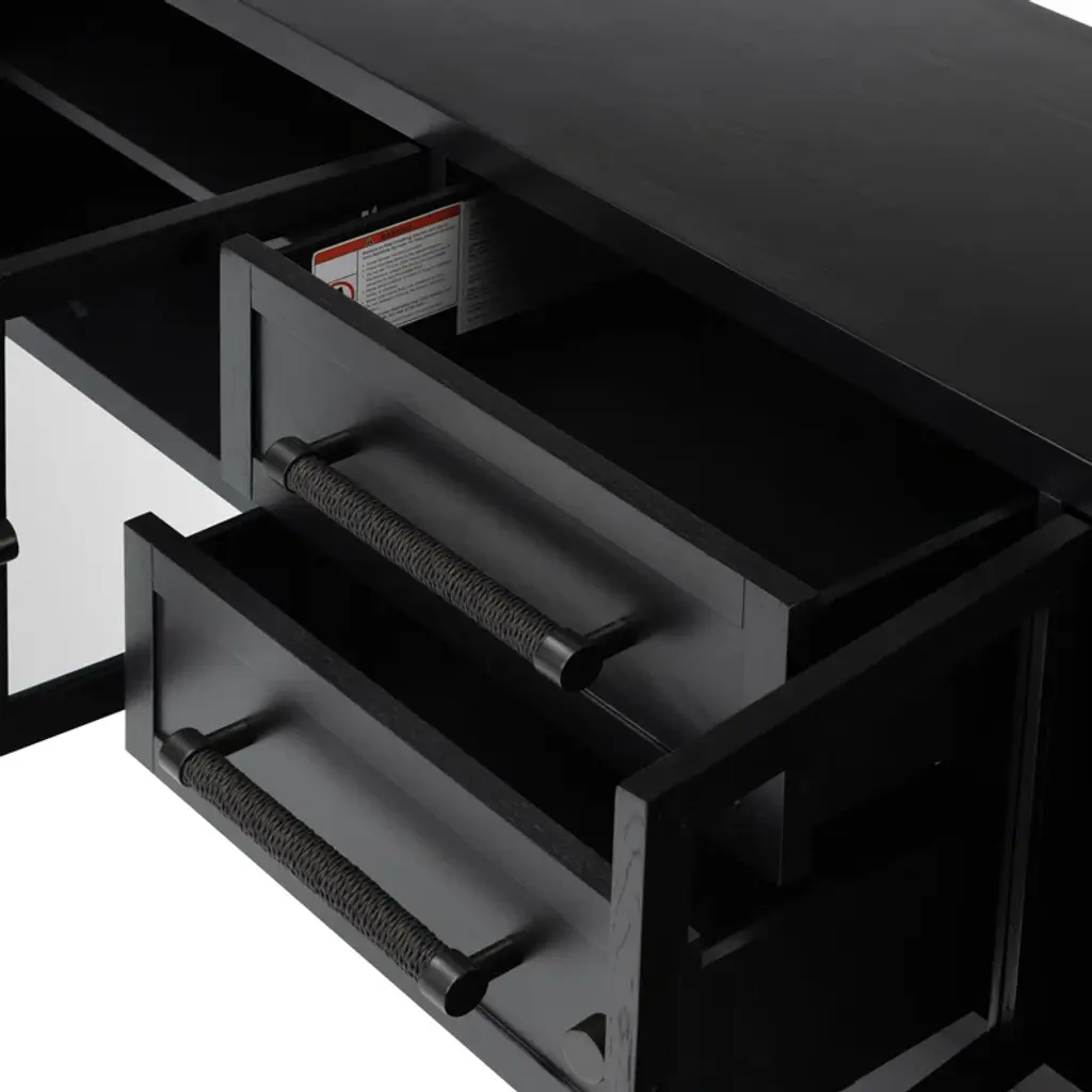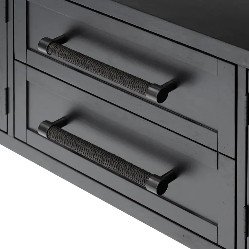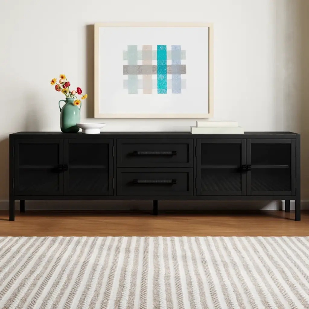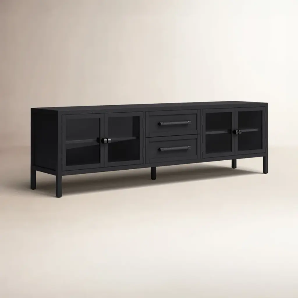 Enjoy modern industrial design with this solid wood media console. Its spacious design features both cabinets and drawers, ideal for storing media and electronics. A finished back allows for versatile placement in any room.