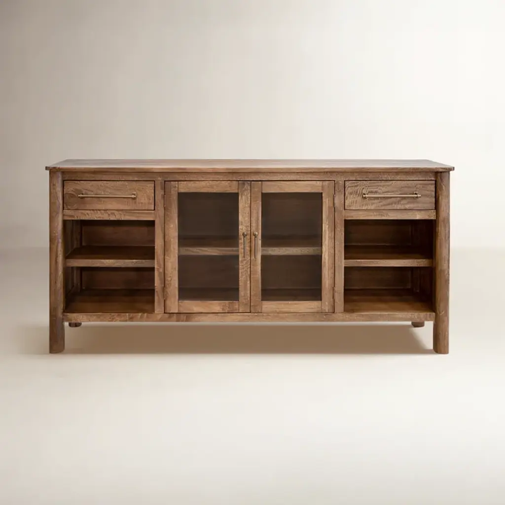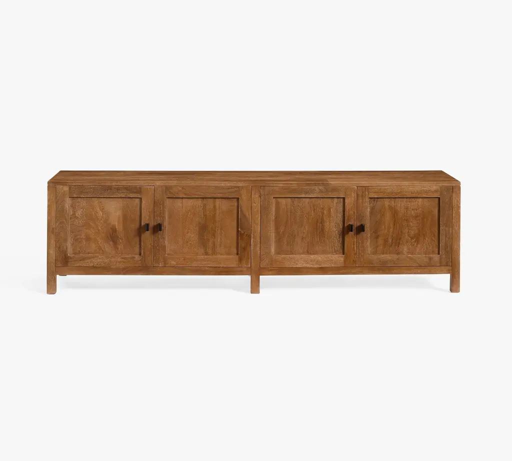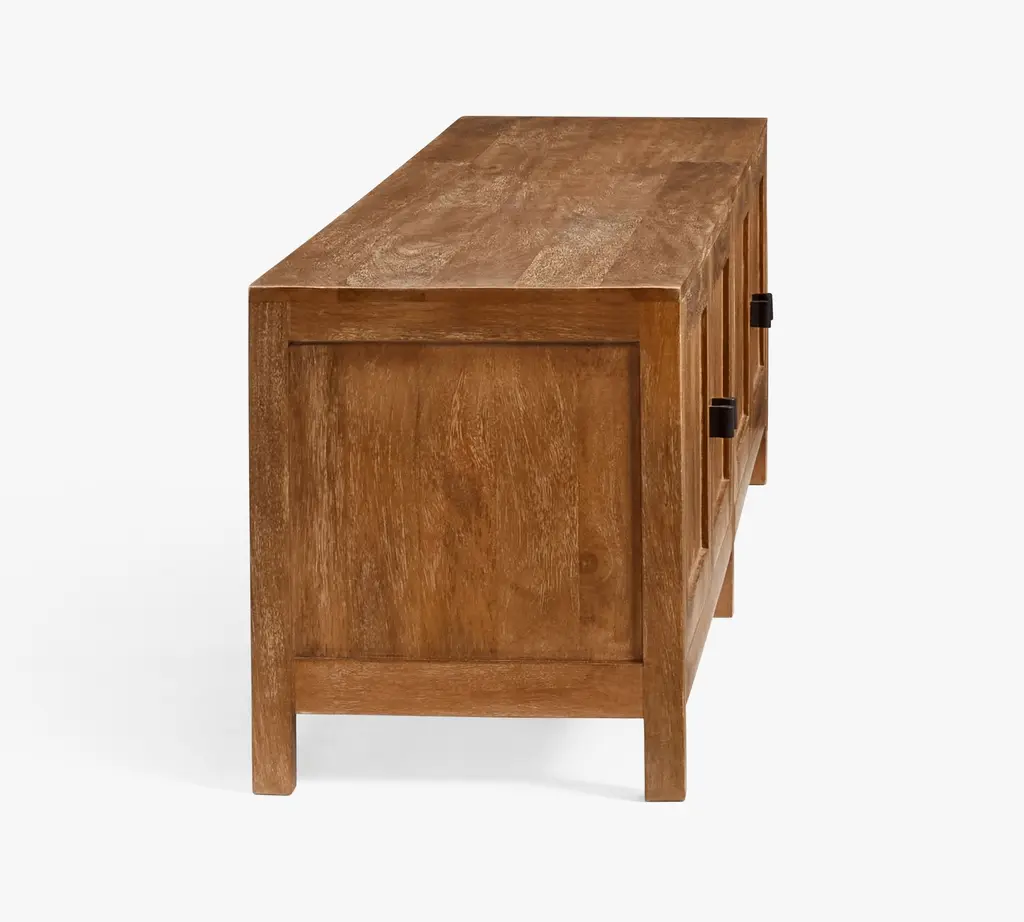 The beauty of the Nicasio Collection lies in the warm, natural tones of solid mango wood. Hand finished on all sides using a multistep process, it has a rich, mid-tone brown that pairs easily with other furniture in the room. Our media console features closed storage to neatly corral components and wrangle wires.