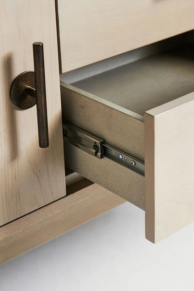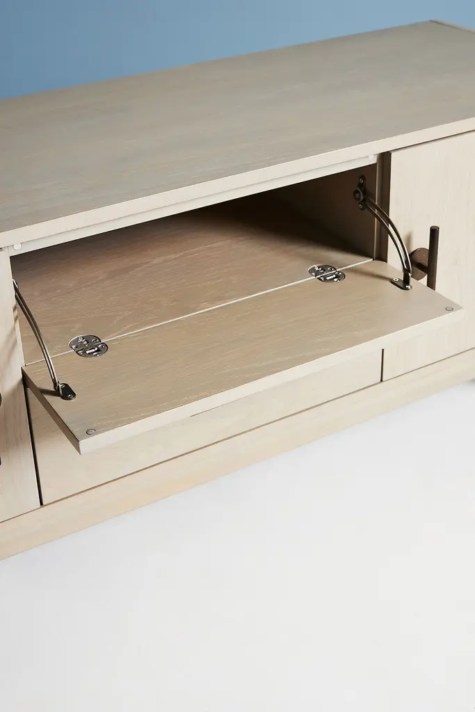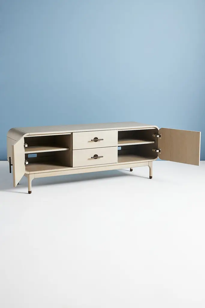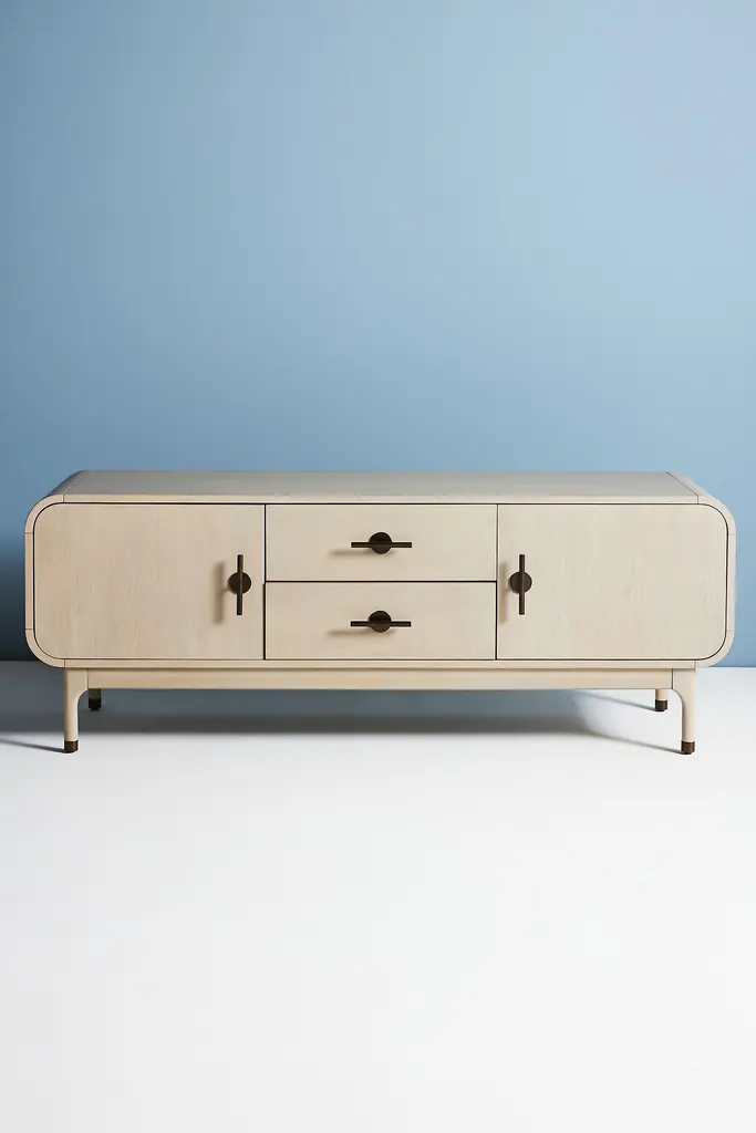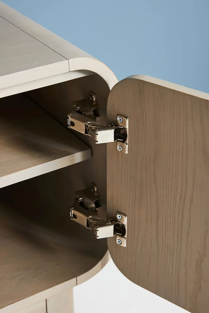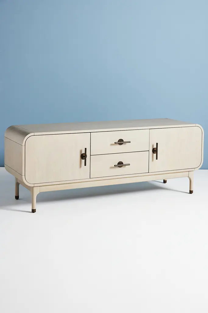 With rounded edges, a low-slung silhouette, and bold, brass-finished accents, this oak media console exudes by-gone character and a modern aesthetic at once. For ordering assistance and more, please contact us. For aesthetic advice and tips to help decorate your space, enjoy our complimentary home styling services.