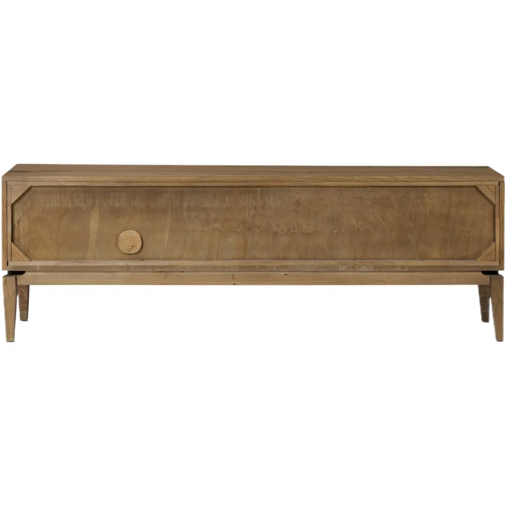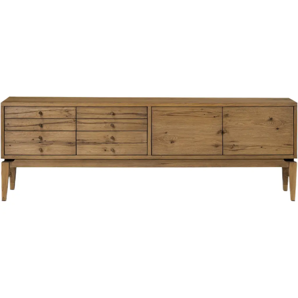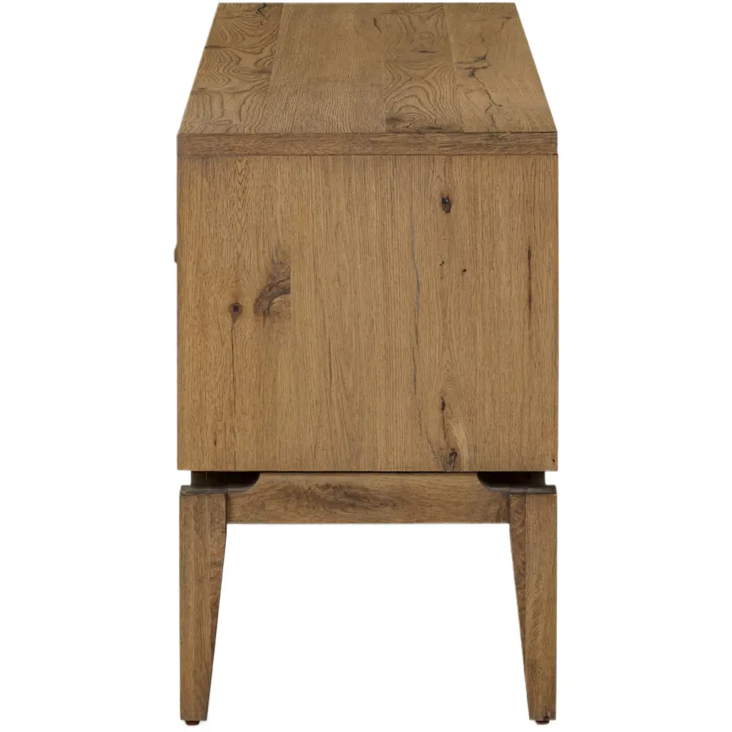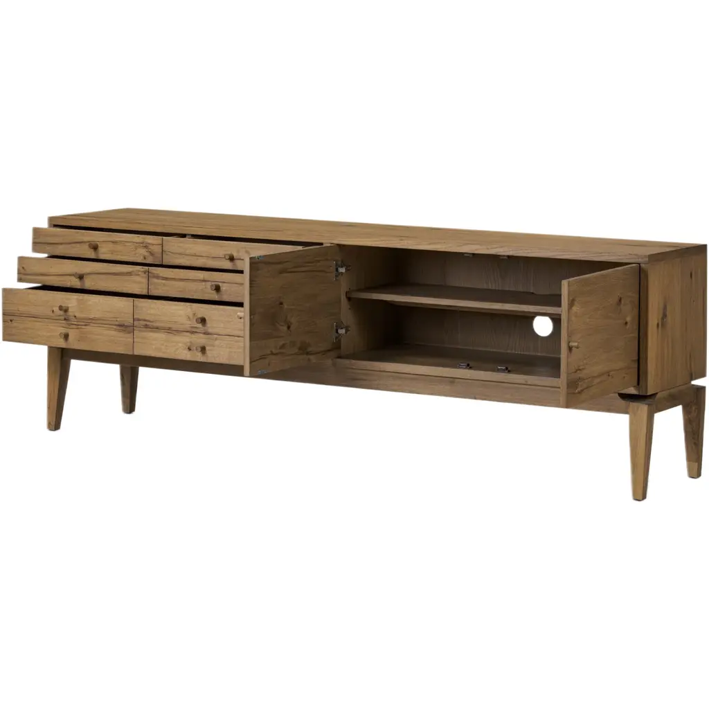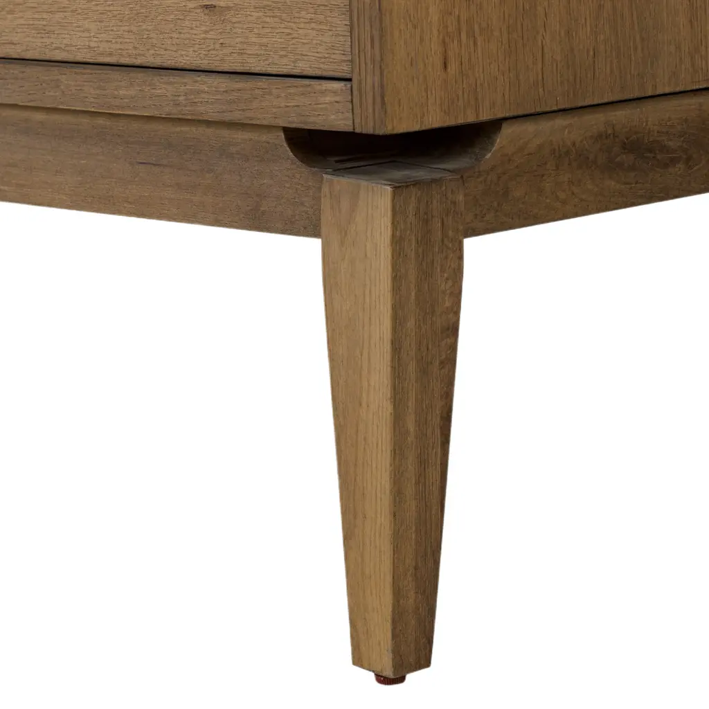 The Norewyn Media Console is a stunning piece that embodies New American inspiration with its light, natural oak veneer. This storage-driven console is elevated on tapered legs and features corner relief accents, offering an asymmetrical design that provides ample storage for all your media needs and more. Its warm, natural oak finish adds a touch of elegance and sophistication to any living space, making it a perfect addition to your home decor.