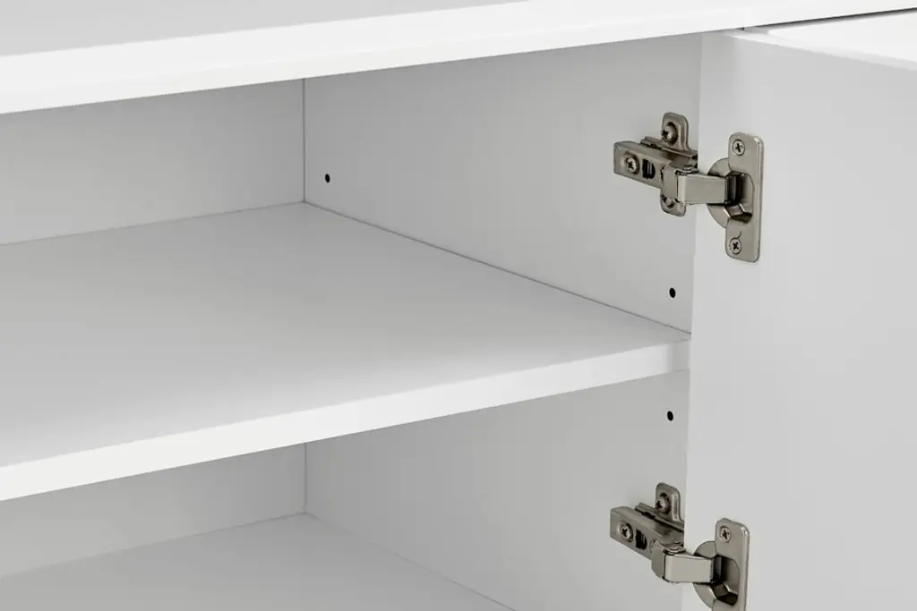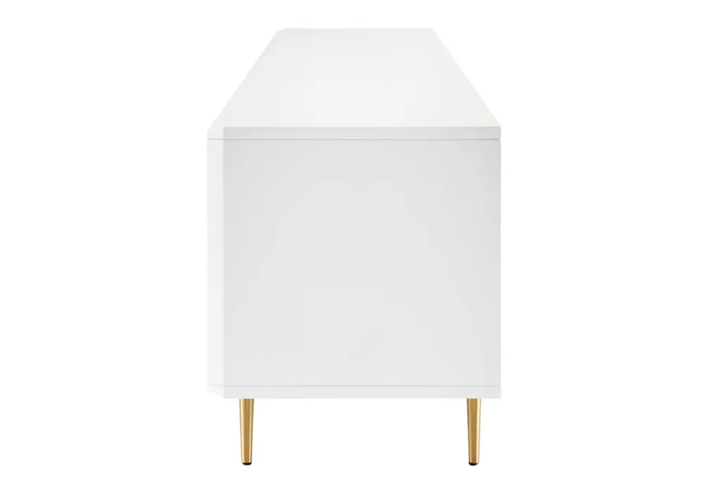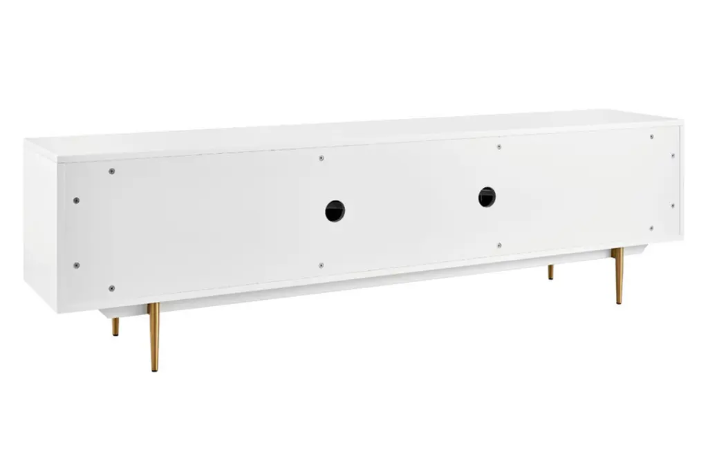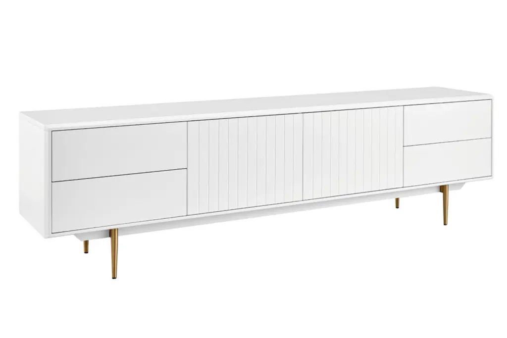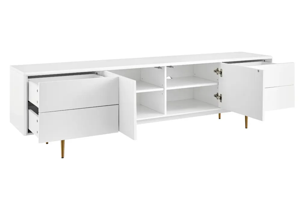 Introducing the Norna 79" Media Stand, a sleek and practical addition to your modern living space. Skillfully designed to seamlessly blend into minimalist or contemporary environments, this media stand combines style with functionality. Crafted with lacquered MDF, it exudes a sophisticated look while ensuring durability. The slatted doors feature a soft closing mechanism, adding a touch of elegance and convenience. With two spacious storage compartments and four drawers, this media stand offers ample space to organize and declutter your entertainment essentials. The steel components in brass plating not only provide structural support but also contribute to the stand's modern aesthetic. Elevate your media storage solution with the Norna 79" Media Stand and enjoy a harmonious fusion of style and practicality.