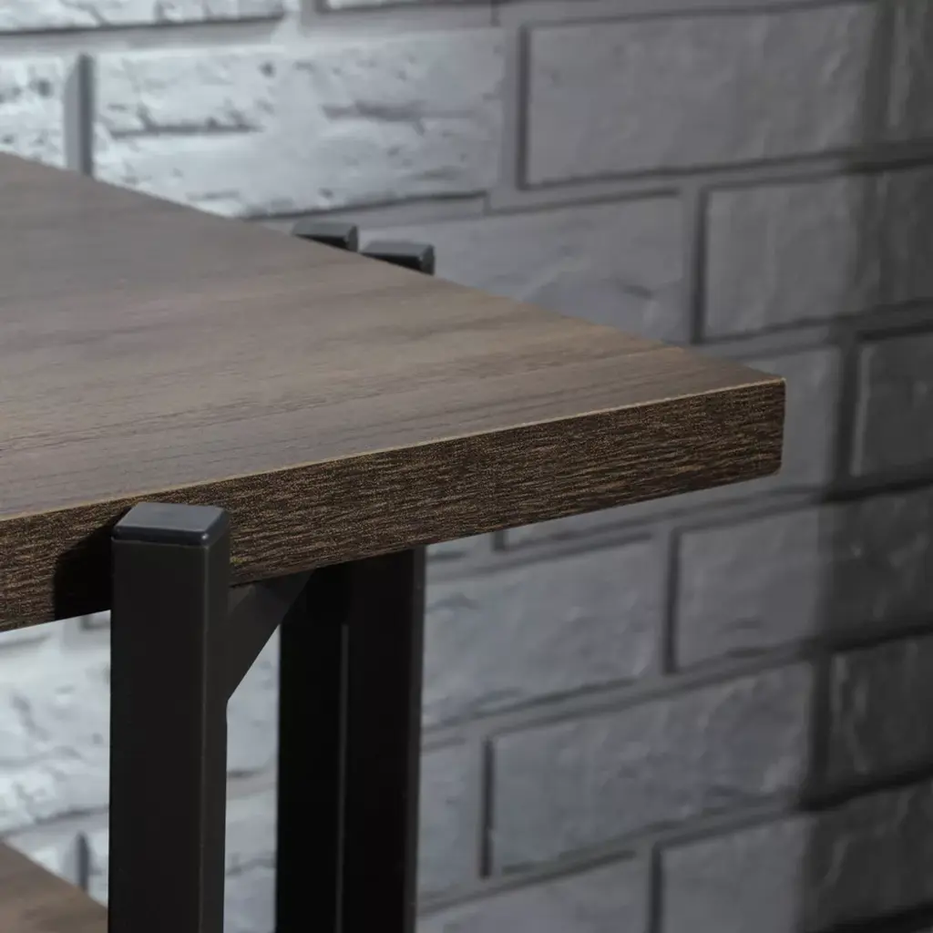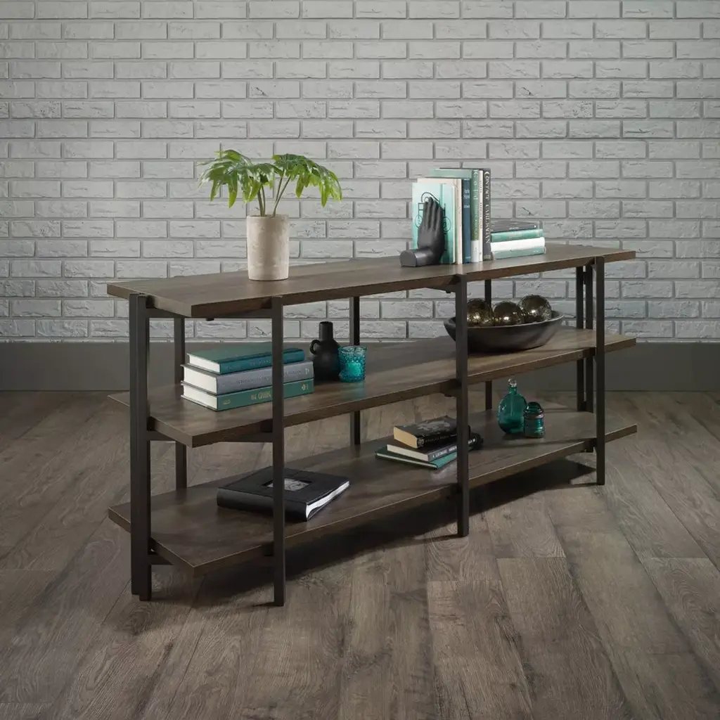 It's time for an entertainment upgrade! Give your home the update that it needs without having to sacrifice on style with this credenza from the North Avenue collection. This TV credenza accommodates up to a 55" TV, making it ideal for binge watching your favorite shows or playing endless hours of video games with your friends. This TV stand features sturdy 1" thick top and shelves. Already have a TV stand? Use its spacious top surface to display home décor items like decorative plants and photos of your family and friends. Its two lower shelves are ideal for your video and gaming equipment or storing items like organizing bins and your collection of movies. Its durable, black metal frame ensures that it's sturdy and built to last. This entertainment credenza is finished on all sides for versatile placement throughout any room in your home. Finished in Smoked Oak, this attractive credenza is just what your home is missing.