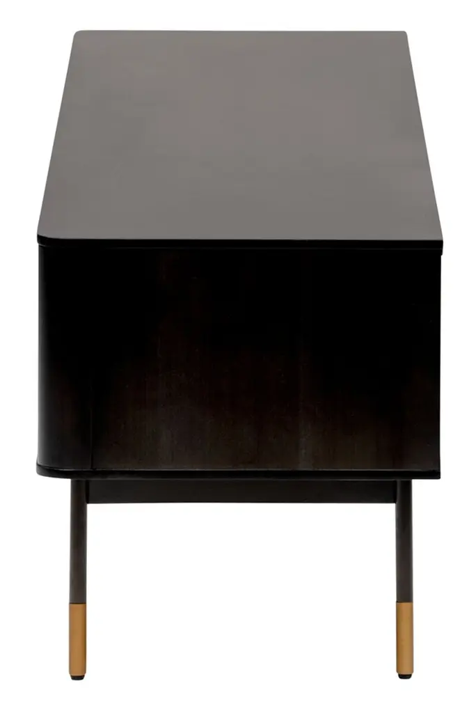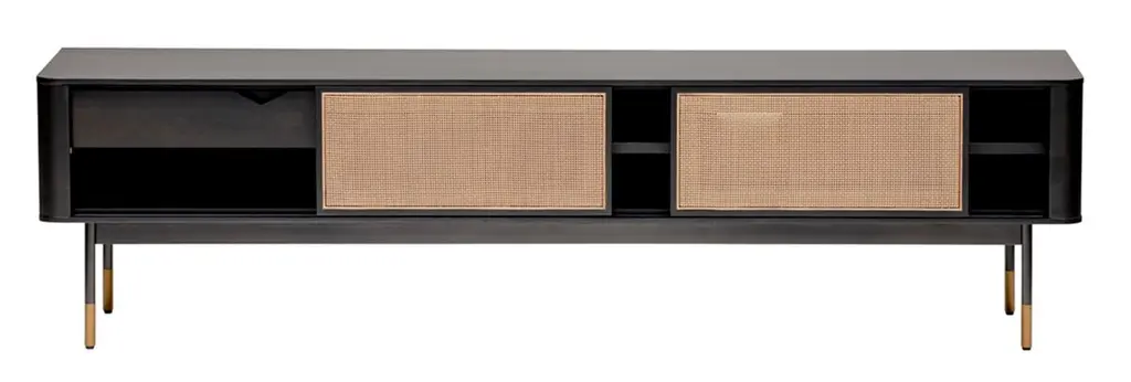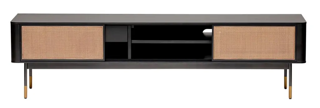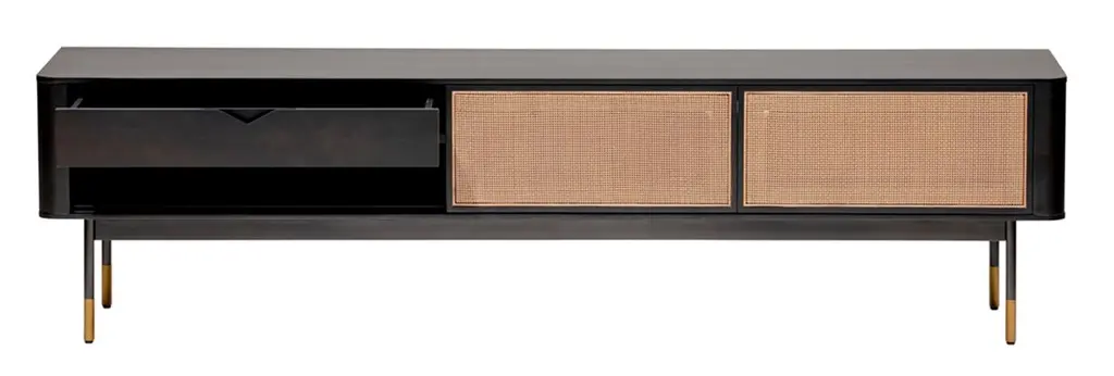 Fans of contemporary design will be drawn to the minimalist silhouette and the black-and-bronze steel legs of this media console. Those who gravitate toward natural materials will love the woven rattan fronts of the two sliding doors. And just about everyone will appreciate the generous storage provided by the two drawers and three shelves. A cutout in the back helps with cord control, while adjustable glides help protect your floors.
