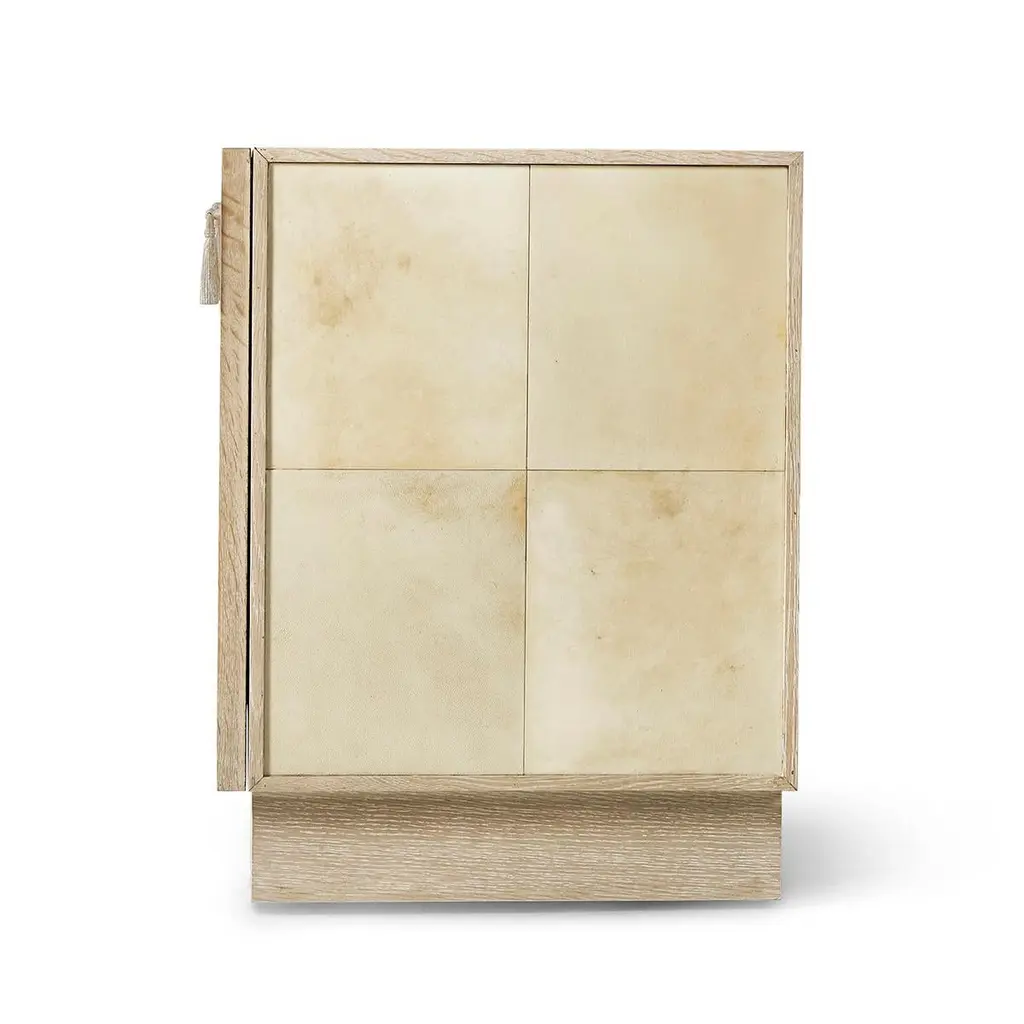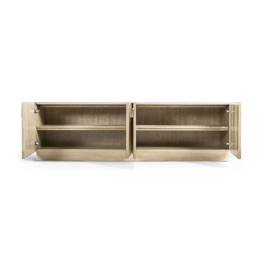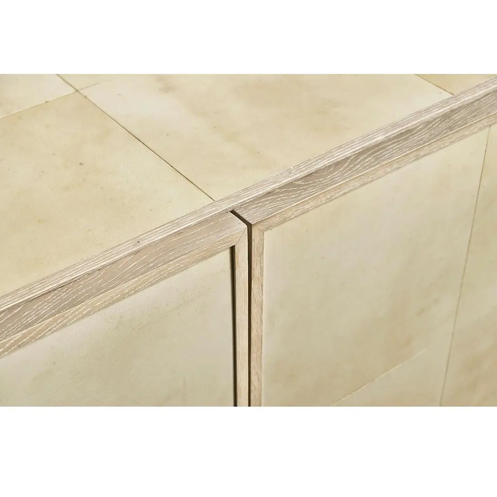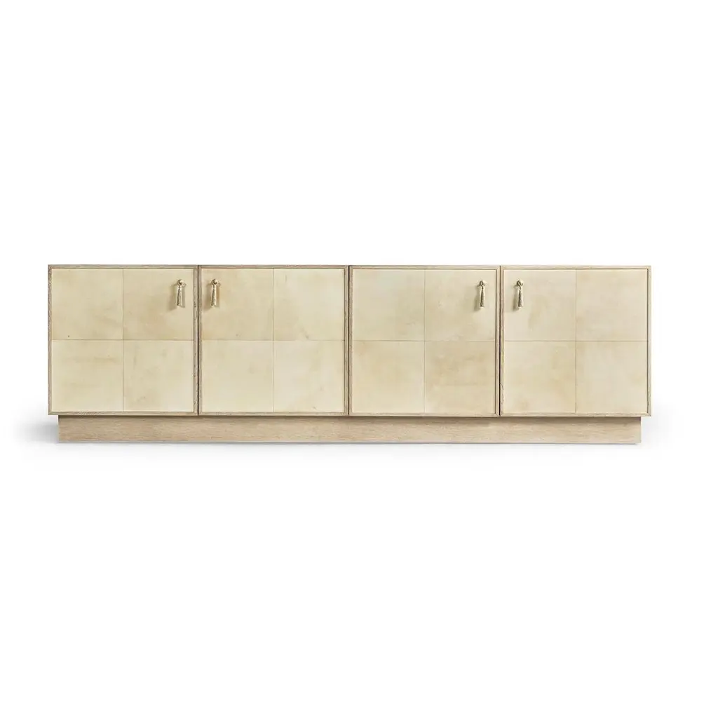 With its solid oak frame, this console marries durability with a sleek, contemporary silhouette, making it a timeless addition to any home.Each surface is a canvas of genuine, untreated parchment squares, sealed with a clear coat that ensures durability. This protective layer allows the natural beauty of the parchment to shine through, offering a unique aesthetic that’s both tactile and visually soothing.The console’s front features cast brass tassel door pulls, that harmonize with the wooden texture of the frame. Within its spacious interior lie two adjustable shelves, offering customizable storage solutions to accommodate all your entertainment essentials. The inset glass top not only serves as a protective layer for the delicate parchment but also provides a smooth surface that subtly reflects your room's lighting and decor.Dimensions: 88.13" W x 20" D x 26.13" H