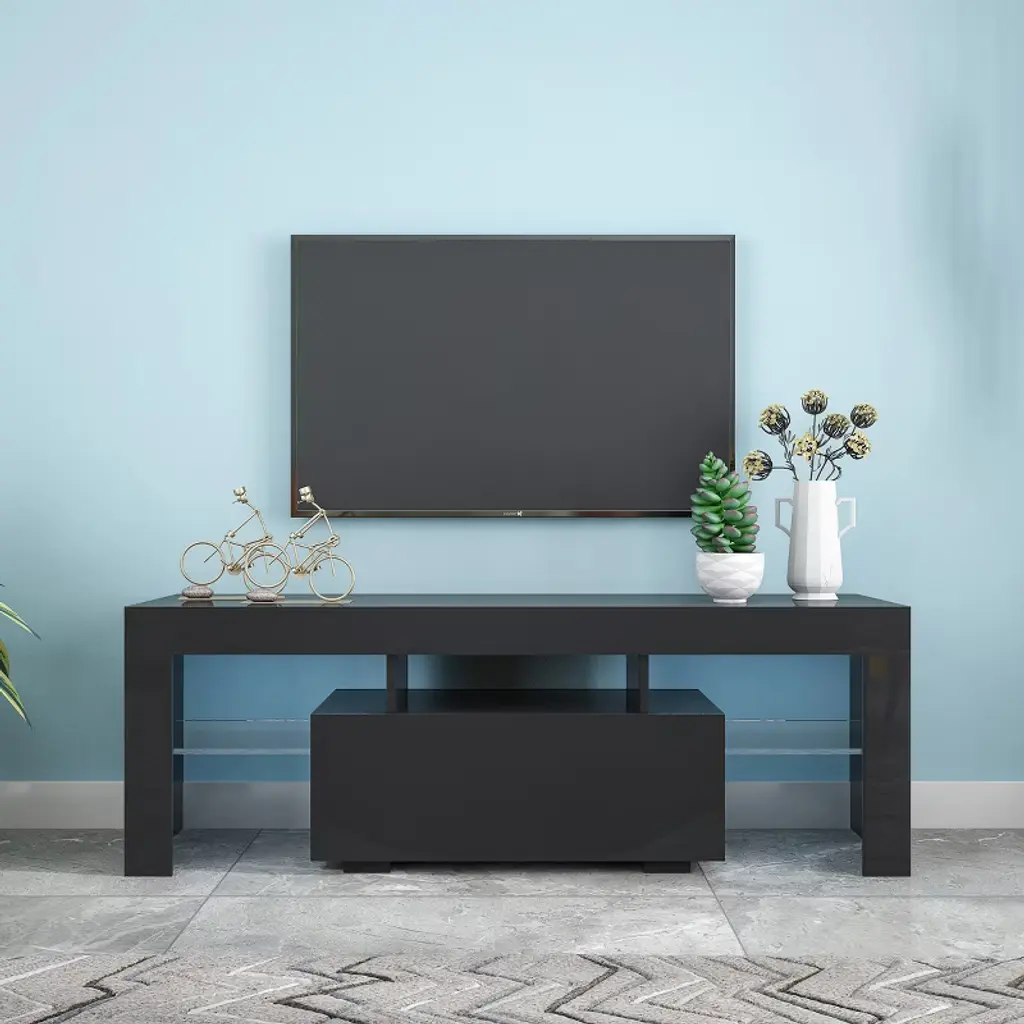 ORRD Black TV Stand with RGB LED Lights – a modern and stylish addition to any entertainment space. Designed for flat-screen TVs and gaming consoles, this sleek black TV cabinet features customizable RGB LED lighting, creating an immersive atmosphere. With ample storage compartments, it keeps media accessories organized, making it perfect for the lounge, living room, or bedroom.