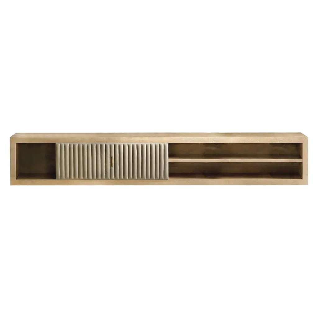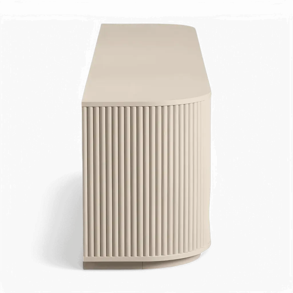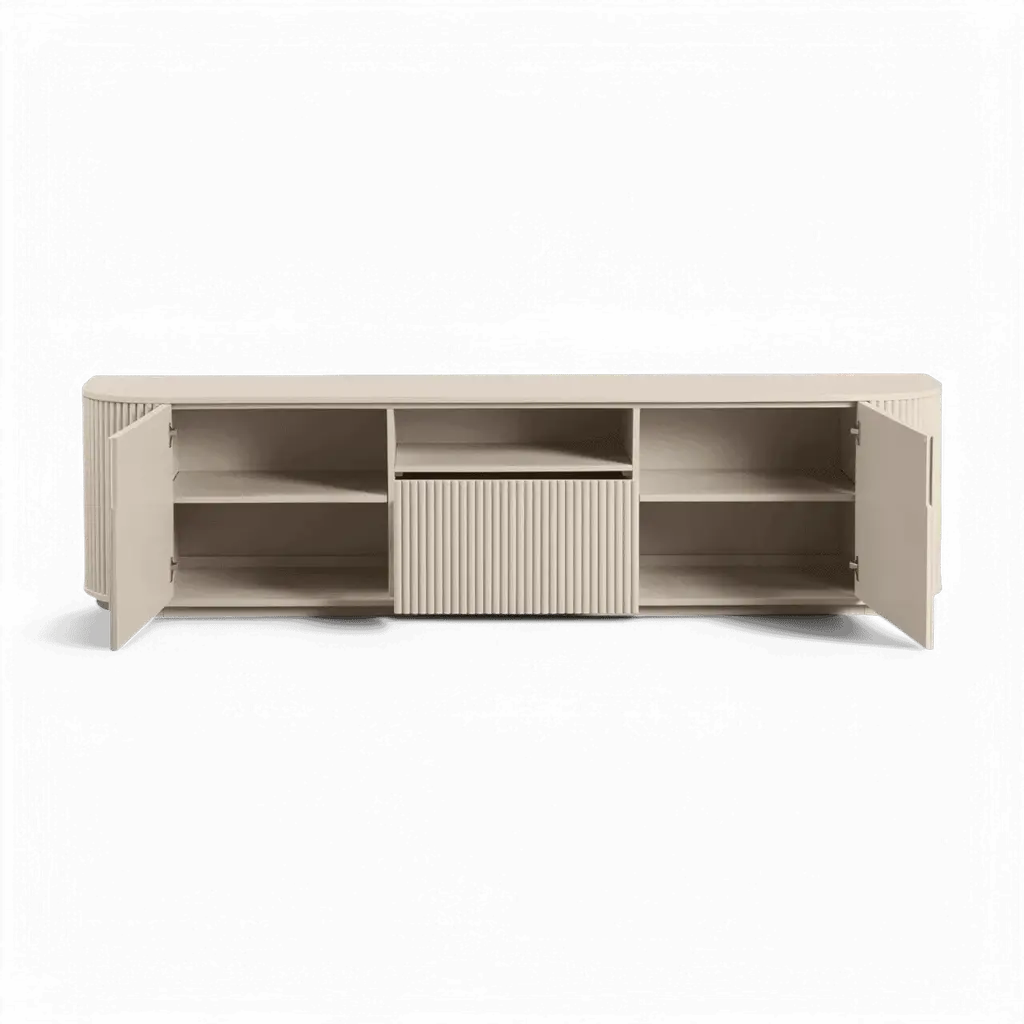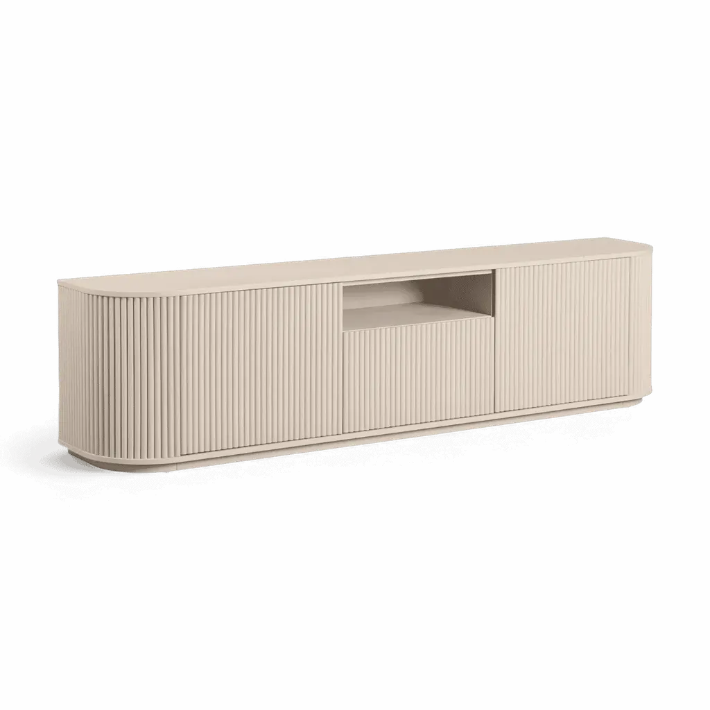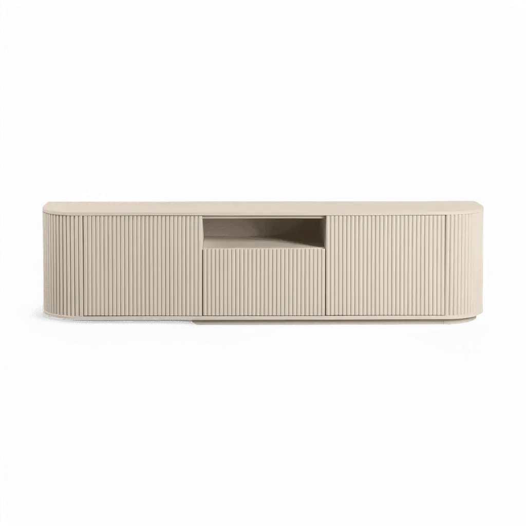 The Oxford TV Stand in Alabaster is a stylish and modern piece of furniture that beautifully combines functionality with contemporary design. Its rounded sides add a soft, inviting touch, while the front panels boast an eye-catching vertical wood slat design, making it a standout addition to any living space. Finished in a soft alabaster color, this TV stand exudes sophistication and pairs well with various decor styles. Featuring a center storage drawer, it offers convenient space for remote controls, game controllers, or other media accessories, keeping your living area organized. Additionally, the push-to-open side doors provide easy access to hidden storage, enhancing the stand's sleek appearance. With its blend of design and practicality, the Oxford TV Stand is perfect for elevating your entertainment experience while maintaining a clutter-free environment. Also available in Greige Oak and Black Wood.Push to Open Side Doors | Center Storage Drawer | Top Finish: MDF | Inner Frame: Rubberwood | Base Material: Rubberwood
