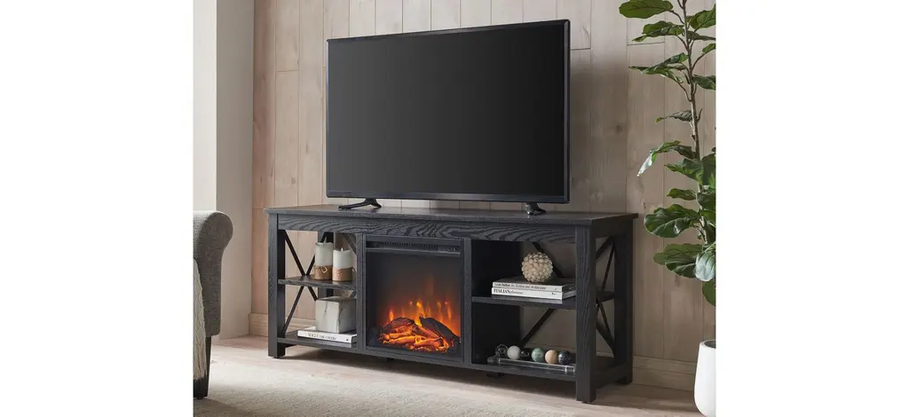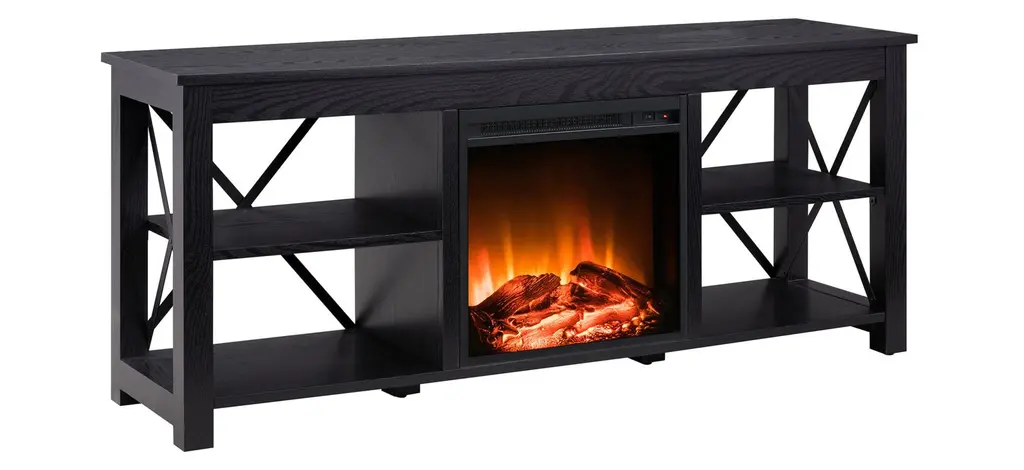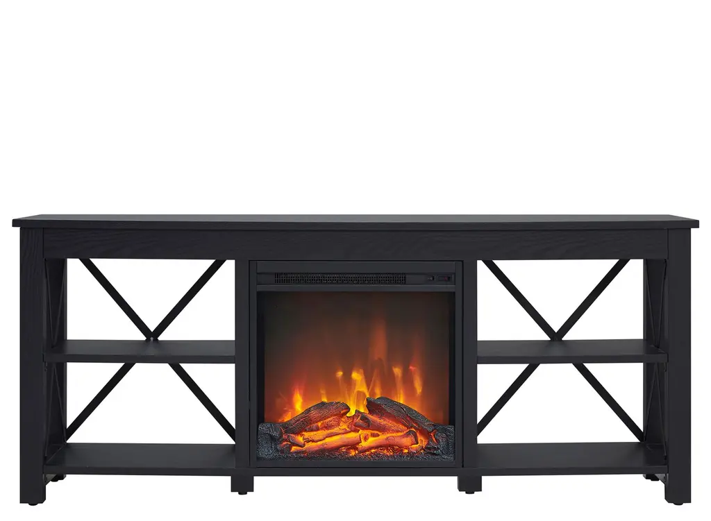 Strong geometric lines and an inset electric fireplace set this modern farmhouse-inspired Paisley TV Stand with Log Fireplace apart. Its X-shaped black metal accents offset the rich wood tone, creating a warm neutral color palette that will blend seamlessly into any design scheme. Stay warm and cozy while you take in the big game, a movie marathon, or that season finale everyone’s been talking about.
