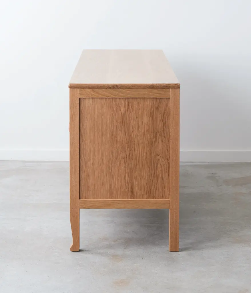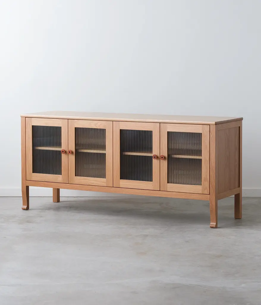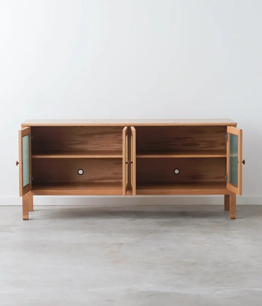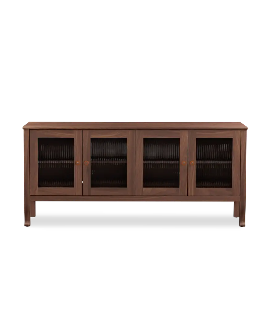 The Palmer media console features fluted glass door panels with leather pulls. There are two adjustable shelves and two cord cutouts in the back of the cabinet for cord management.