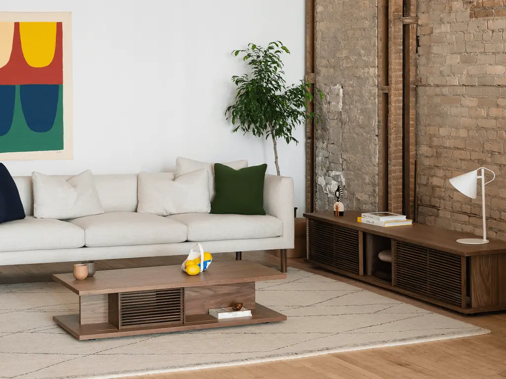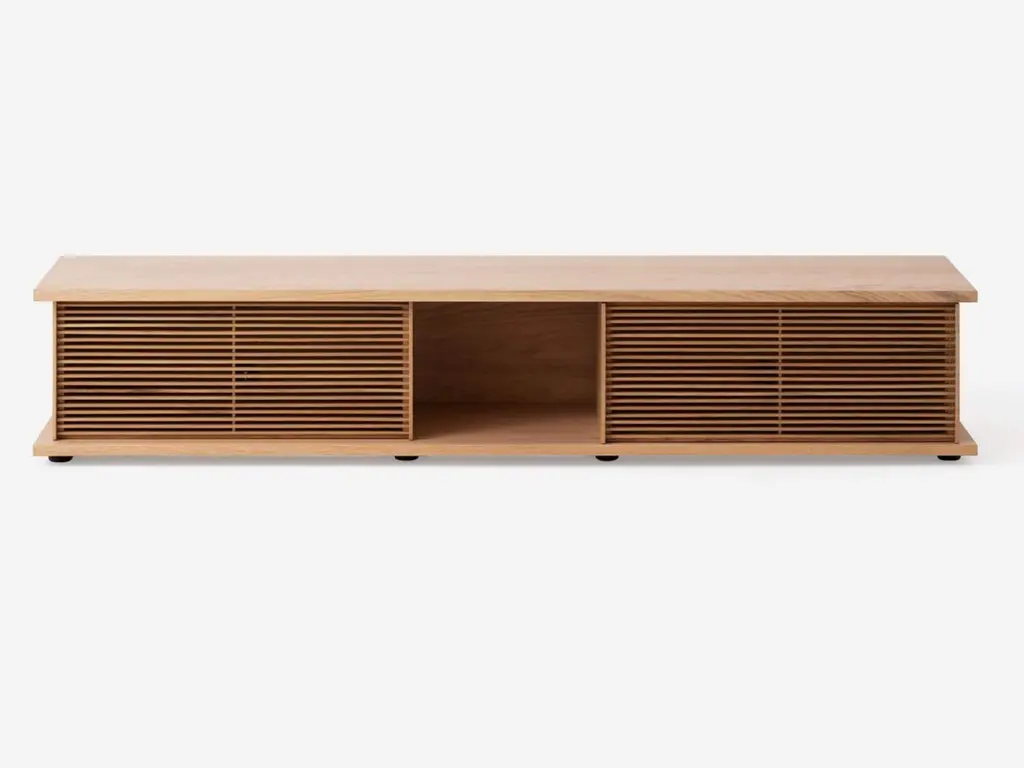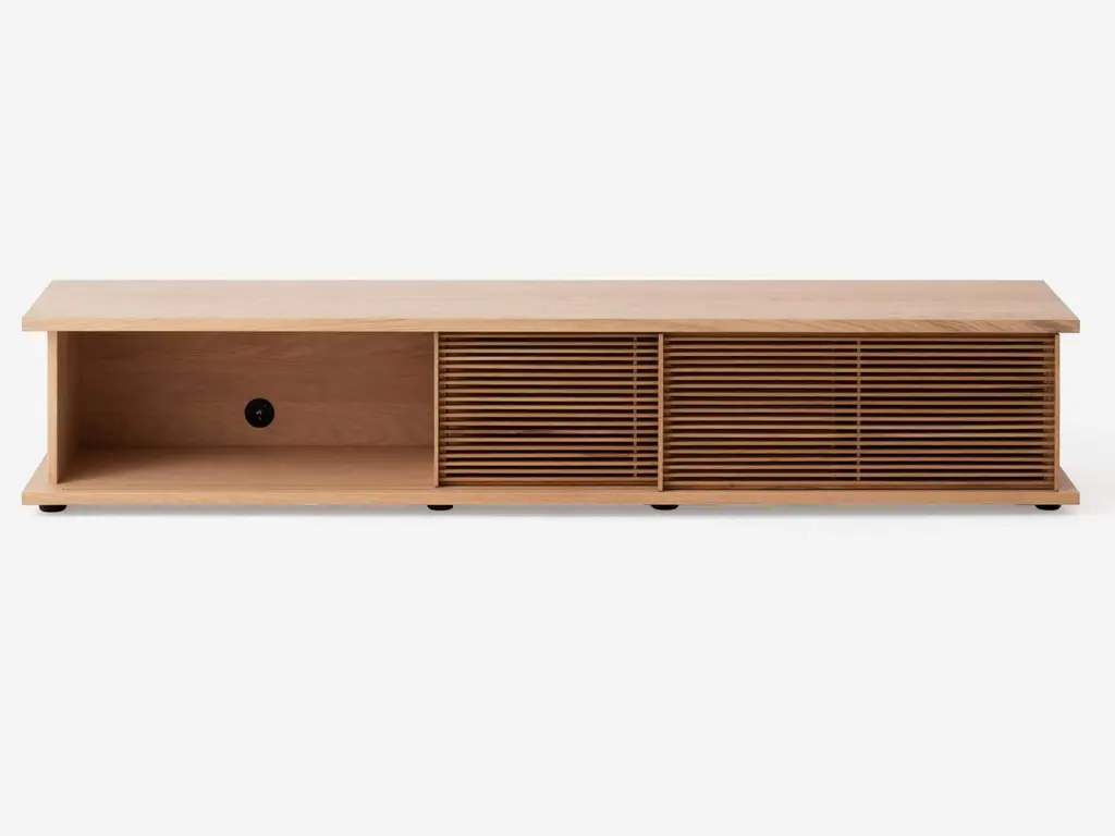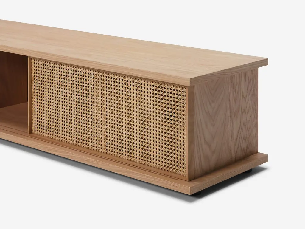 The Plank Media Unit, designed by Tom Chung for EQ3, is a stylish and functional piece of furniture that can be customized to match your individual style. The walnut, oak, or black oak veneer pieces are available with fabric, wood-slat or cane panel doors, which allow you to add colour and texture to your home. The Plank collection is perfect for anyone who wants furniture that is both unique and functional.Large doors are sold in a pack of two, in either fabric, slatted or cane optionsPlease note: Optional fabric components on this product are custom made and subject to EQ3 manufacturing times (currently 8-12 weeks) which may extend the noted delivery time.