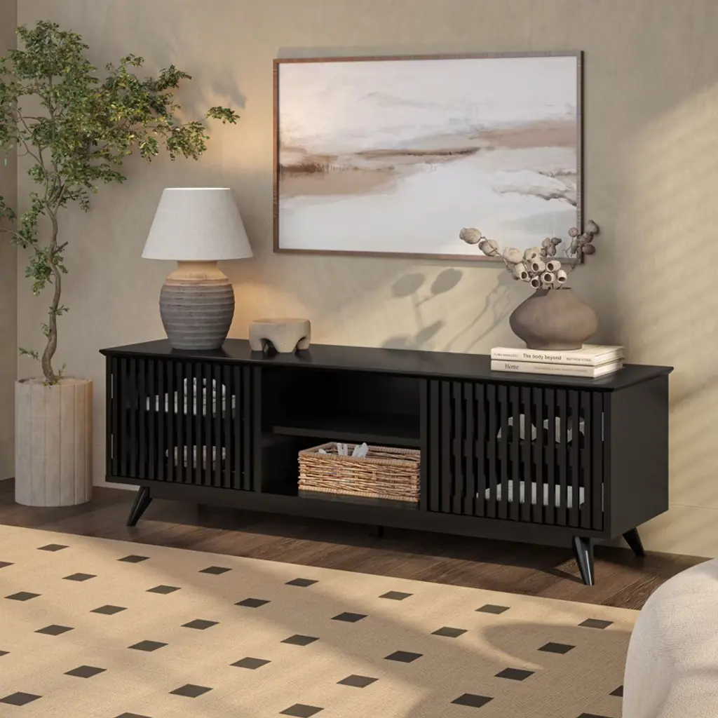 Plank+beam 59" Mid Century Modern Solid Wood Tv Stand With 2 Doors, Black