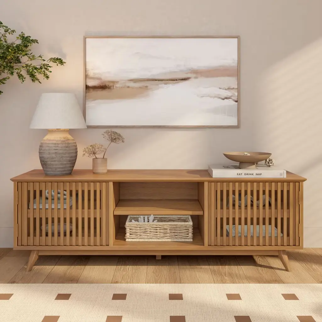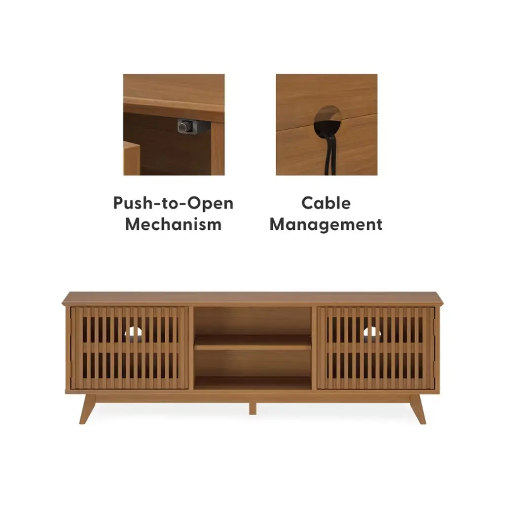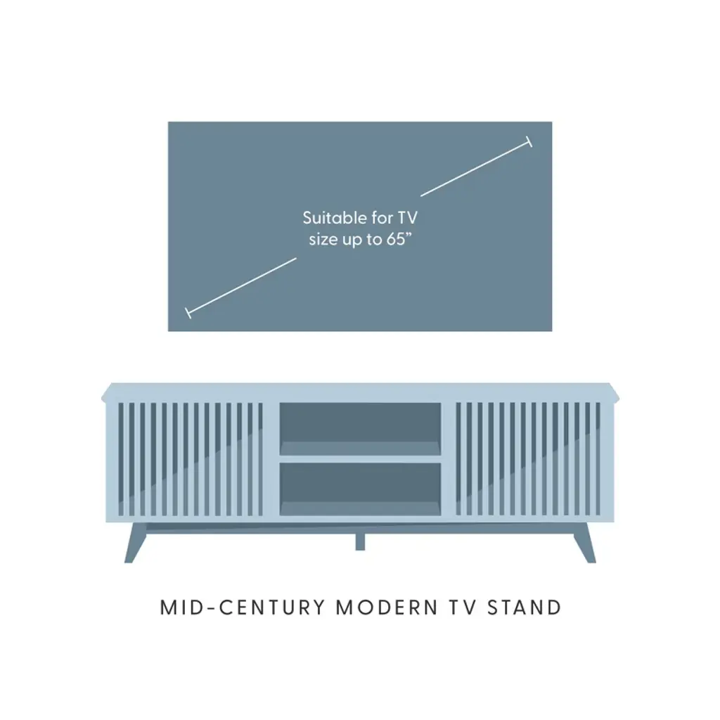 The Mid-Century Modern TV Stand from Plank+Beam adds both storage and style to any entertaining space. Crafted with knot-free, solid pine wood and engineered wood back panels, this media console table is built to withstand the wear and tear of everyday life. Its durable construction, complemented by clean, low-VOC finishes, ensures it’s both stylish and healthy for your space. Designed to fit TVs up to 65 inches, this mid-century TV stand makes the perfect centerpiece for any living room. Its two slatted doors not only make a style statement for your space but hide spacious storage for all your essentials. Its three built-in shelves adjust to three different heights, accommodating your storage needs and preferences. Its open middle shelf is the perfect place to show off all your favorite décor. This solid wood TV stand conveniently features cord cutouts for your cable box, gaming console, and more. Whether you're displaying decorative items, storing cable boxes and gaming consoles, or simply accentuating your living space, this mid-century style TV stand is designed to enhance the beauty and functionality of your home. Embrace style, durability, and versatility with the Mid-Century Modern TV Stand from Plank+Beam.