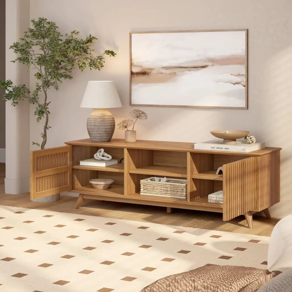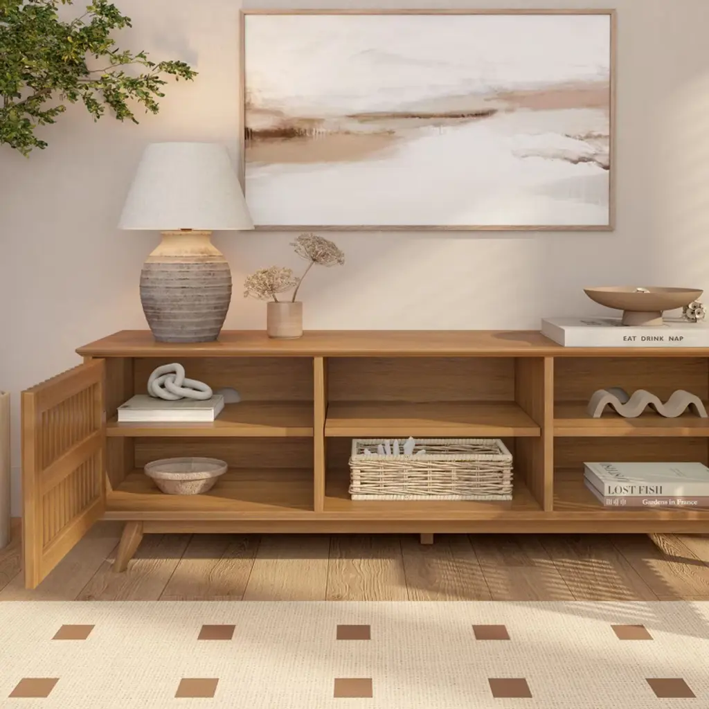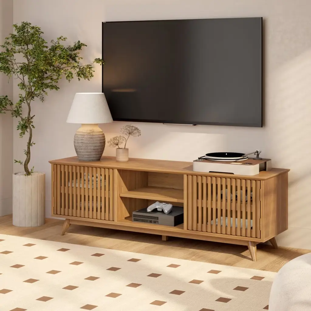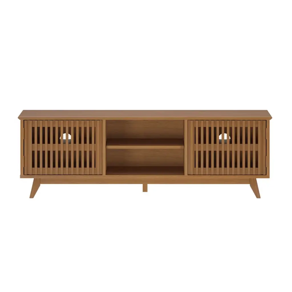 The Mid-Century Modern TV Stand from Plank+Beam adds both storage and style to any entertaining space. Crafted with knot-free, solid pine wood and engineered wood back panels, this media console table is built to withstand the wear and tear of everyday life. Its durable construction, complemented by clean, low-VOC finishes, ensures it’s both stylish and healthy for your space. Designed to fit TVs up to 65 inches, this mid-century TV stand makes the perfect centerpiece for any living room. Its two slatted doors not only make a style statement for your space but hide spacious storage for all your essentials. Its three built-in shelves adjust to three different heights, accommodating your storage needs and preferences. Its open middle shelf is the perfect place to show off all your favorite décor. This solid wood TV stand conveniently features cord cutouts for your cable box, gaming console, and more. Whether you're displaying decorative items, storing cable boxes and gaming consoles, or simply accentuating your living space, this mid-century style TV stand is designed to enhance the beauty and functionality of your home. Embrace style, durability, and versatility with the Mid-Century Modern TV Stand from Plank+Beam.